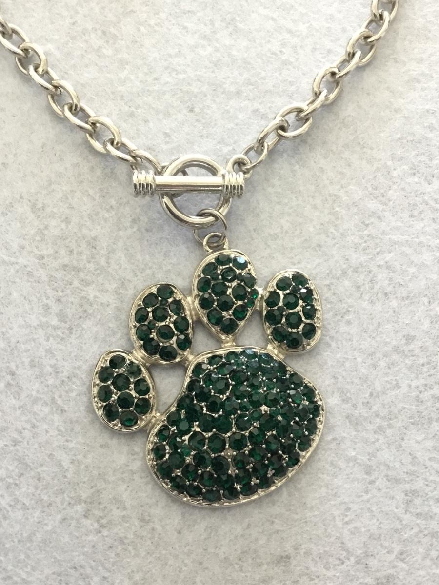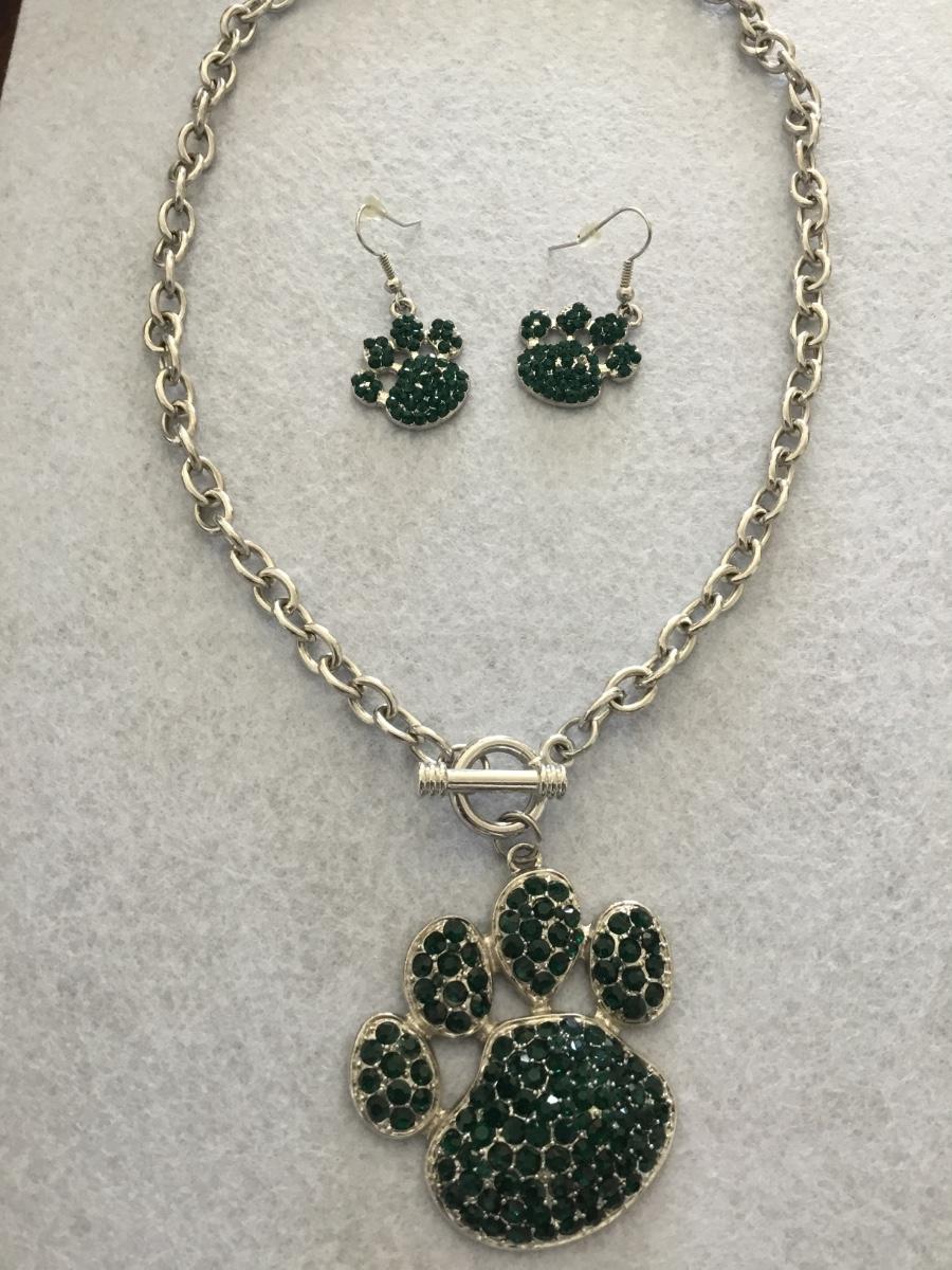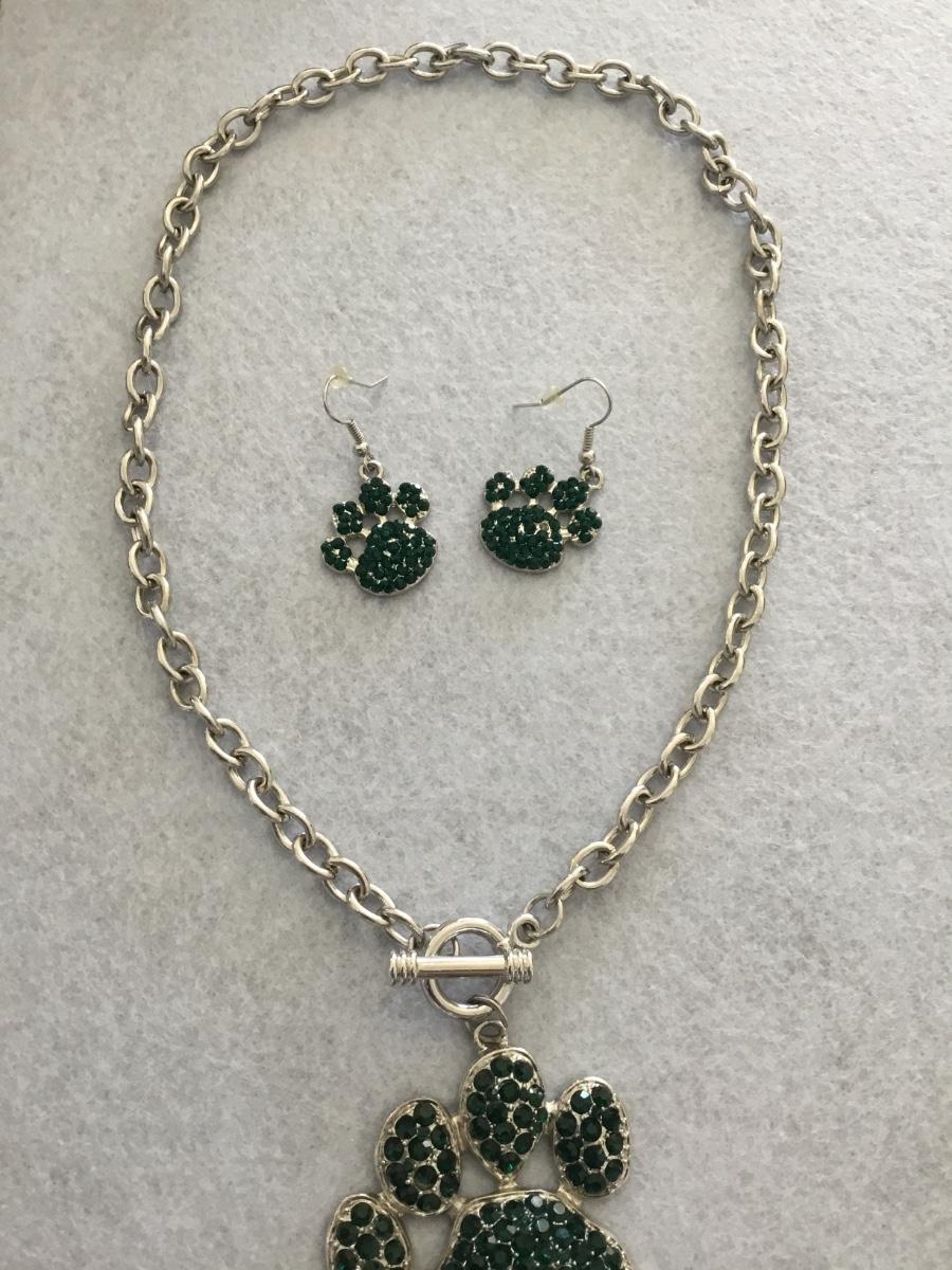 Green rhinestone puppy, feet, Silver tone toggle necklace and matching earrings