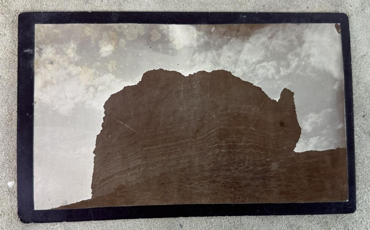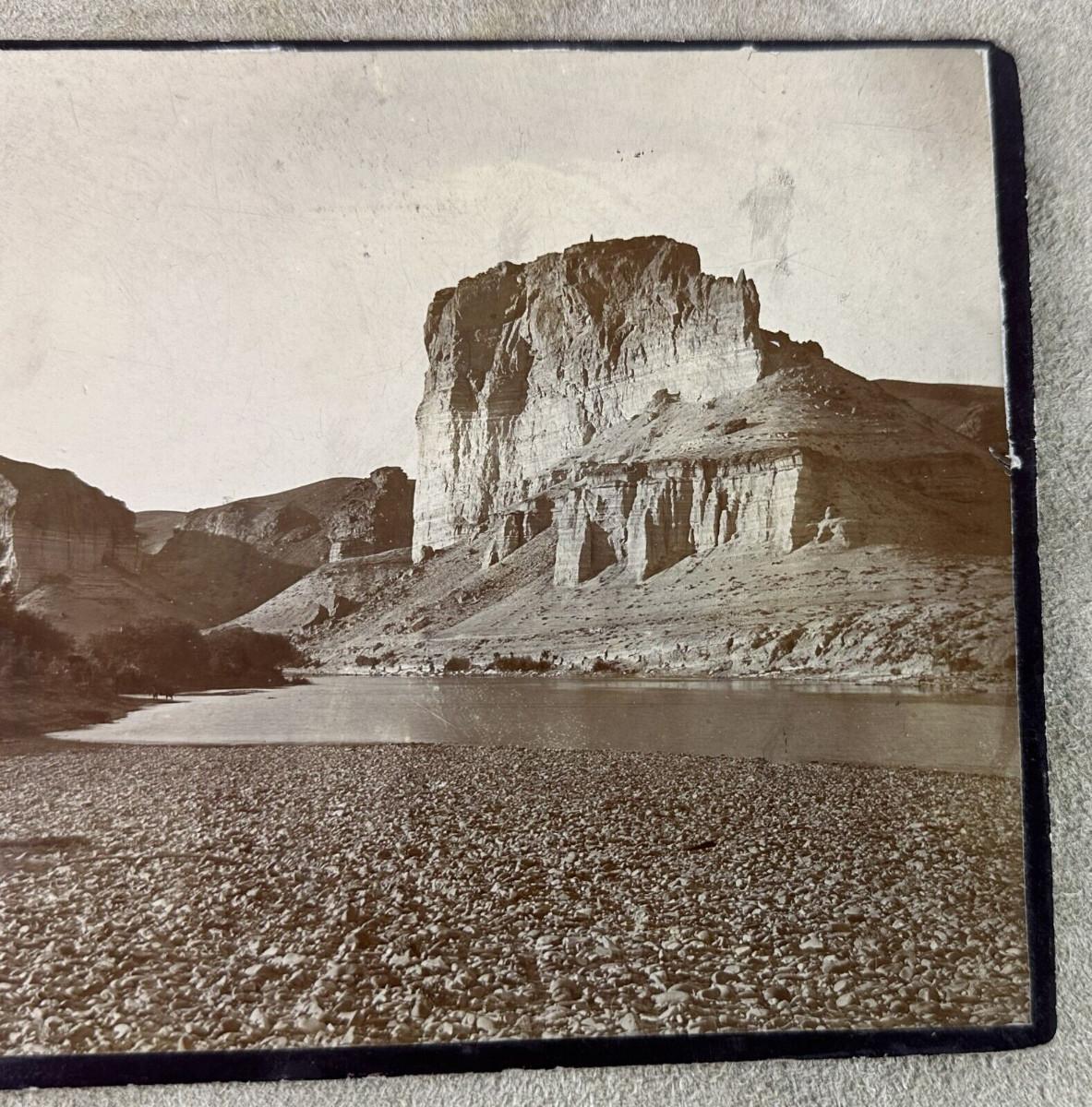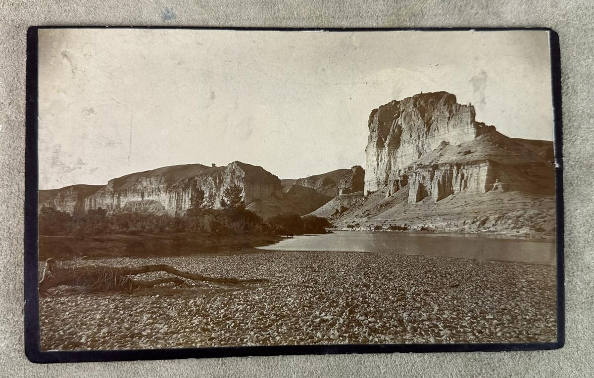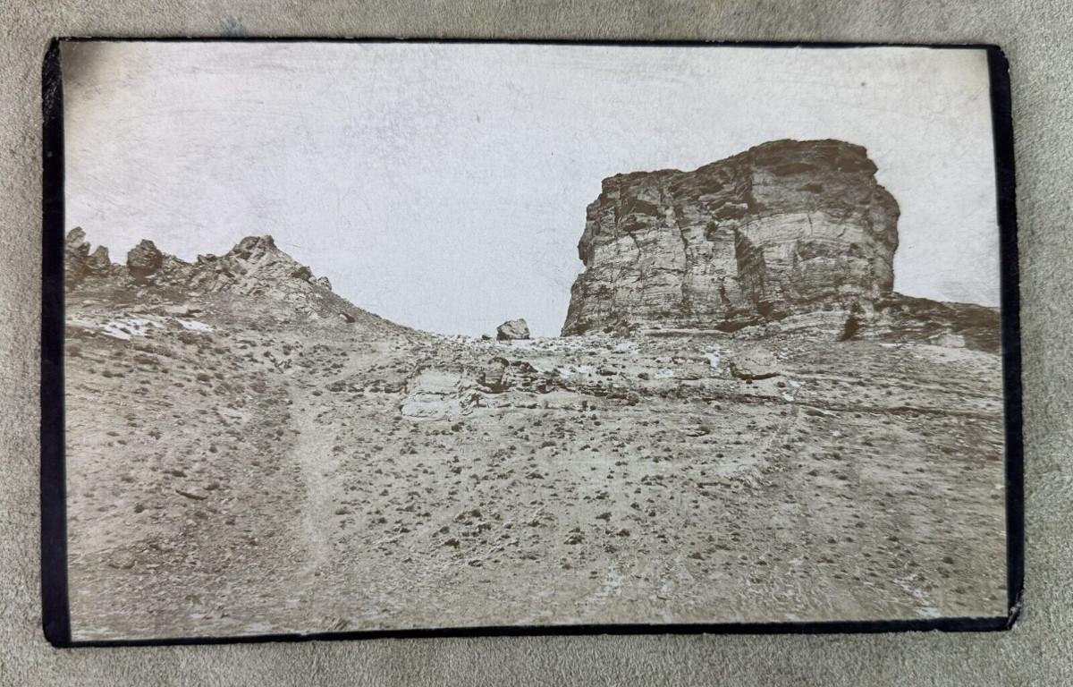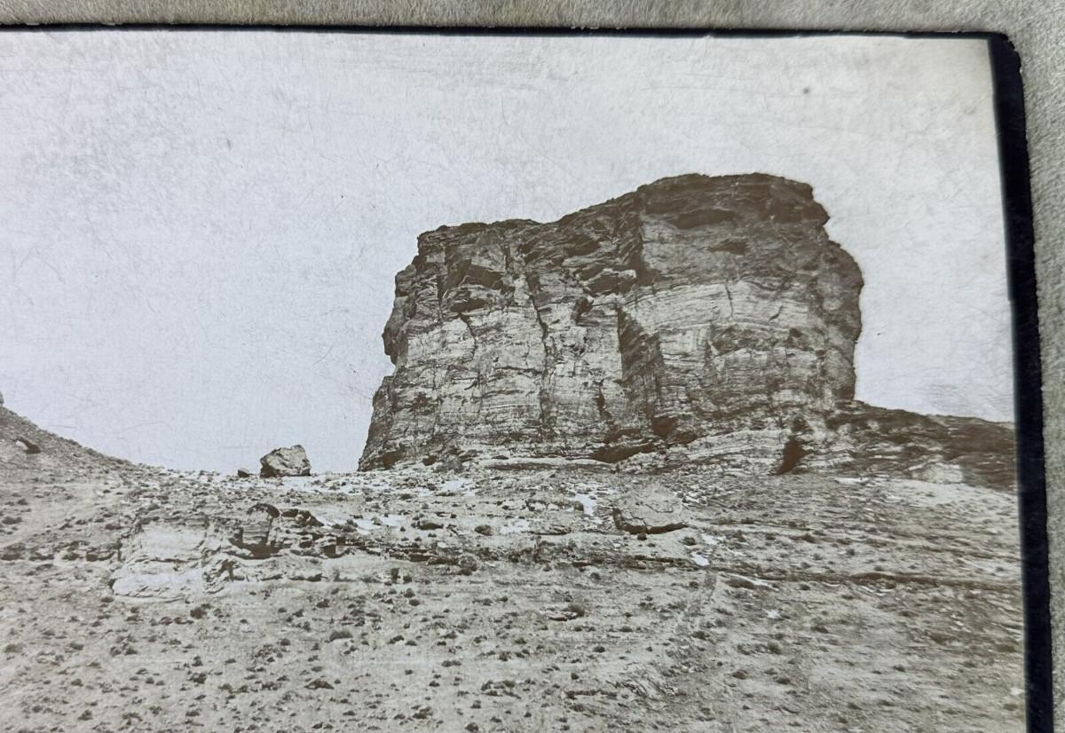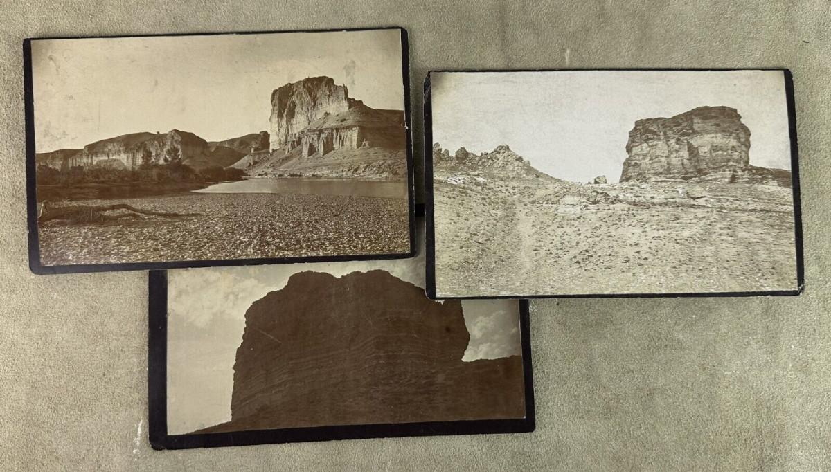 Mounted on more of a boudoir card size 8 3/8 x 5 3/16" here are three old albumen print photos of Green River, Wyoming circa 1880s I believe...Unhappily uncredited so I can only guess at the pioneer photographer who took these shots of what I believe are Tollgate Rock and the Palisades...Teapot Rock and Castle Rock...the black and white images are 8 x 5".