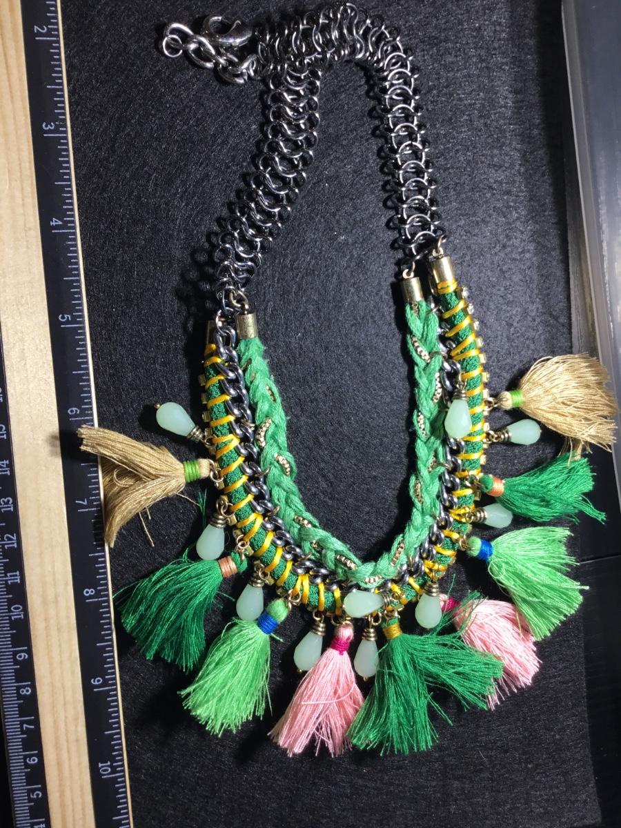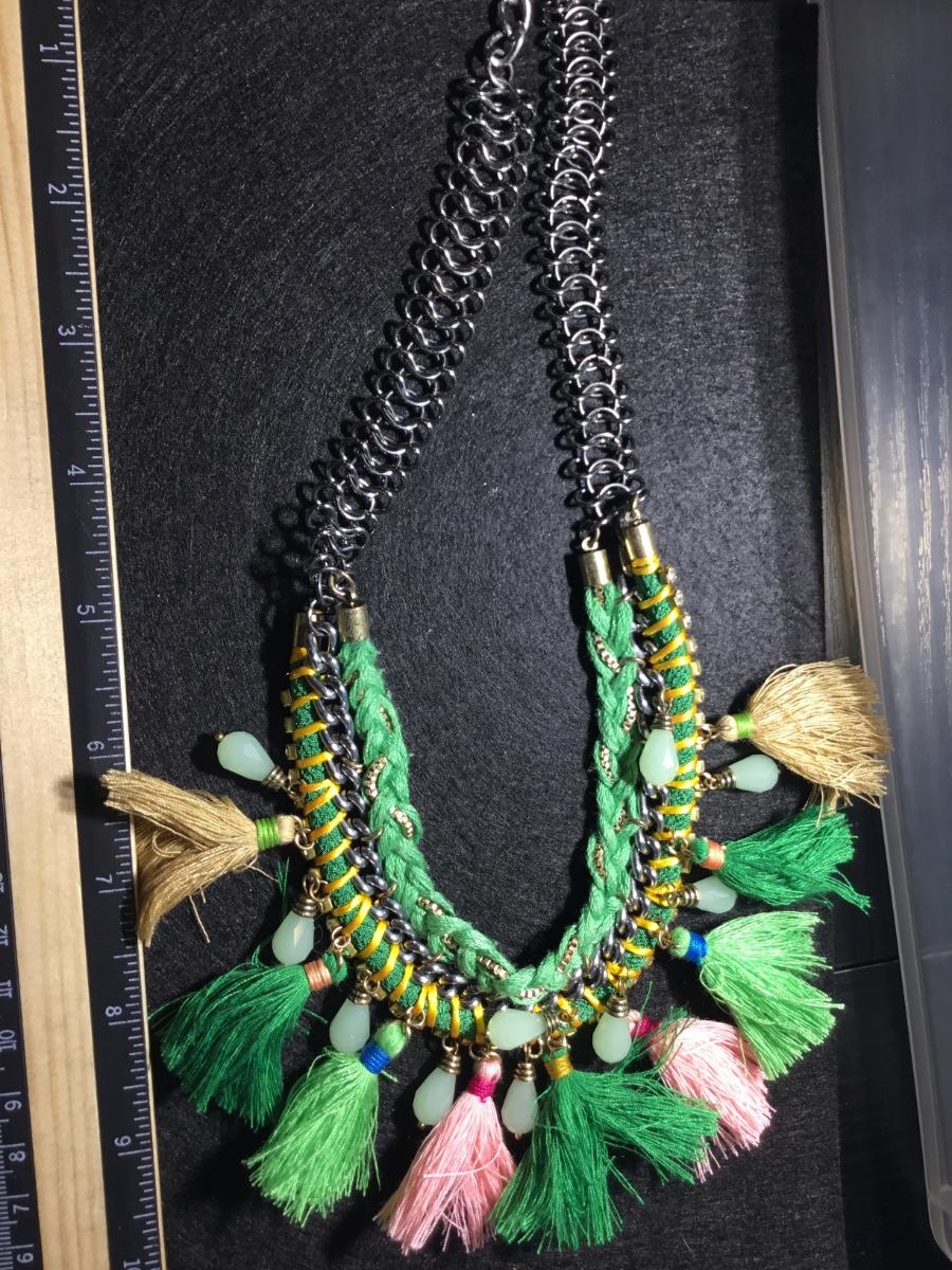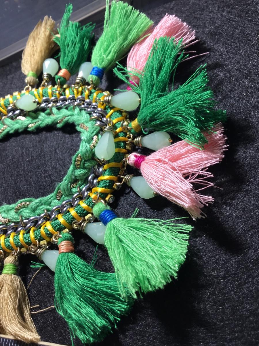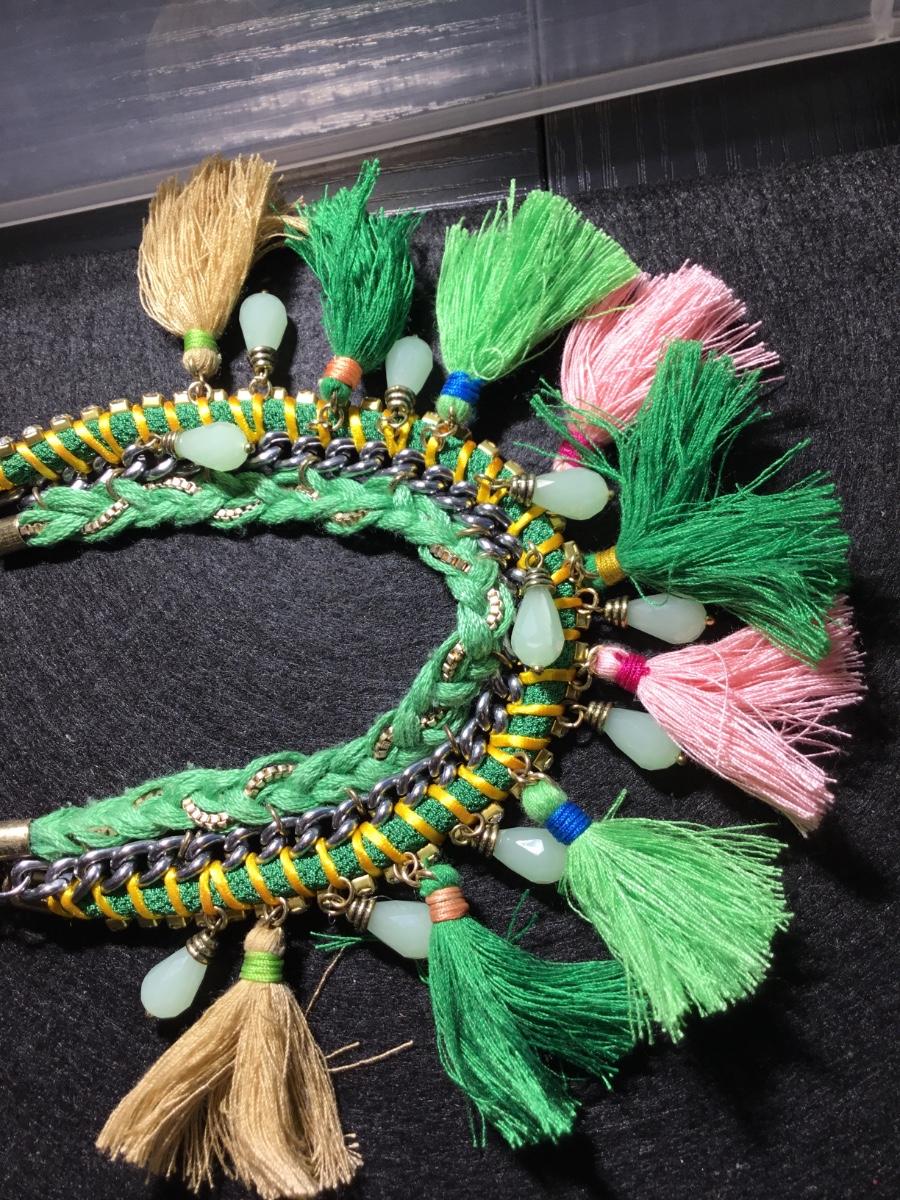 Green rope and yellow with pink colorful multicolor tassel statement collar necklace