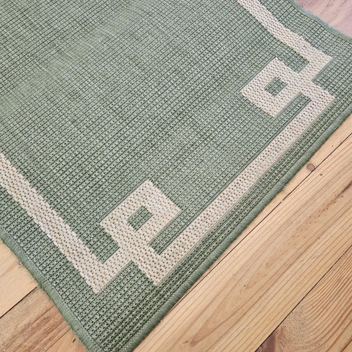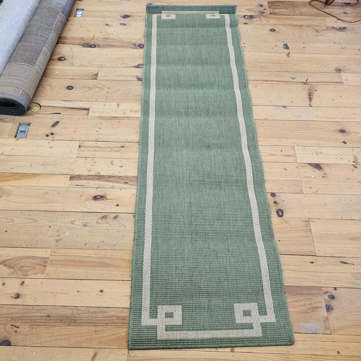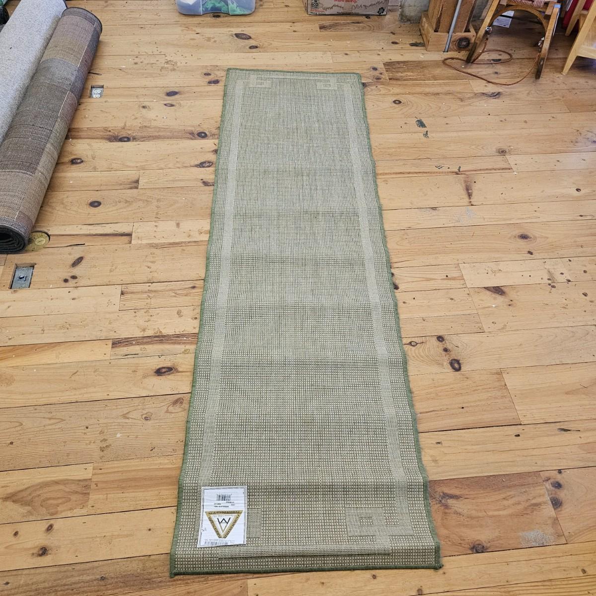 An emerald green runner by American Mills Inc, this piece has a contrasting border design. Rug measures 26" x 92". Some slight fraying on edges, see photos for details. Local pickup only.