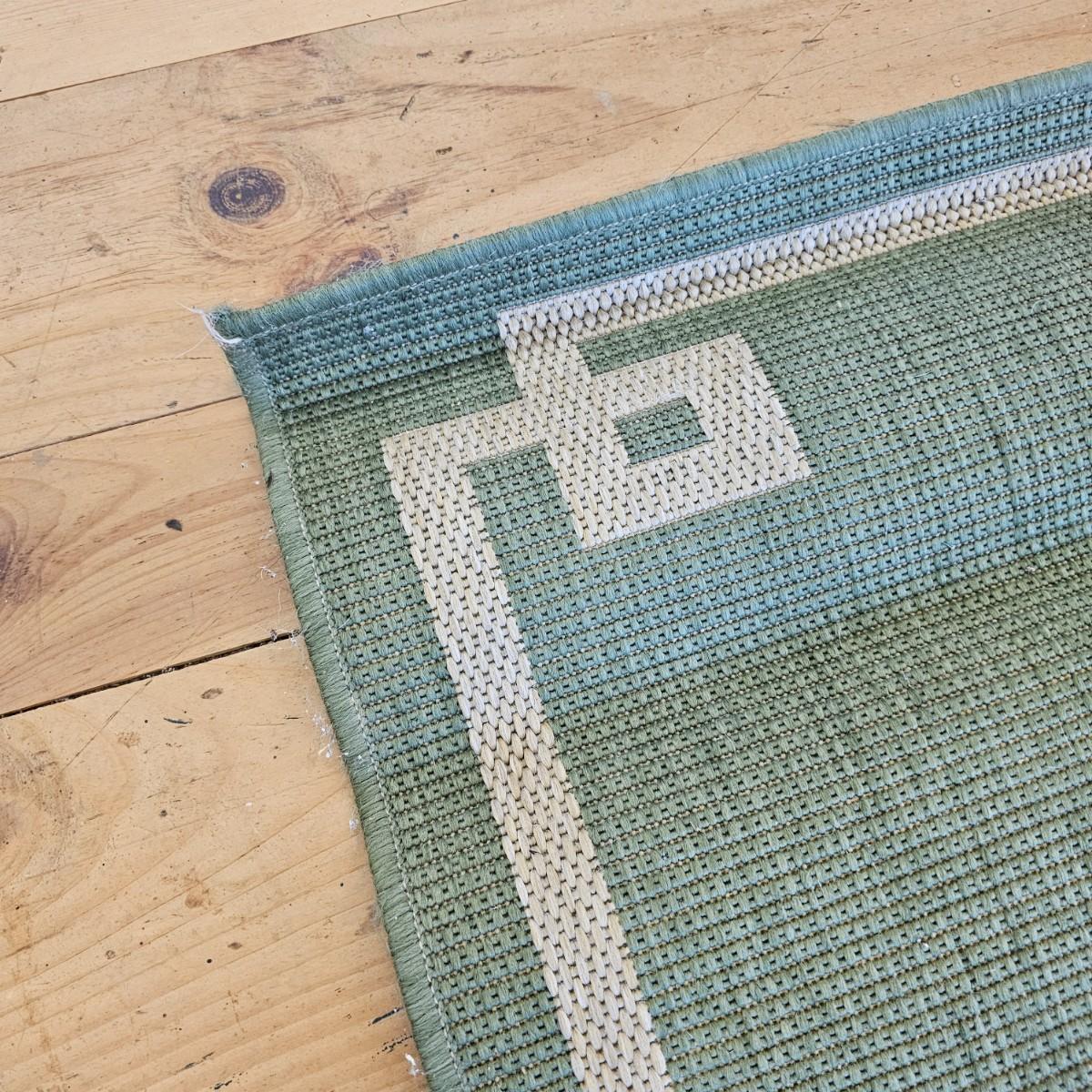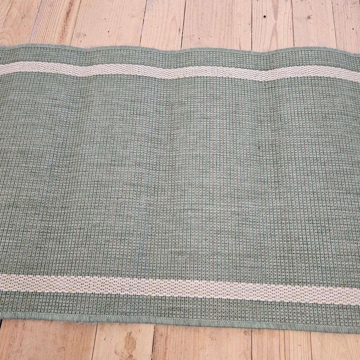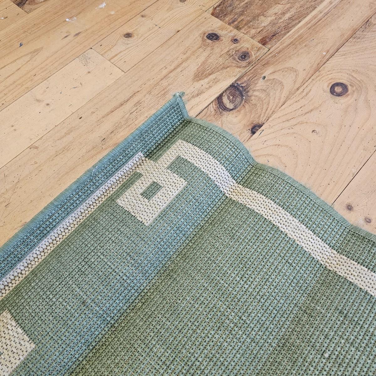 An emerald green runner by American Mills Inc, this piece has a contrasting border design. Rug measures 26" x 92". Some slight fraying on edges, see photos for details. Local pickup only.