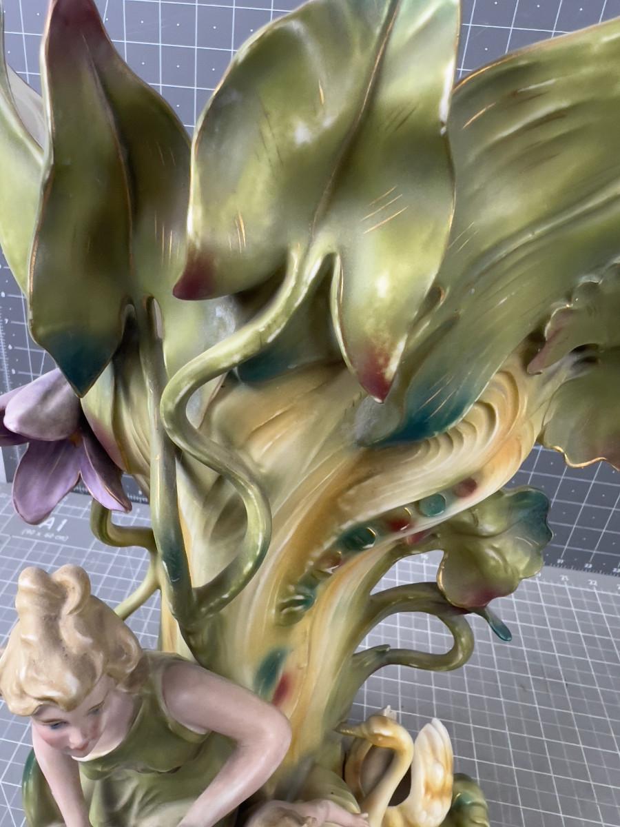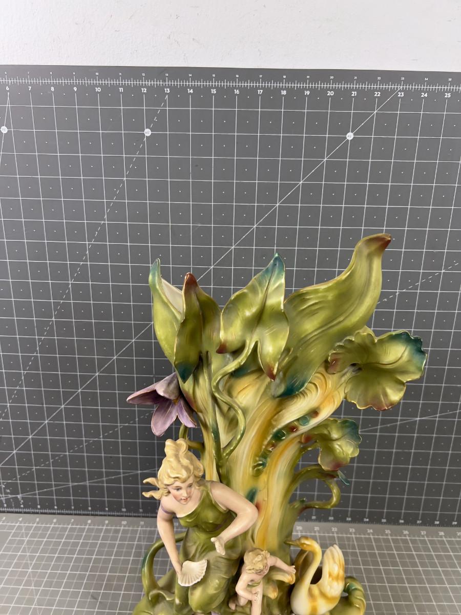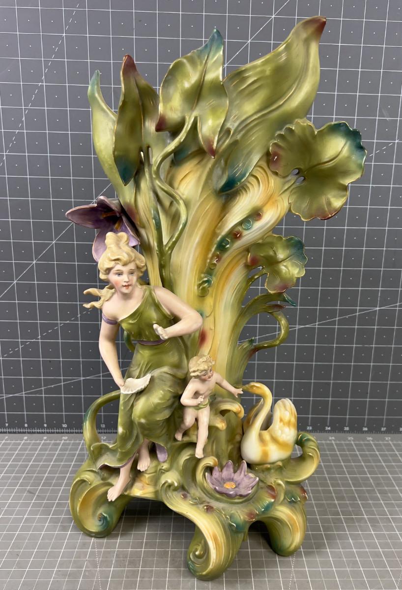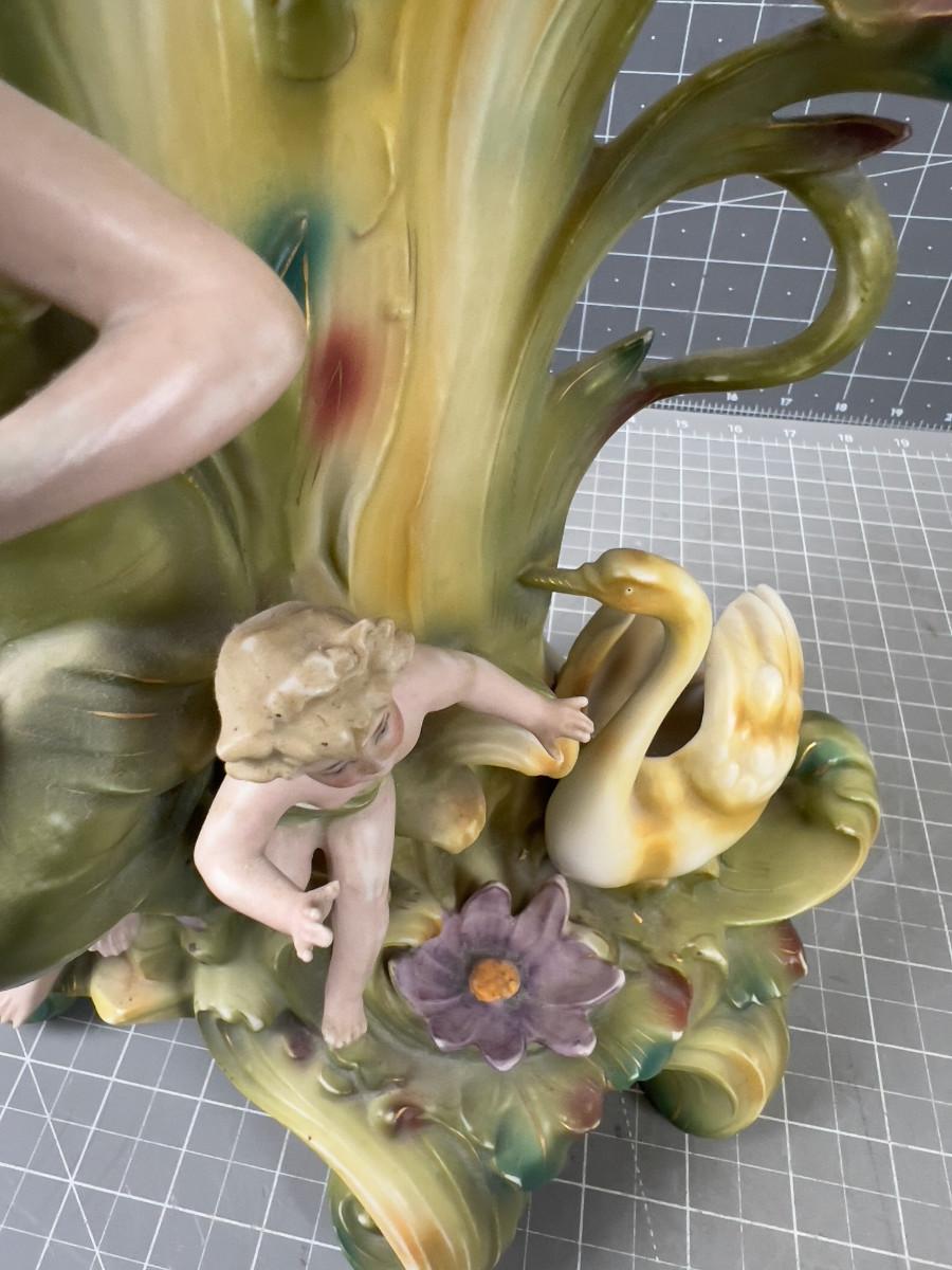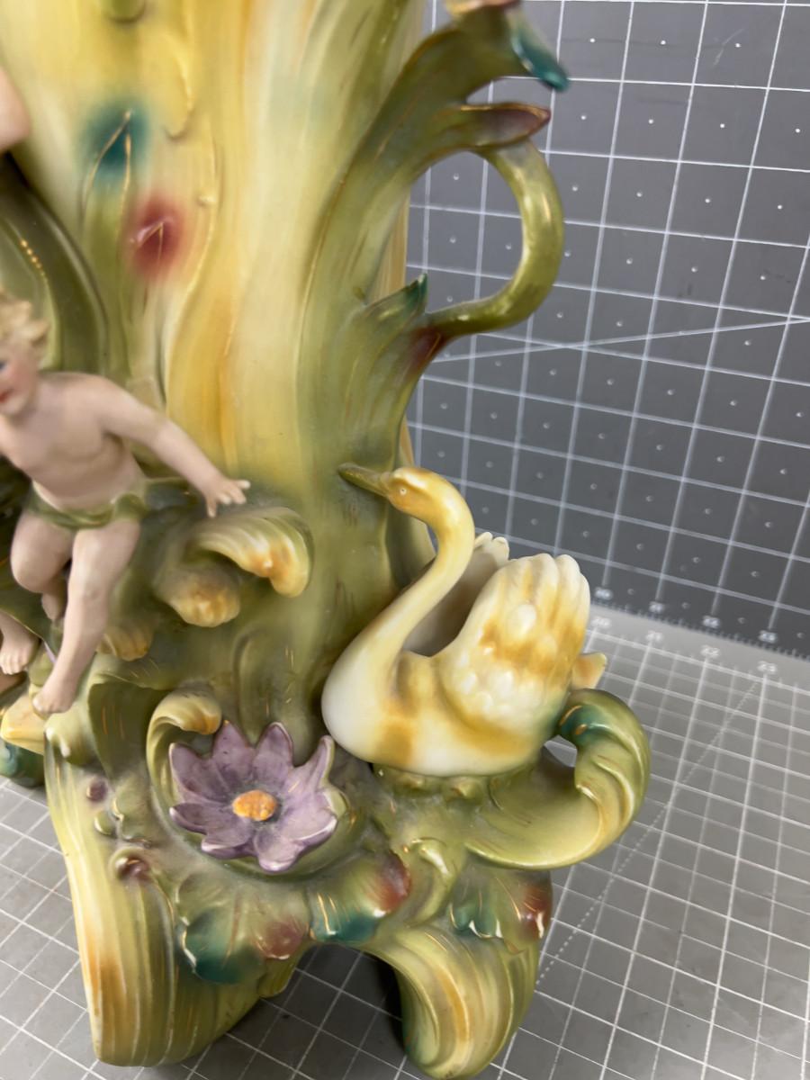 Green, Saxony Art Nouveau Vase Cherub and Swans