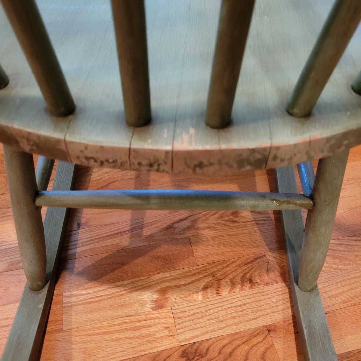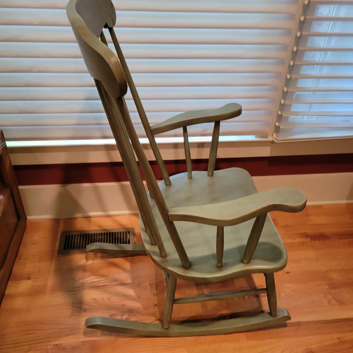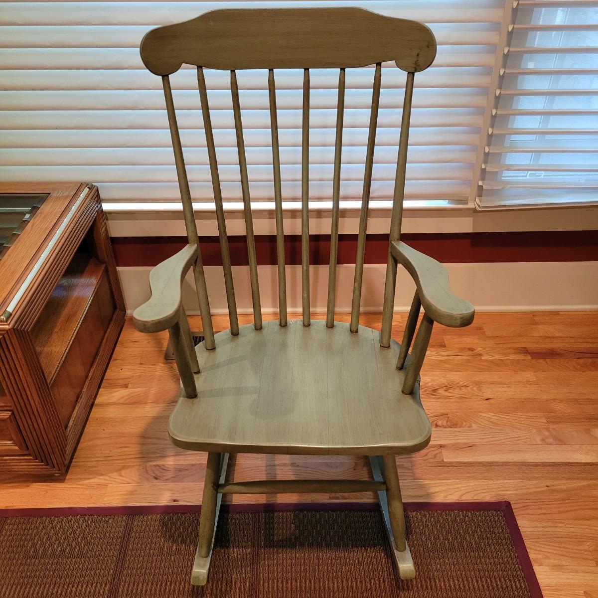 A green stained wooden rocking chair that measures approximately 23.5" x 29" x 40"H with a seat height of 17". This chair has some minor wear; please see photos. Local pickup only