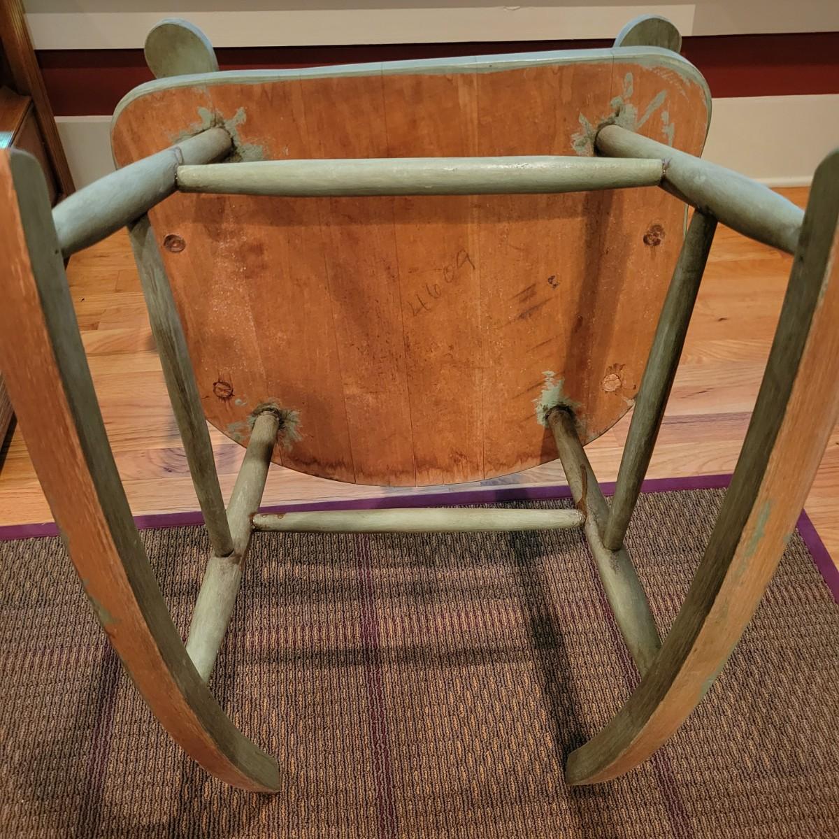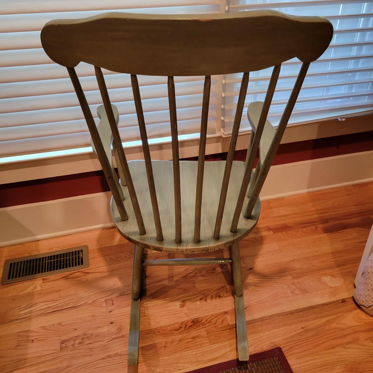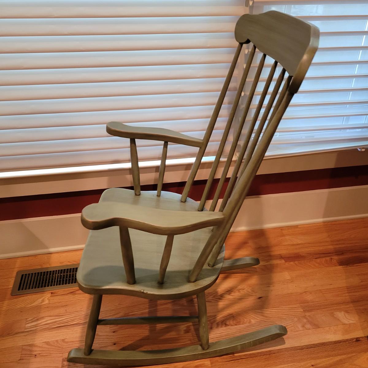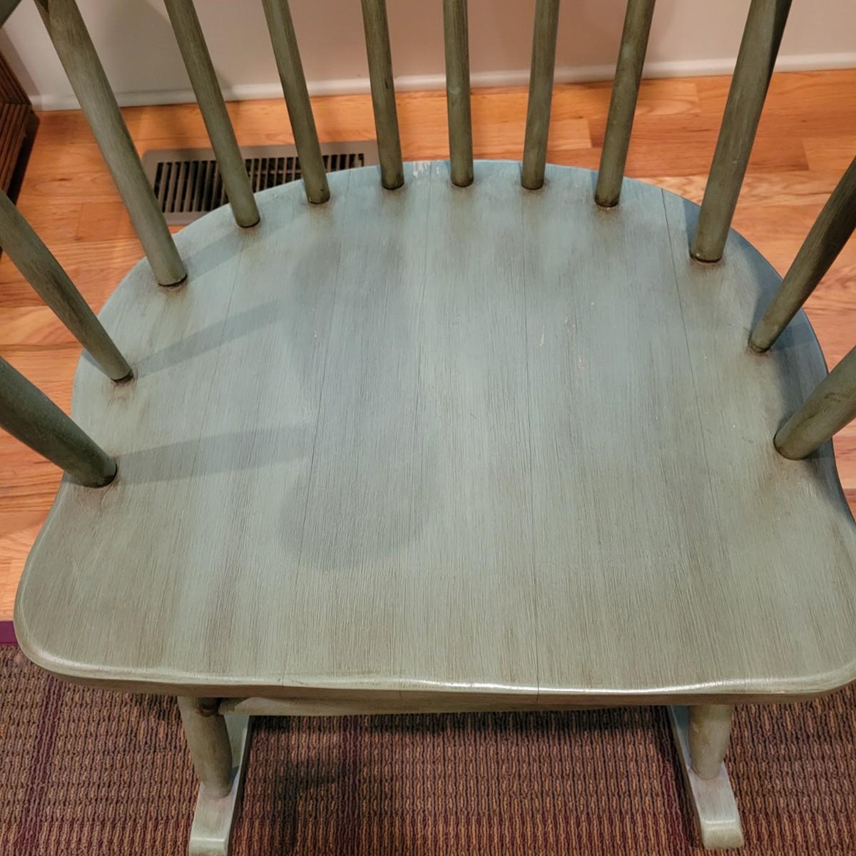 A green stained wooden rocking chair that measures approximately 23.5" x 29" x 40"H with a seat height of 17". This chair has some minor wear; please see photos. Local pickup only