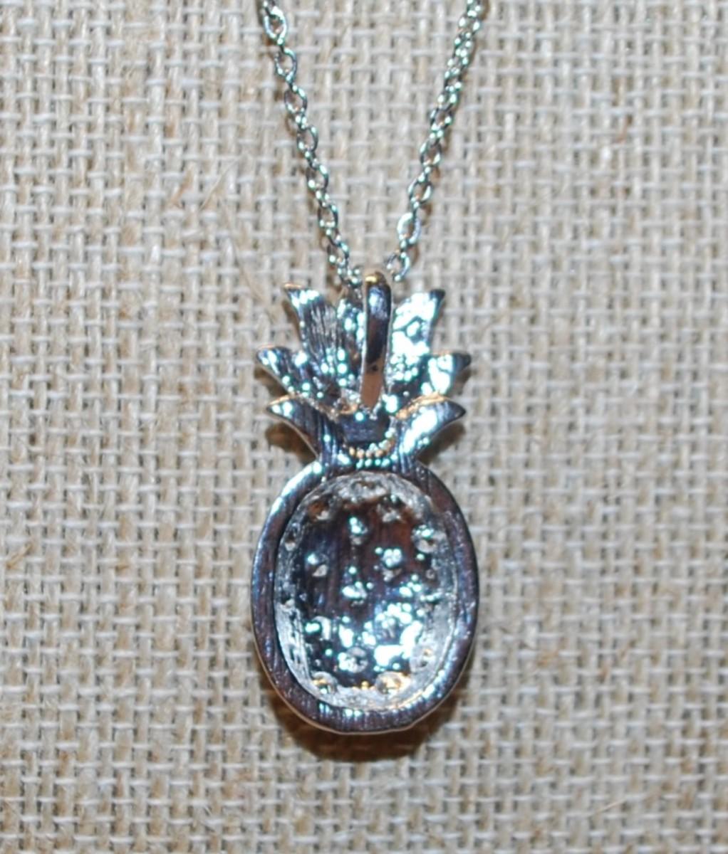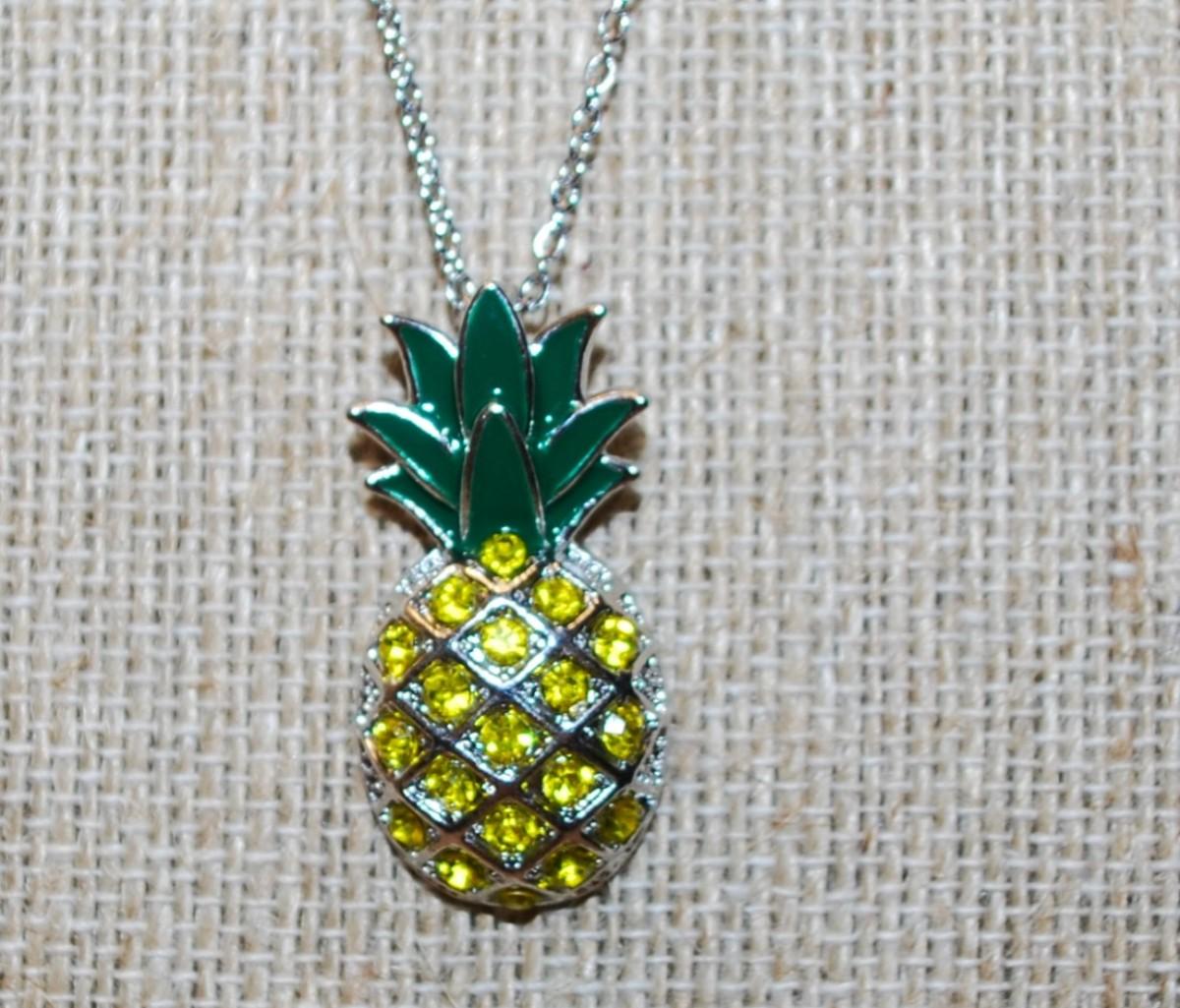 Green Stem Pineapple PENDANT (1⅛" x ¾") with 19 Yellow Stones on a Silvery Setting & Silver Tone Necklace Chain 20" L