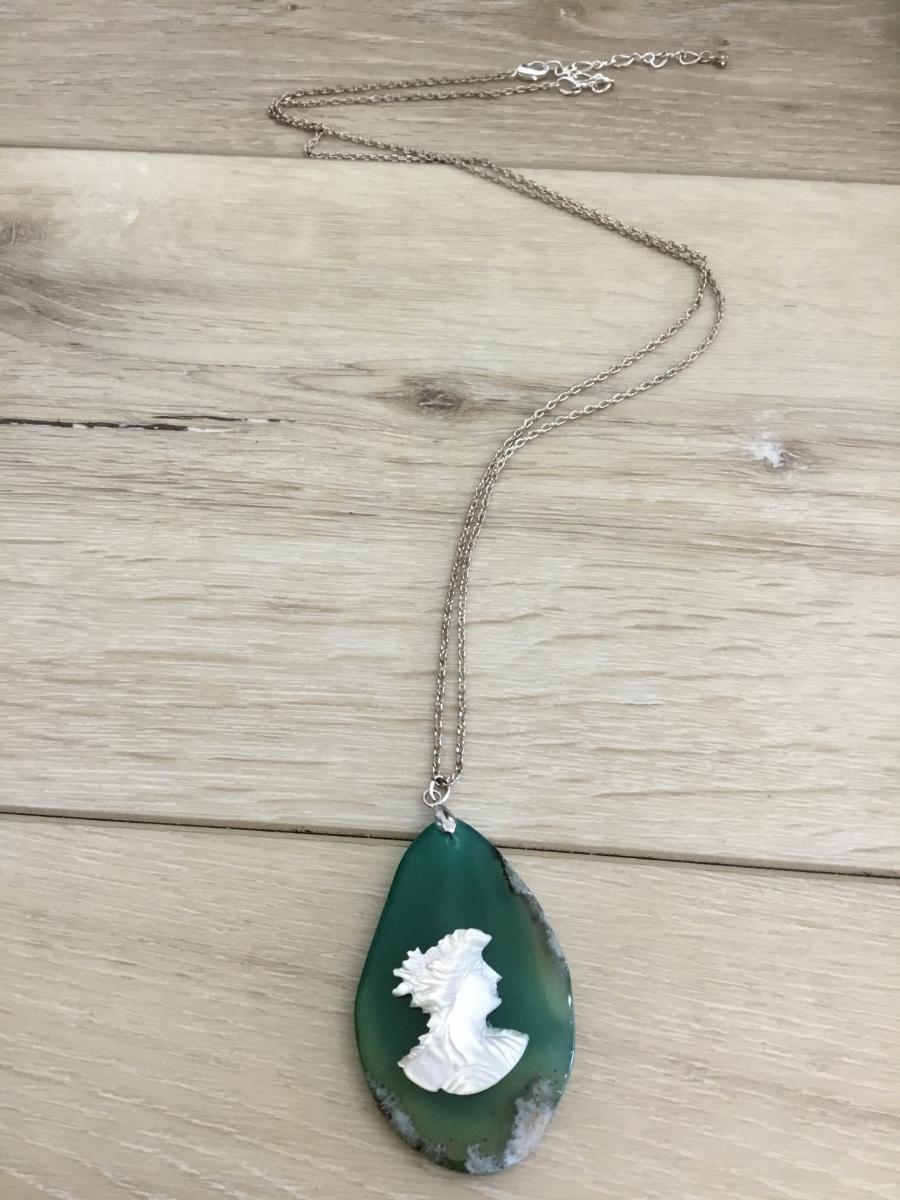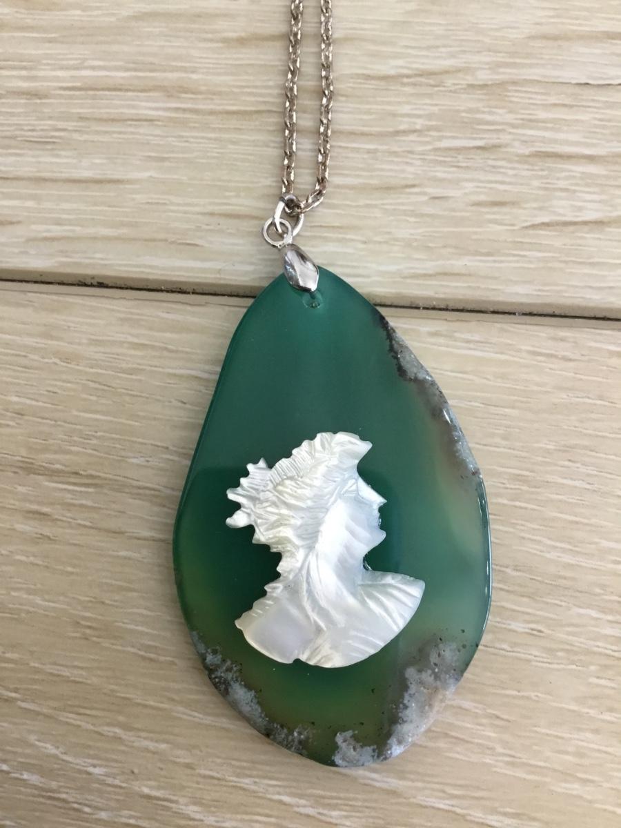 Green stone agate with mother of pearl cameo statement necklace