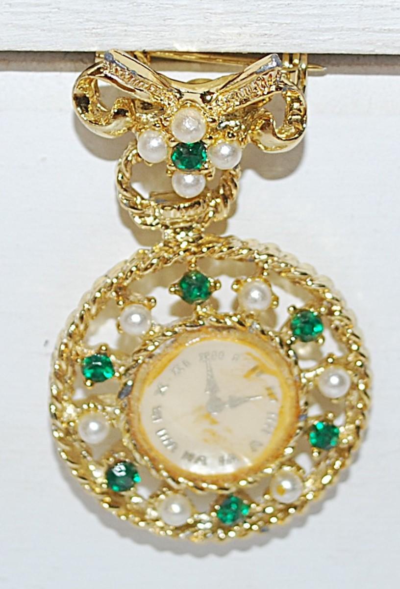GREEN Stones & Faux Pearls "CLOCK" BROOCH (2¼" x 1¼") with Gold Tone Setting