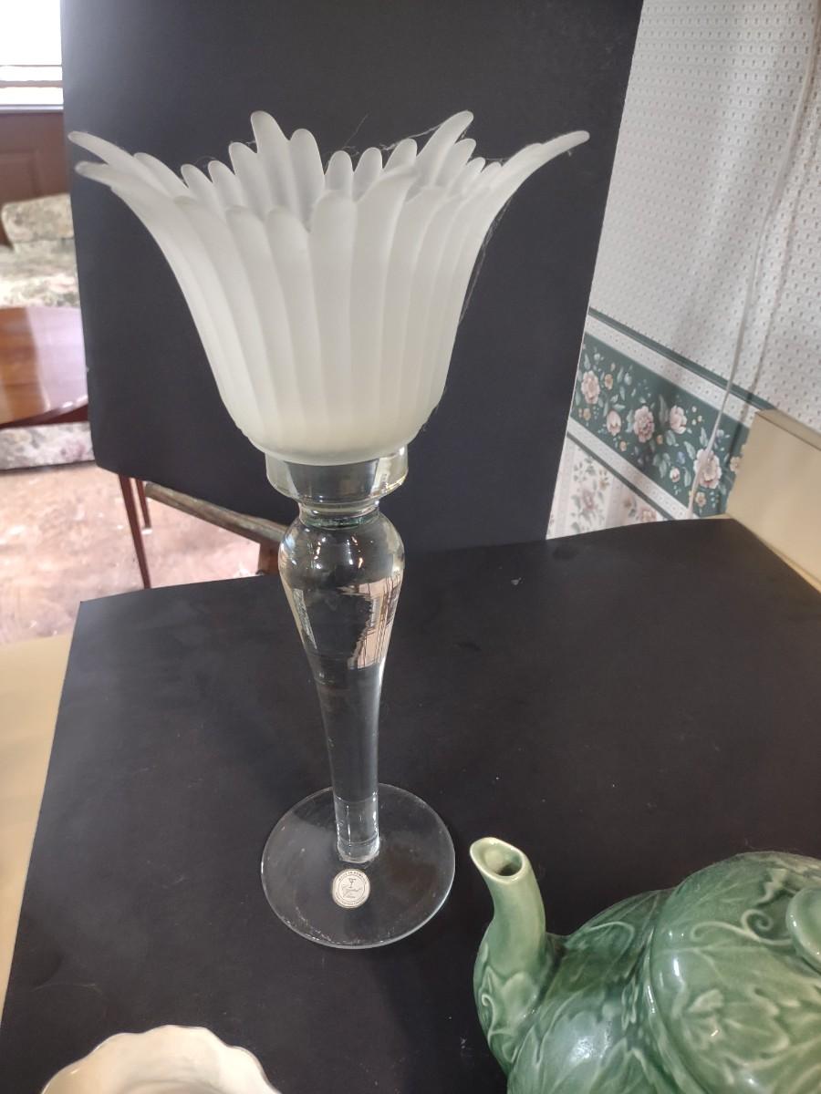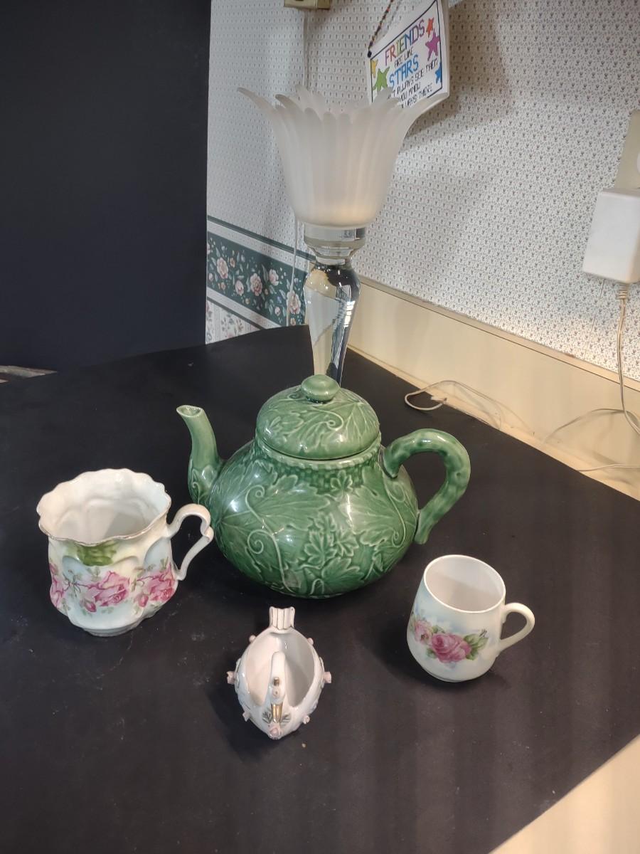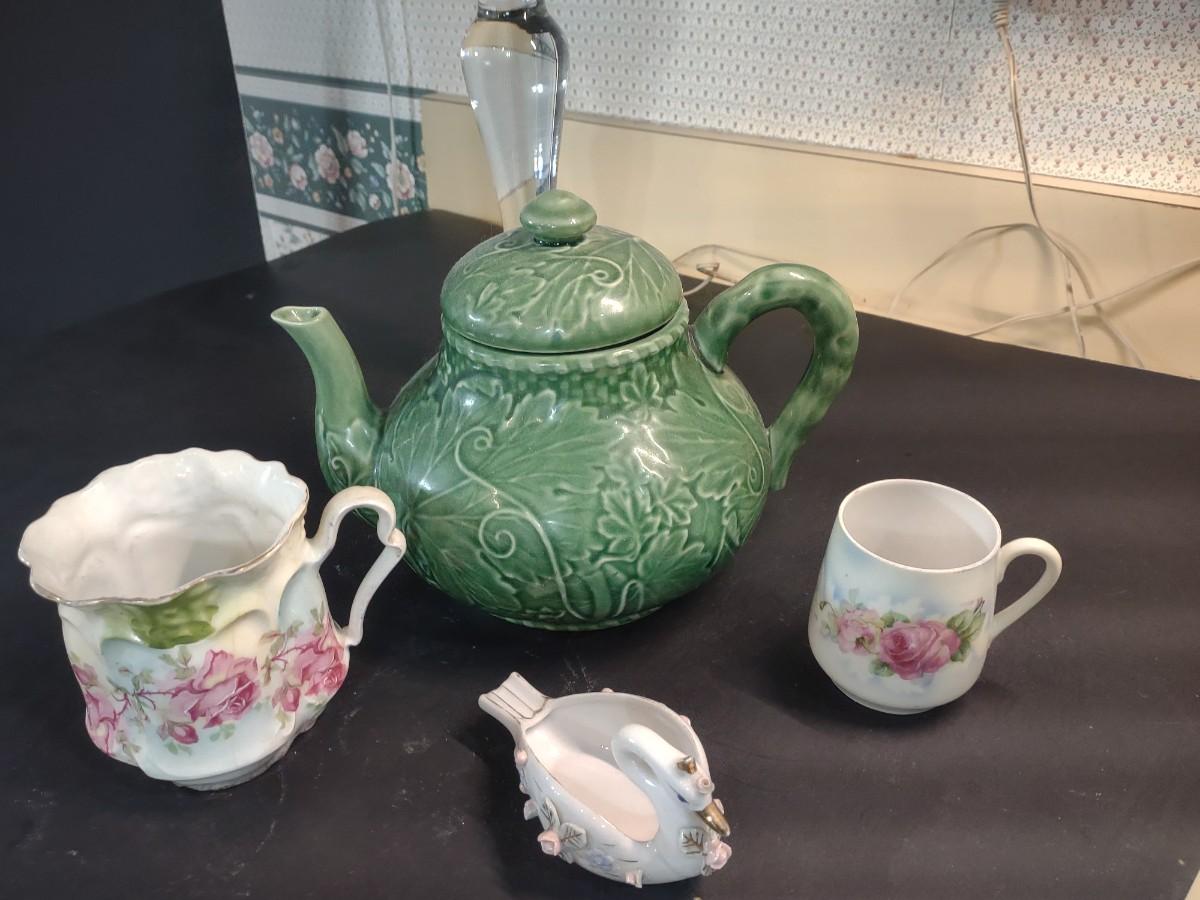 GREEN TEAPOT, FLORAL TEA CUPS, SWAN ASHTRAY AND CRYSTAL CANDLE HOLDER MADE IN ROMANIA