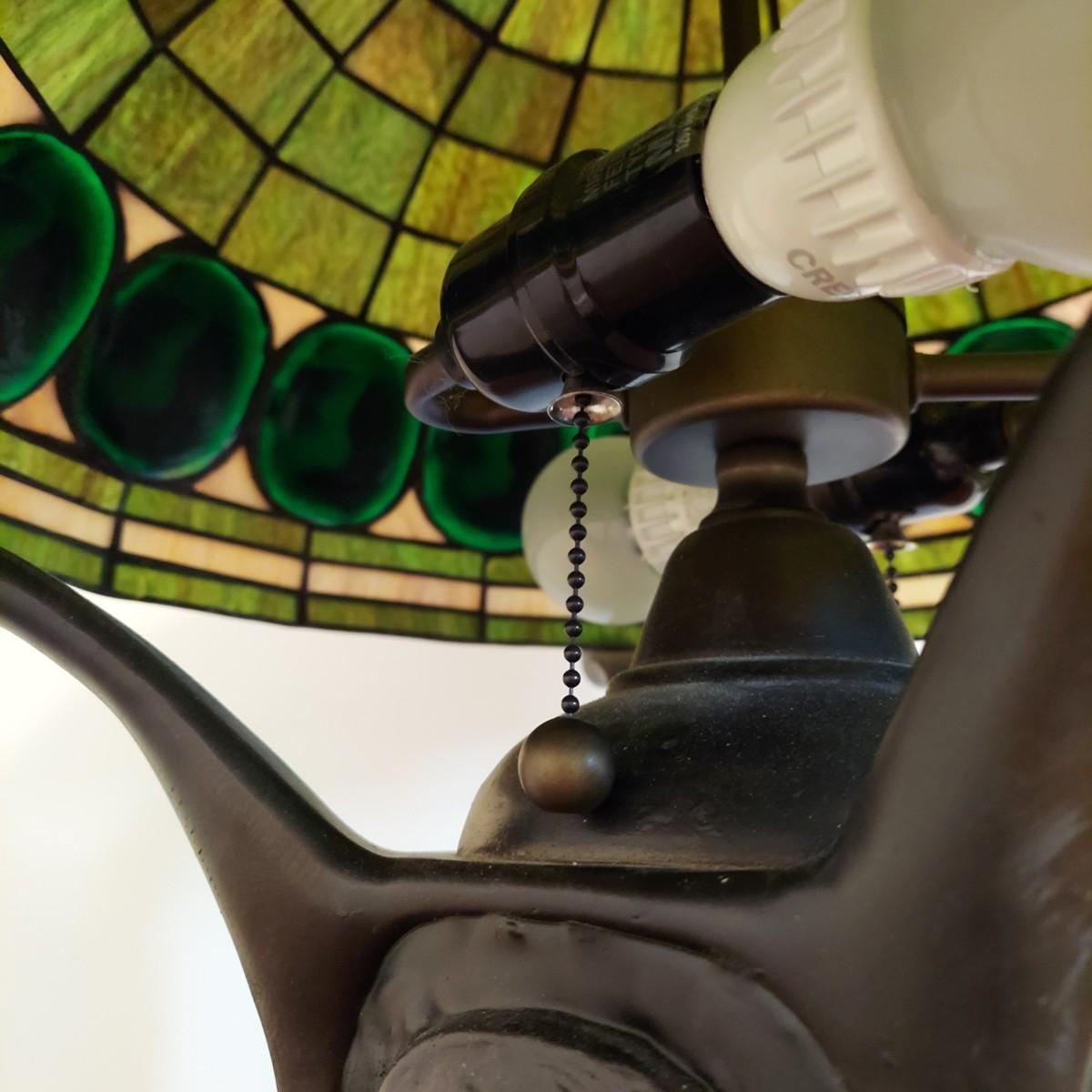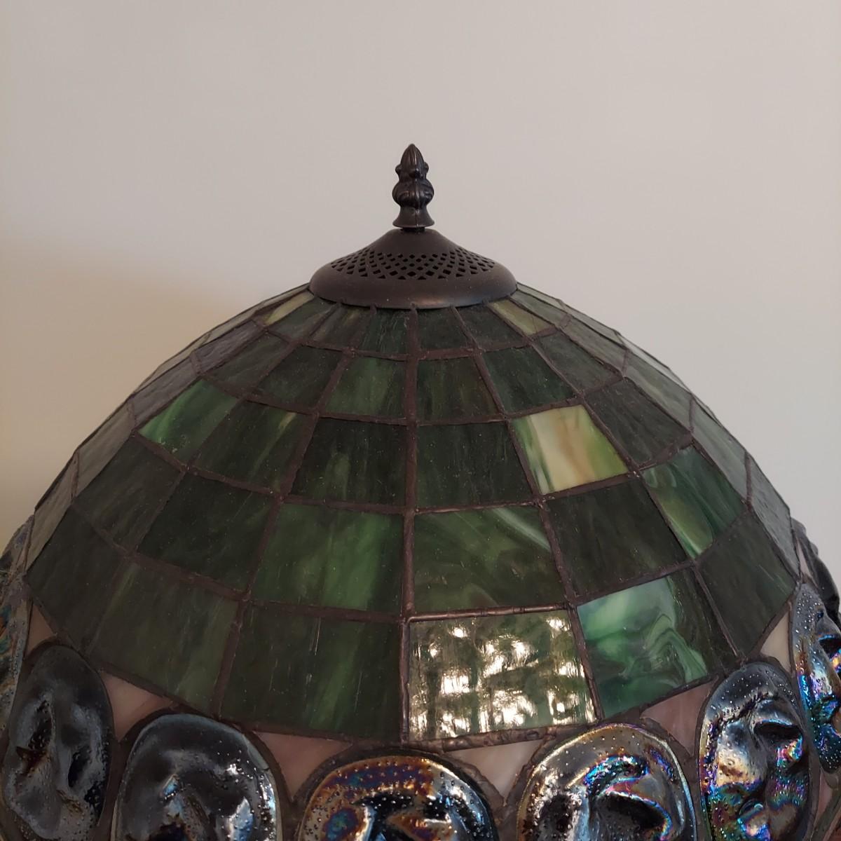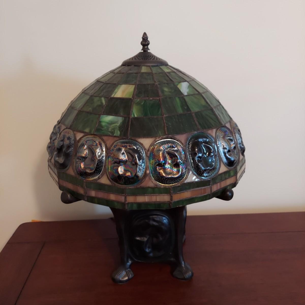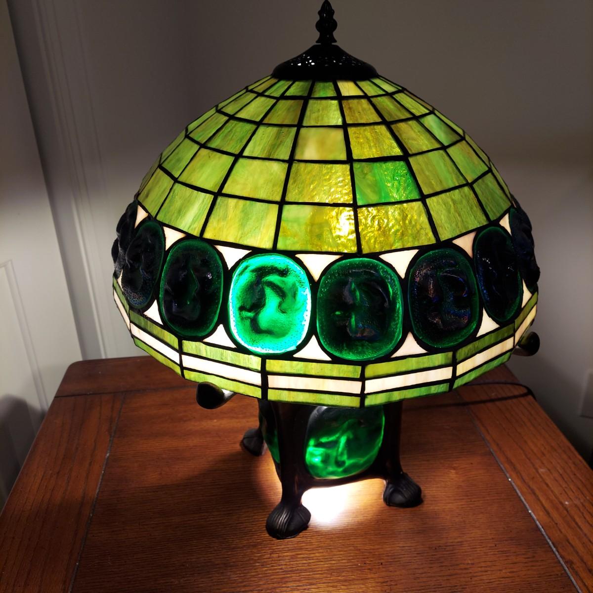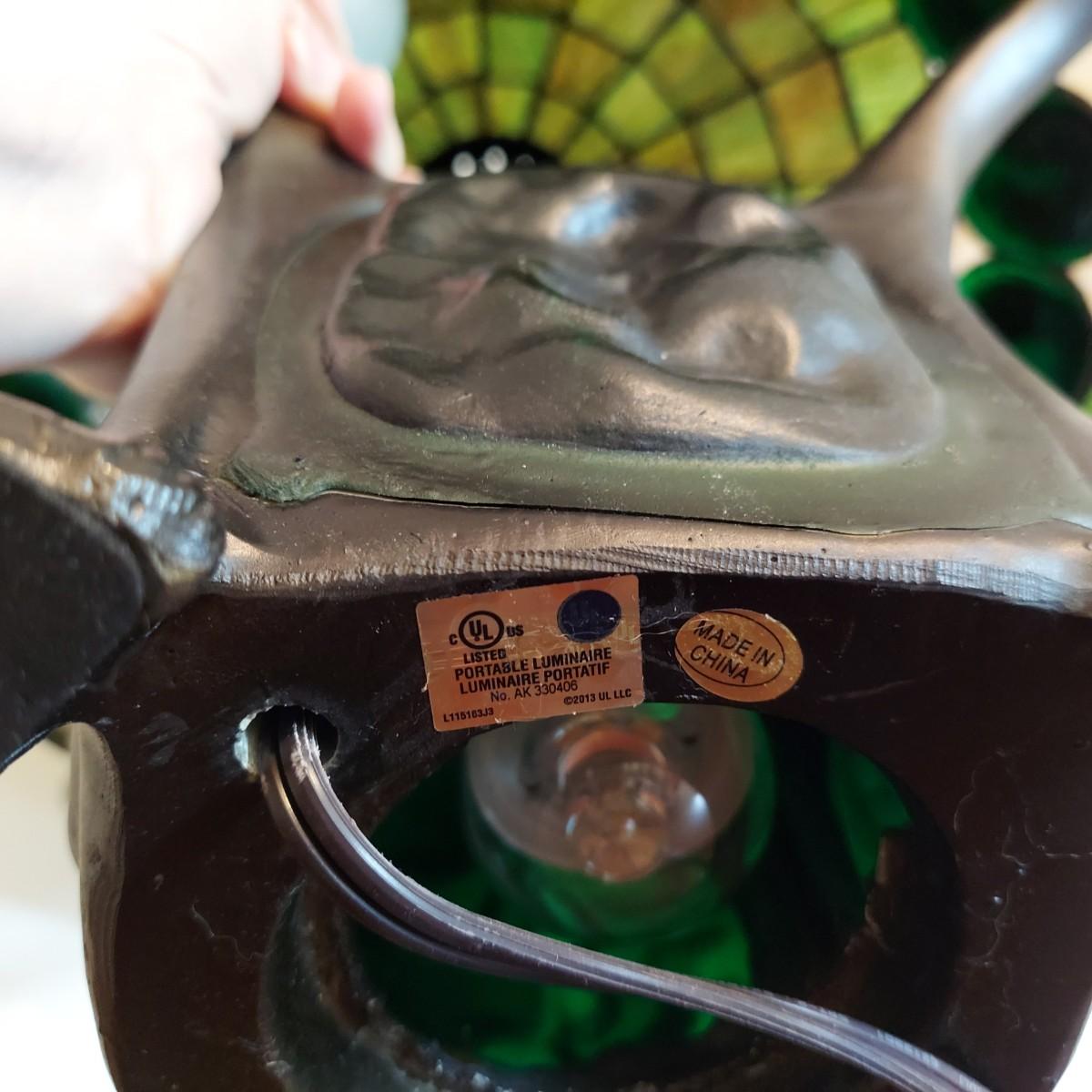 Tiffany style lamp with green glass shade and base that looks like metal but appears to be plastic. Lamp is 20" tall and shade has 16" diameter. There is an inline switch as well as chain pulls under the shade. Plugged in and powered on. Local Pickup Only.