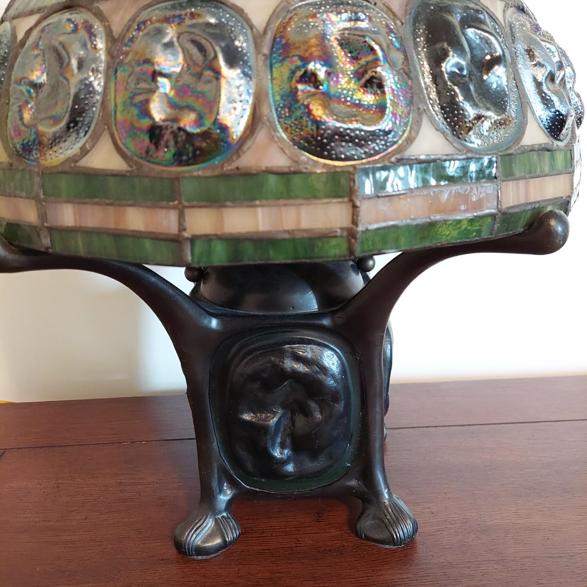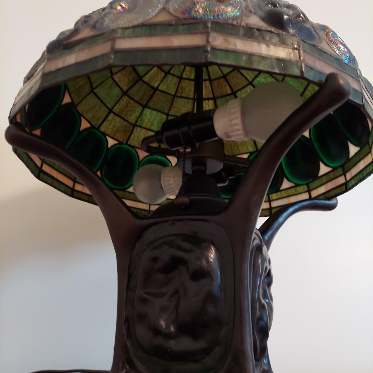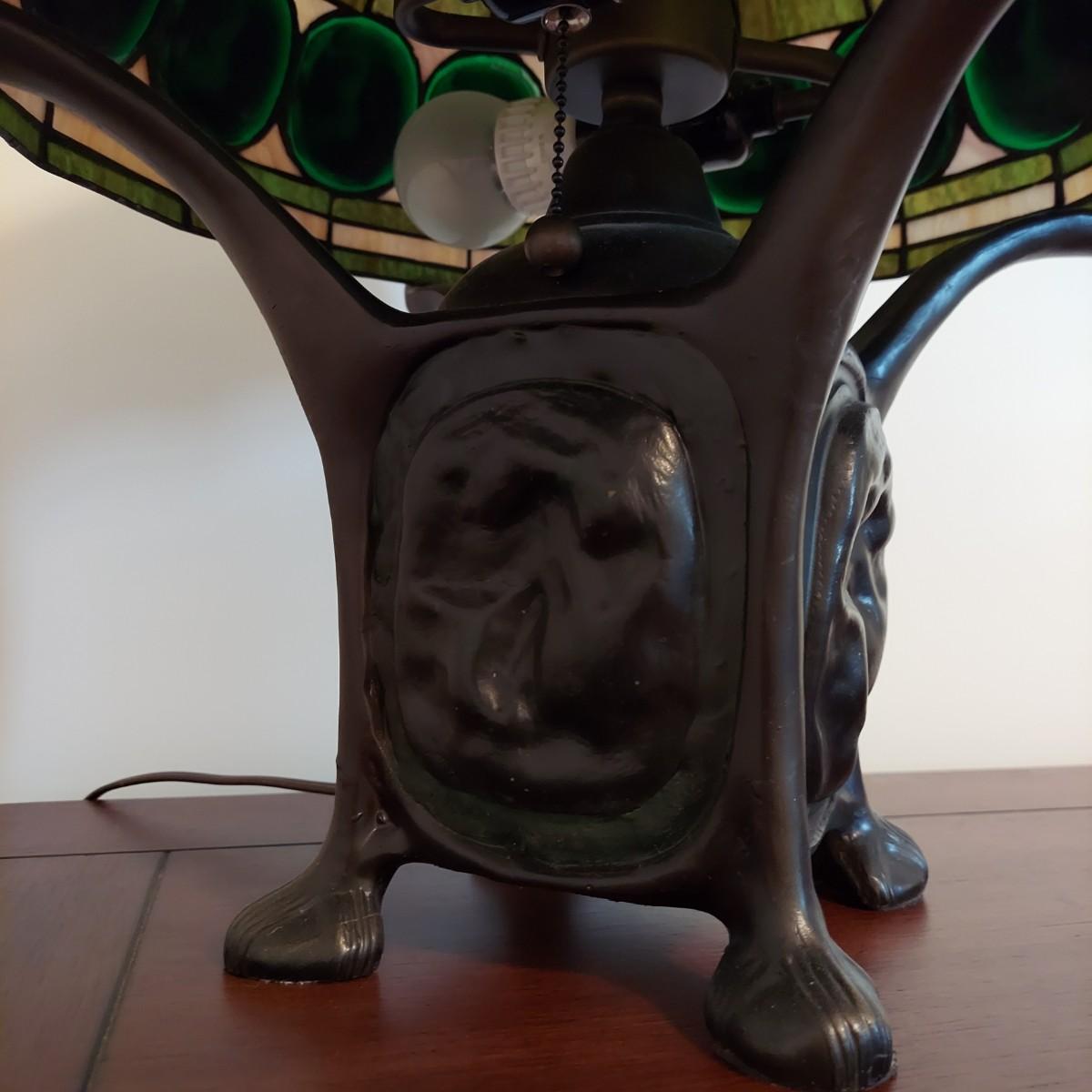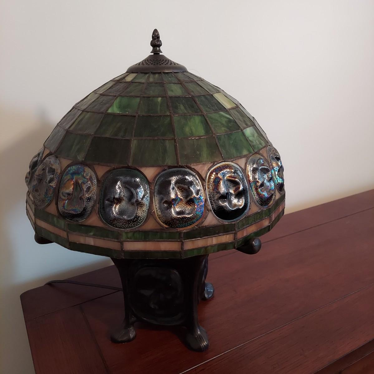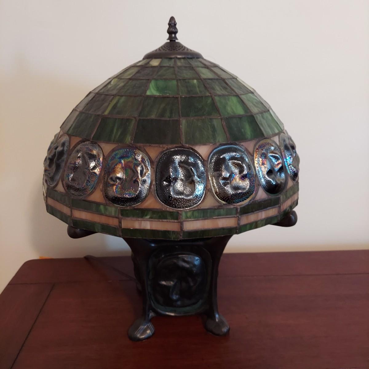 Tiffany style lamp with green glass shade and base that looks like metal but appears to be plastic. Lamp is 20" tall and shade has 16" diameter. There is an inline switch as well as chain pulls under the shade. Plugged in and powered on. Local Pickup Only.