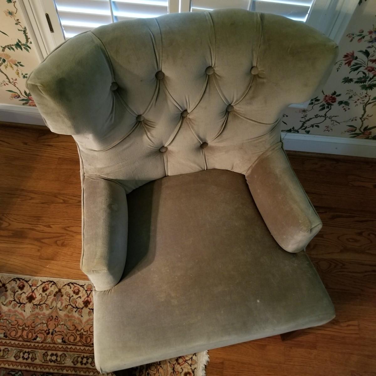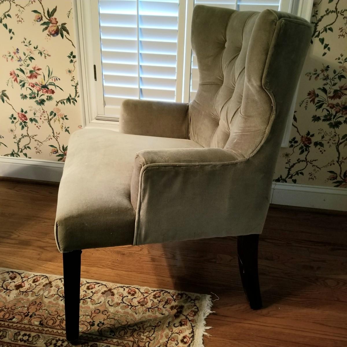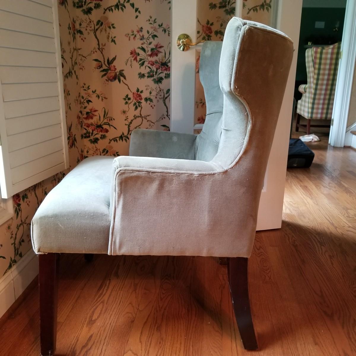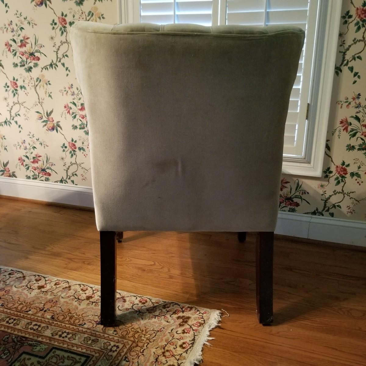 Green tufted wingback chair with wooden legs. Some light wear on seat and legs. Made by Yi Tong Ltd of China. Chair measures 25" x 27" x 35". Seat height 20". Local pickup only.