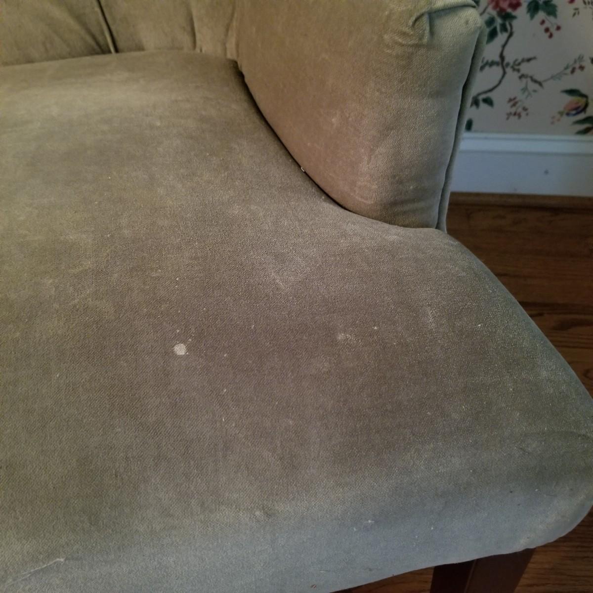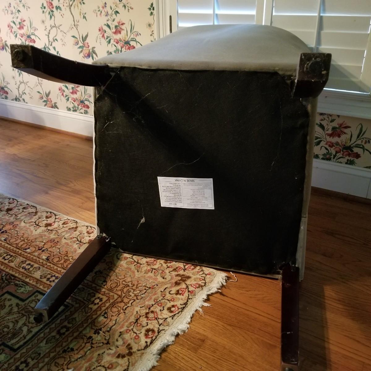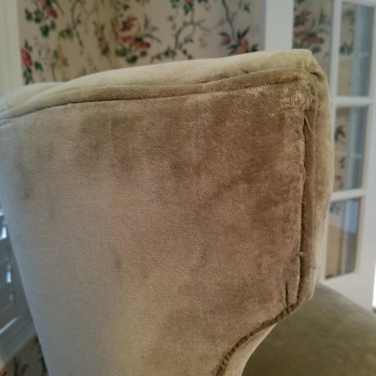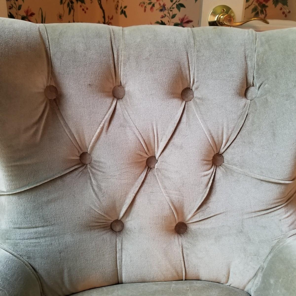 Green tufted wingback chair with wooden legs. Some light wear on seat and legs. Made by Yi Tong Ltd of China. Chair measures 25" x 27" x 35". Seat height 20". Local pickup only.