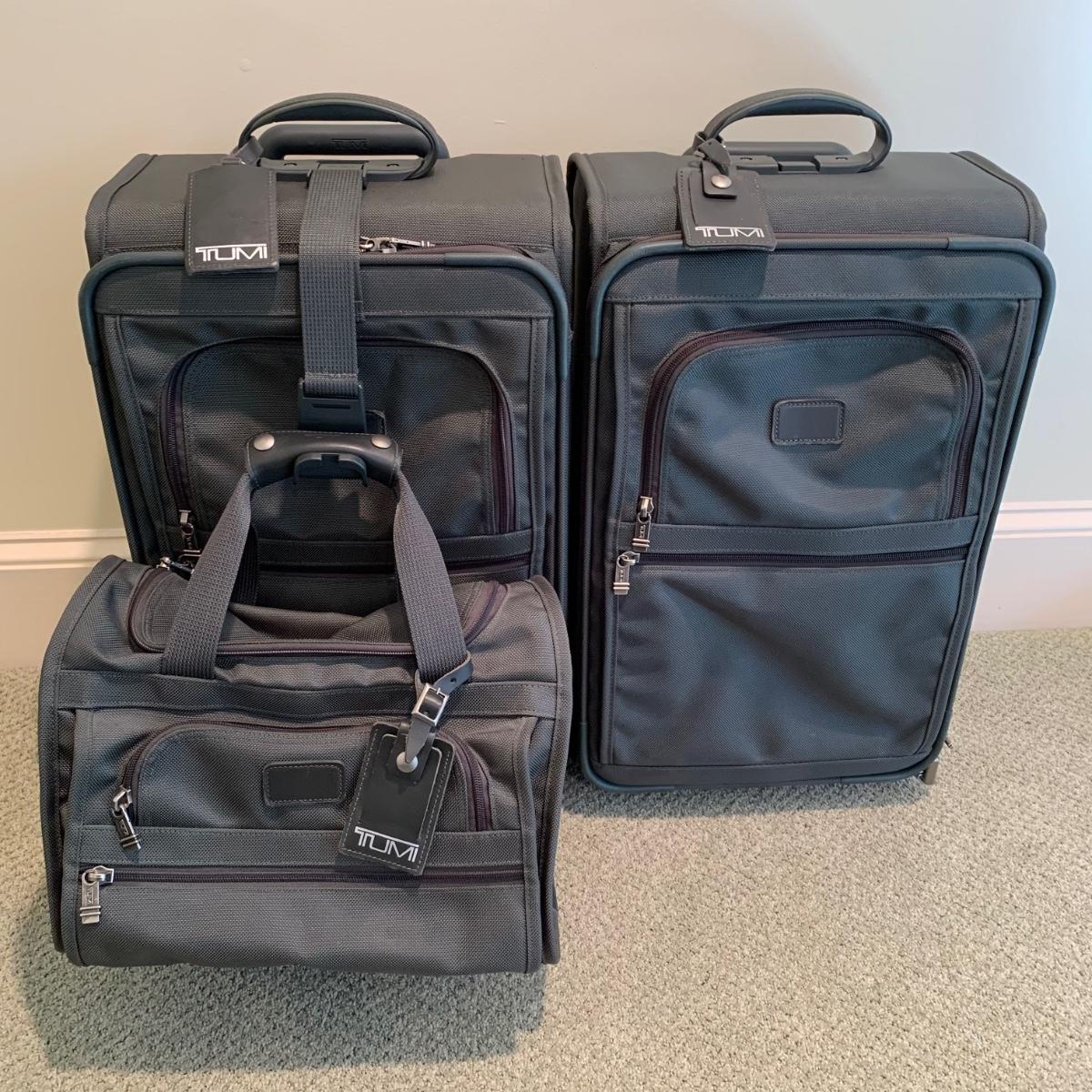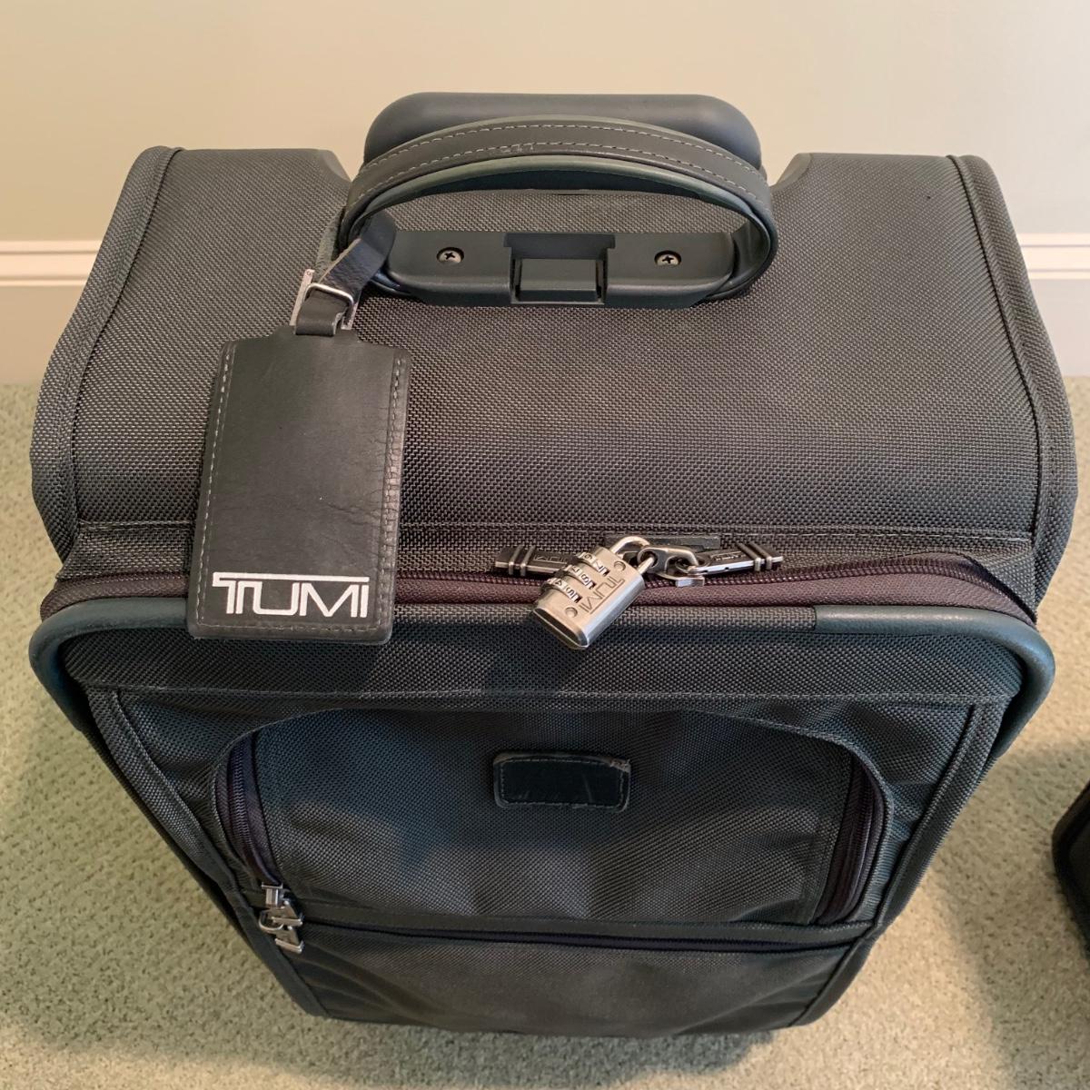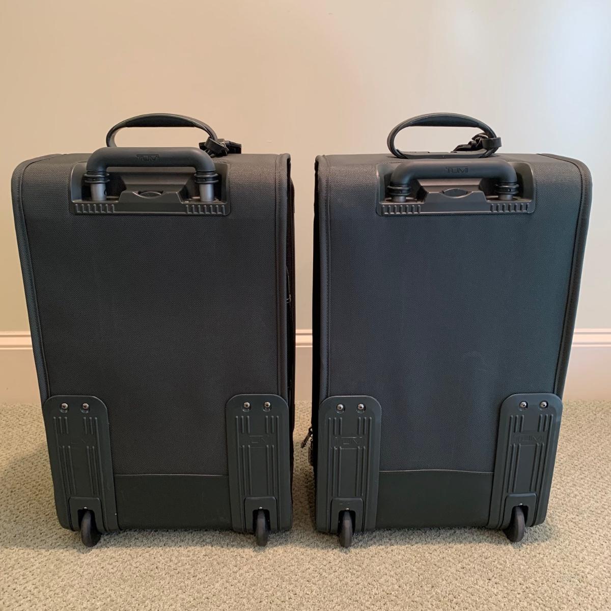 Lot includes two green TUMI rolling bags and one TUMI carry-on bag. Rolling luggage bags measure, 14” x 10” x 23”H. Please see photos for more details. Local pickup only.