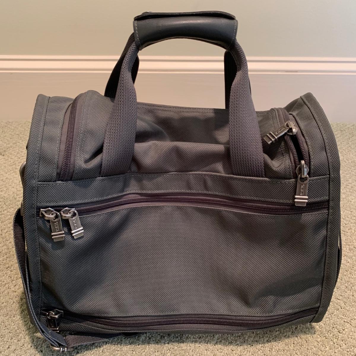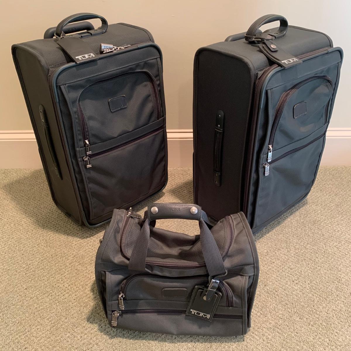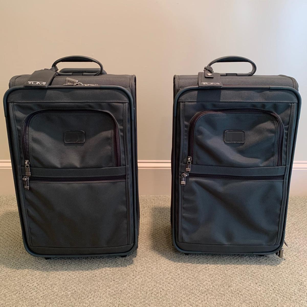 Lot includes two green TUMI rolling bags and one TUMI carry-on bag. Rolling luggage bags measure, 14” x 10” x 23”H. Please see photos for more details. Local pickup only.