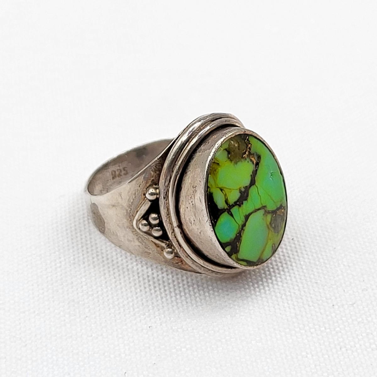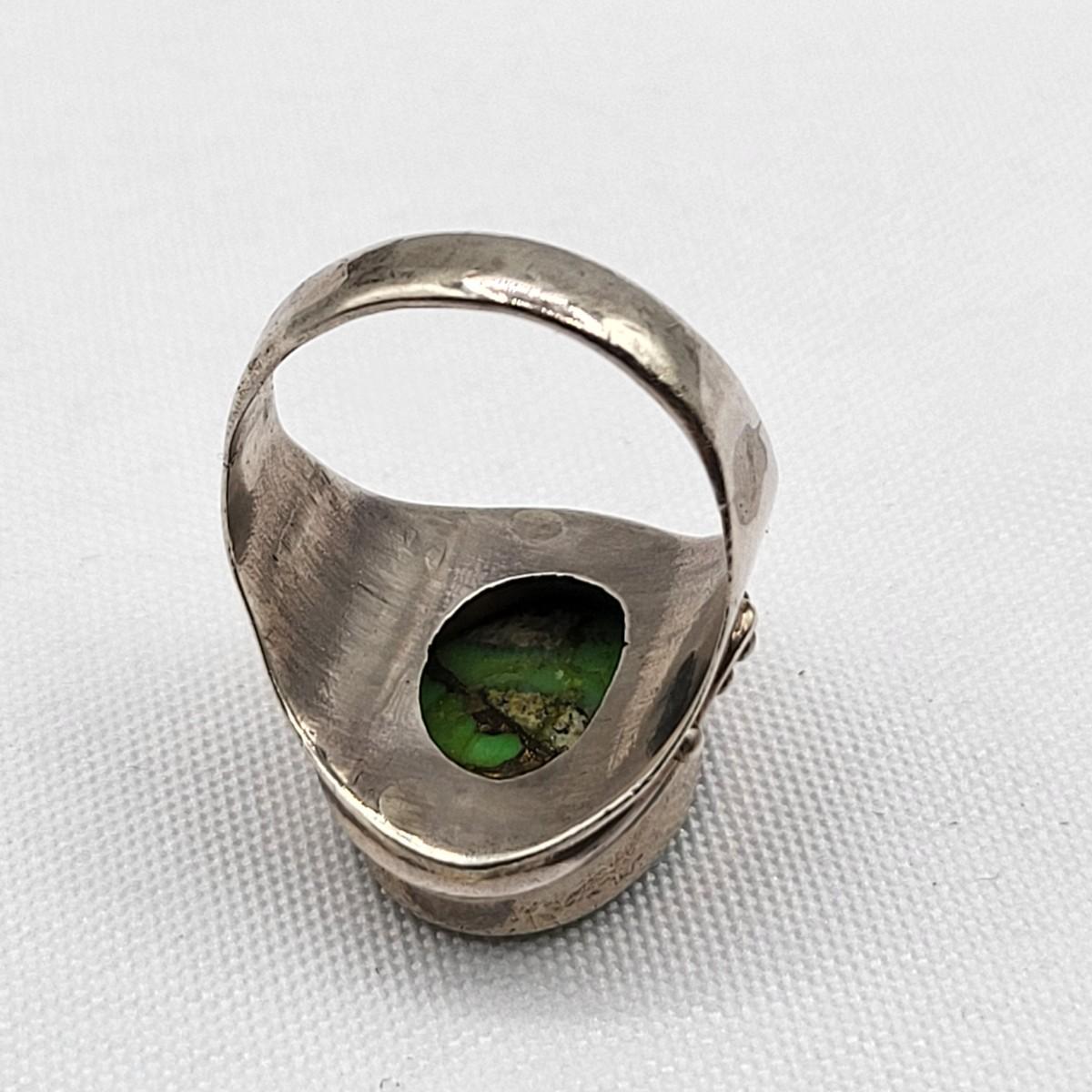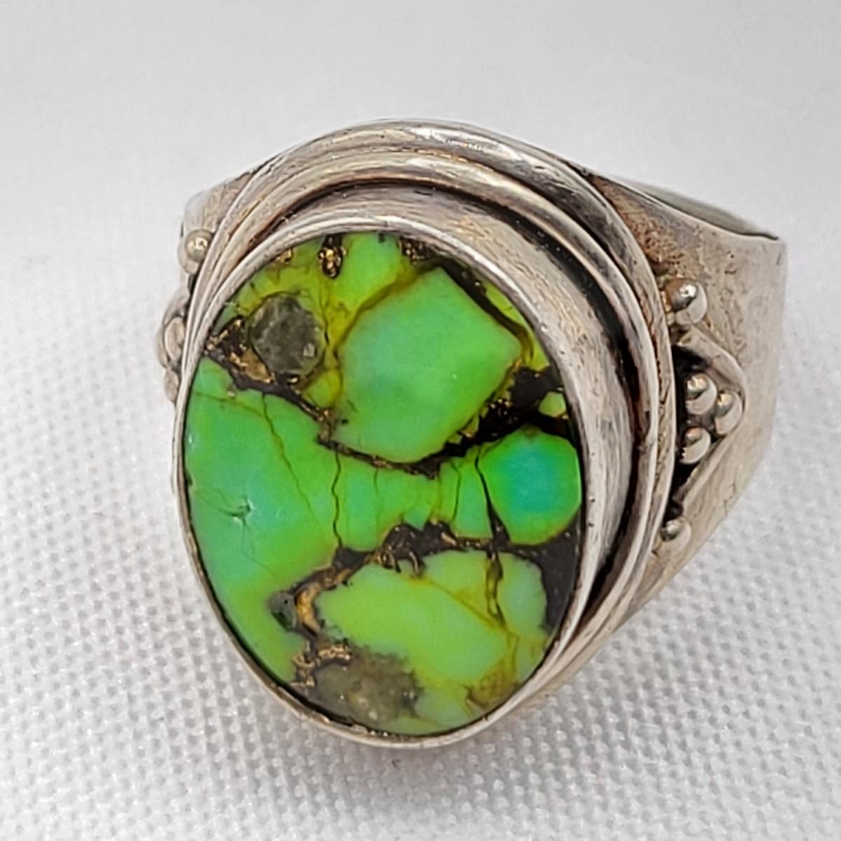 Green Turquoise ring in 925 silver setting, size 9. Face of the ring is .5" x .75". Man or woman ring.
