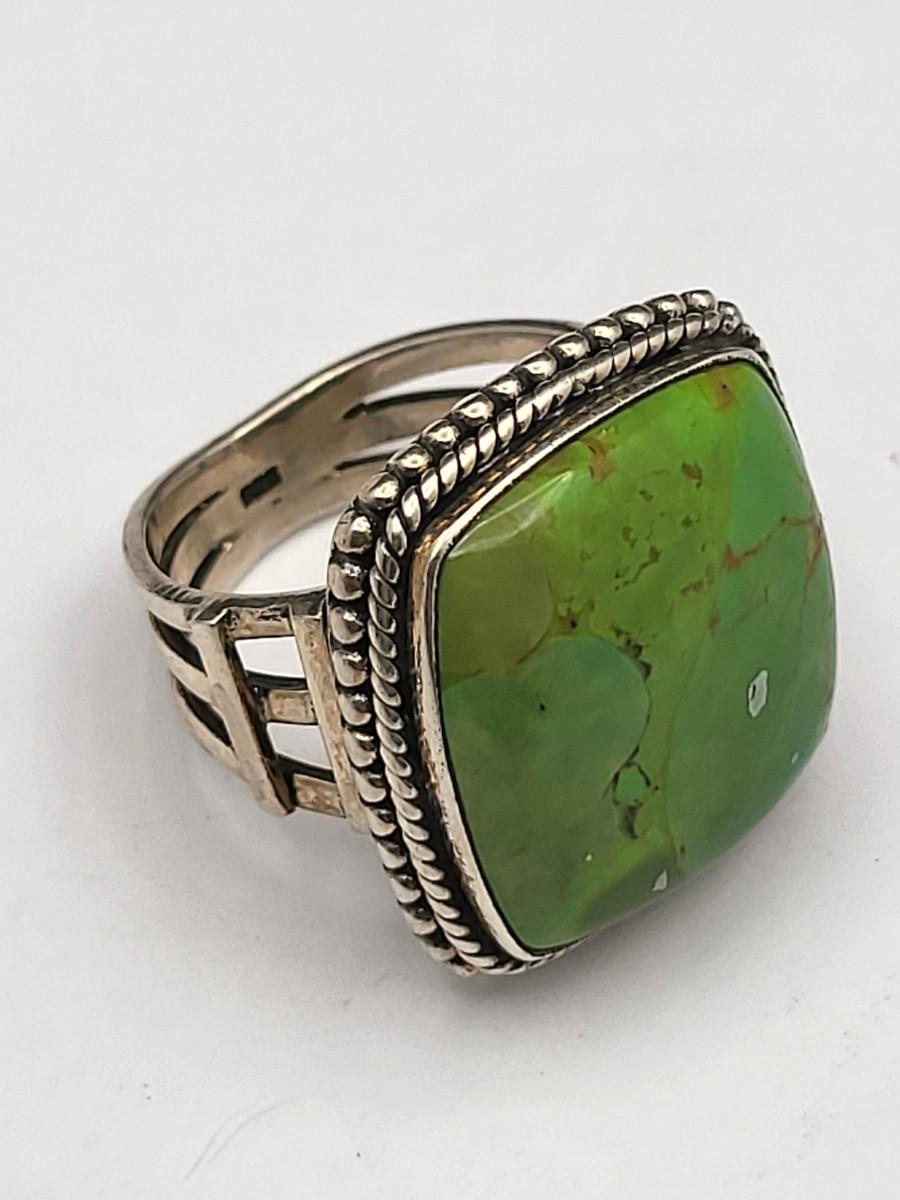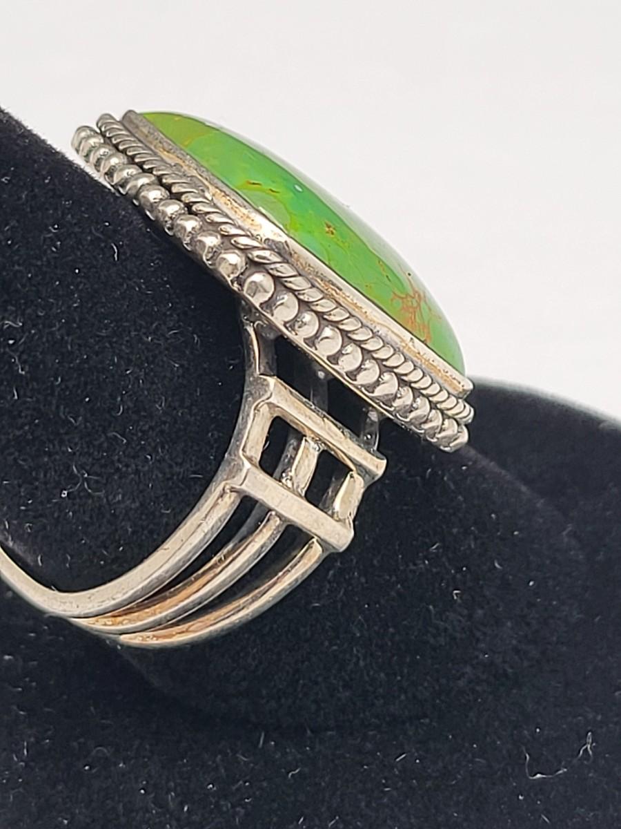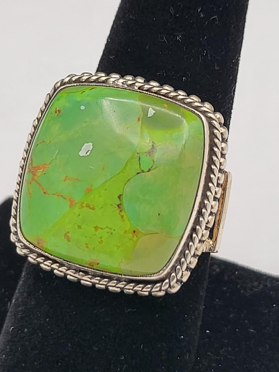 Hand crafted, attractive polished green turquoise ring, framed in a fancy 925 sterling silver bezel setting and open band. Face of the ring is 1" x 1". Size 9.5. Weighs 11 grams.