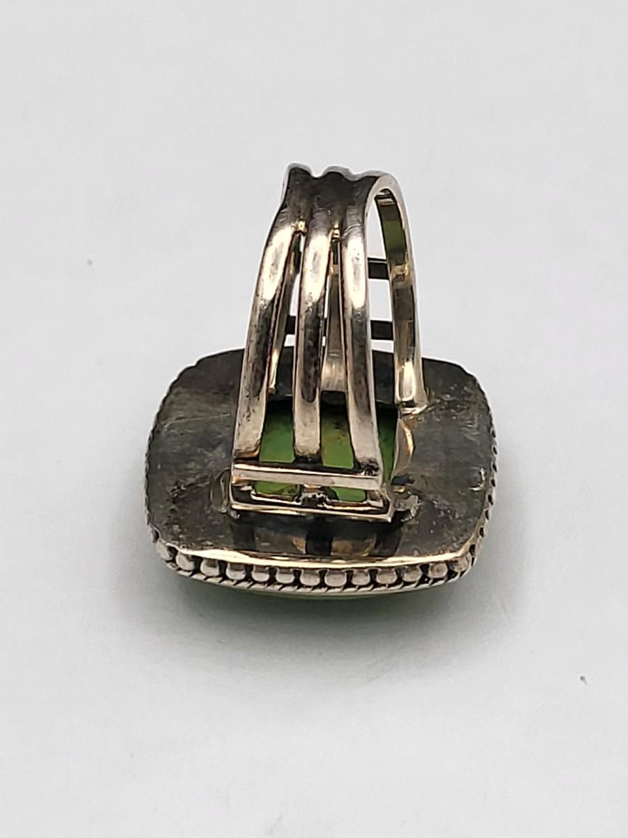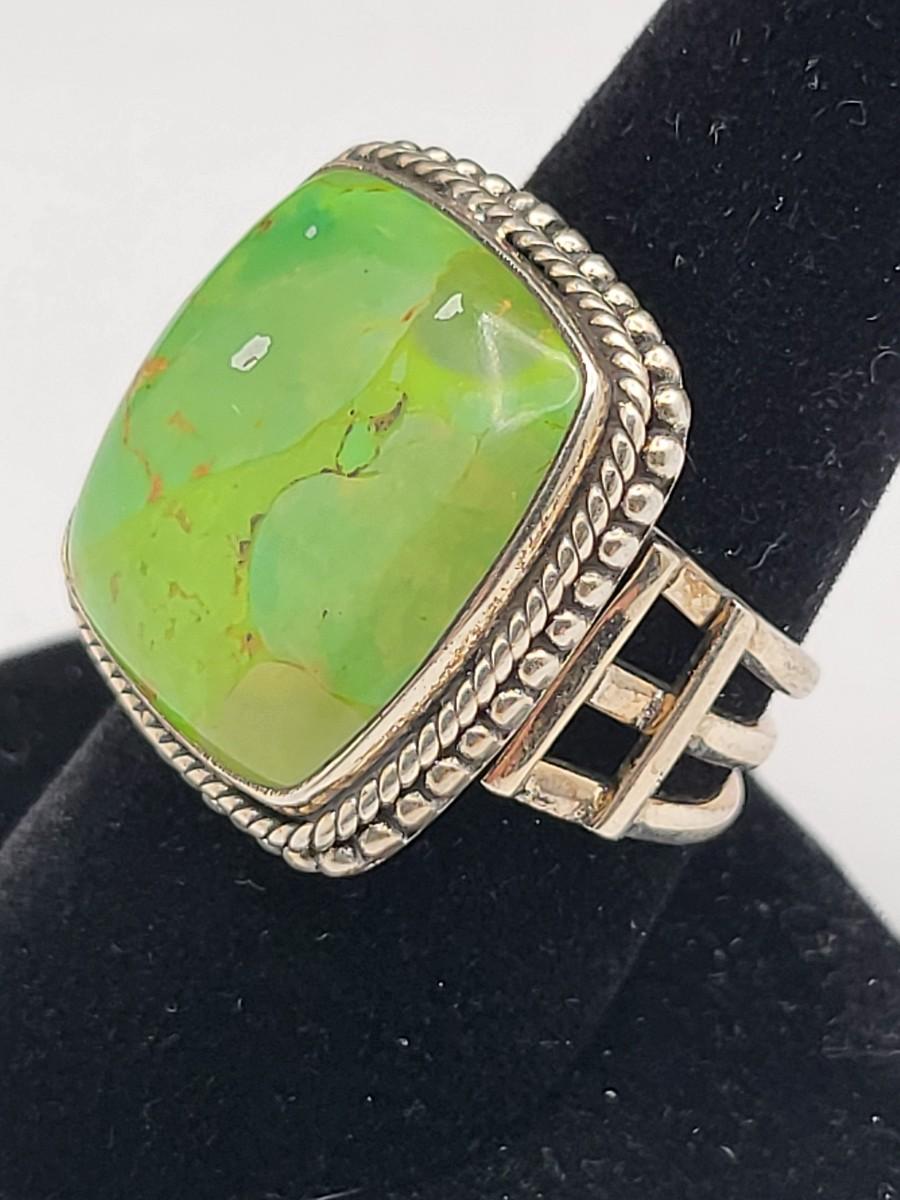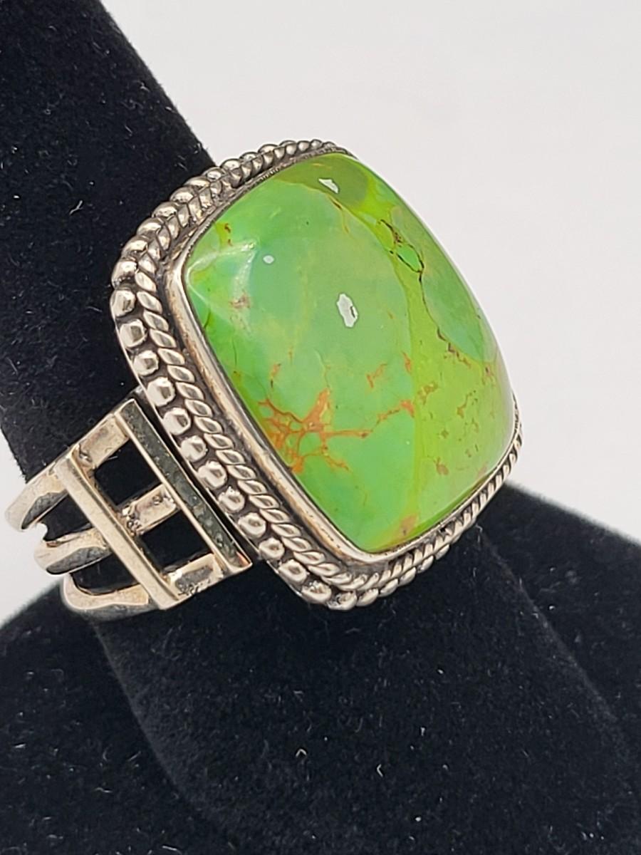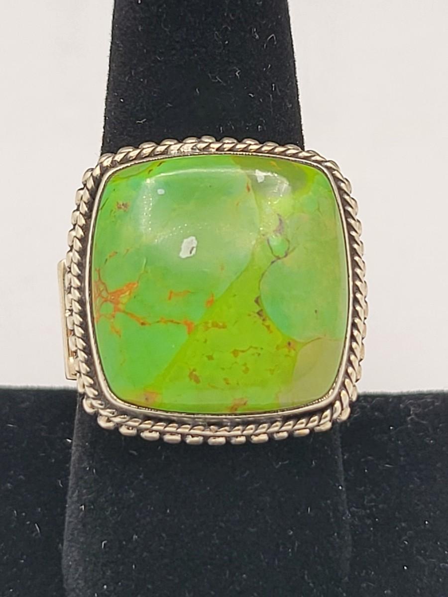 Hand crafted, attractive polished green turquoise ring, framed in a fancy 925 sterling silver bezel setting and open band. Face of the ring is 1" x 1". Size 9.5. Weighs 11 grams.
