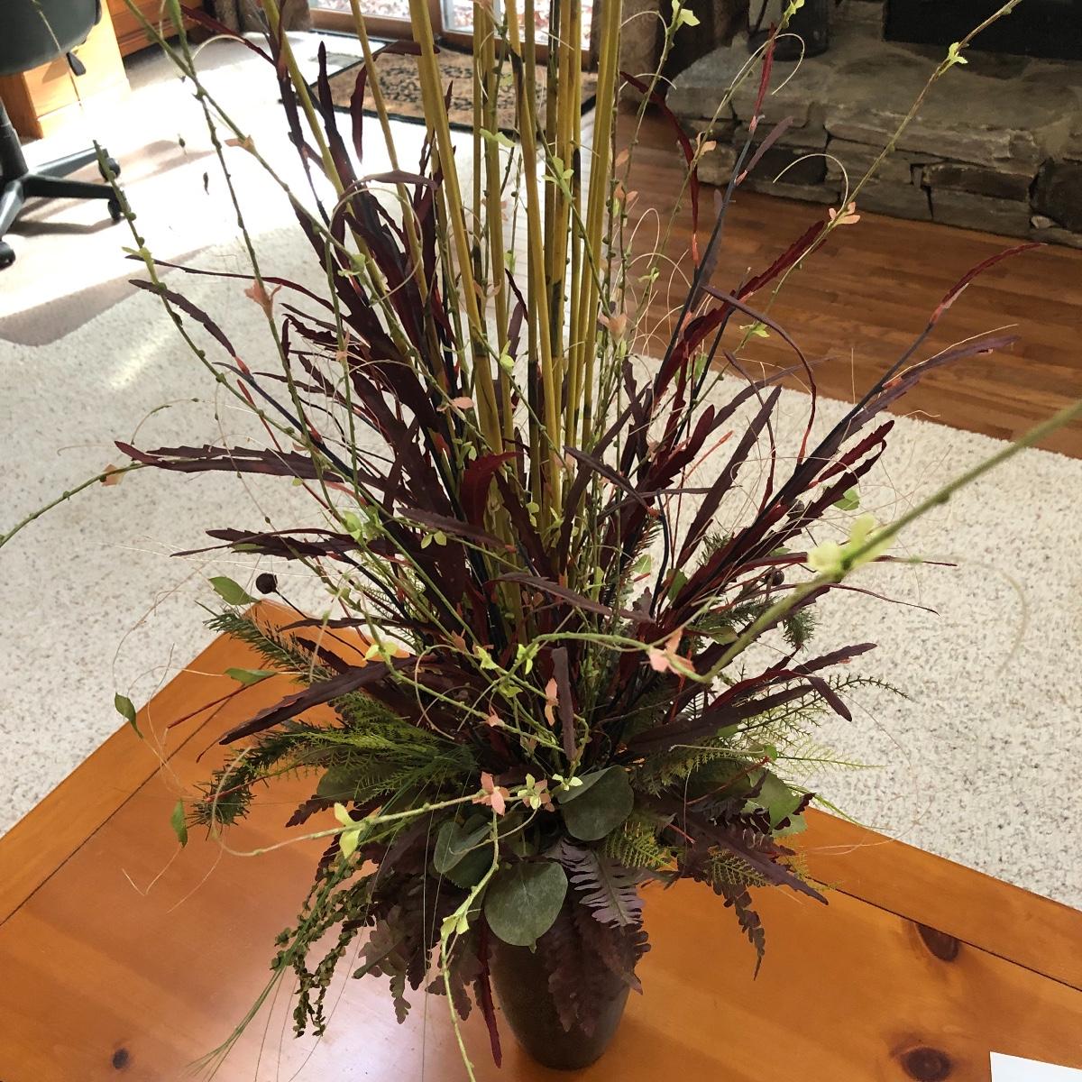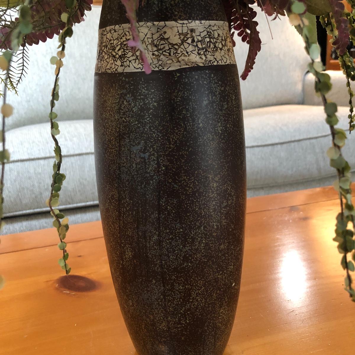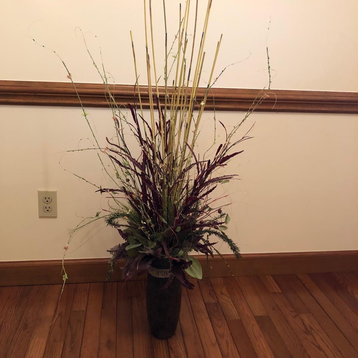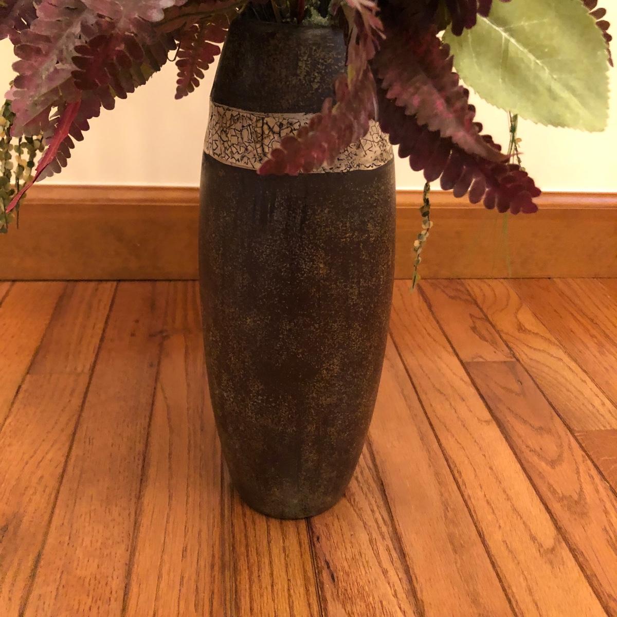 The vase is about 4.5” in diameter and 43” tall. It boasts red and green foliage. Vase appears to be ceramic. Local pick up only.