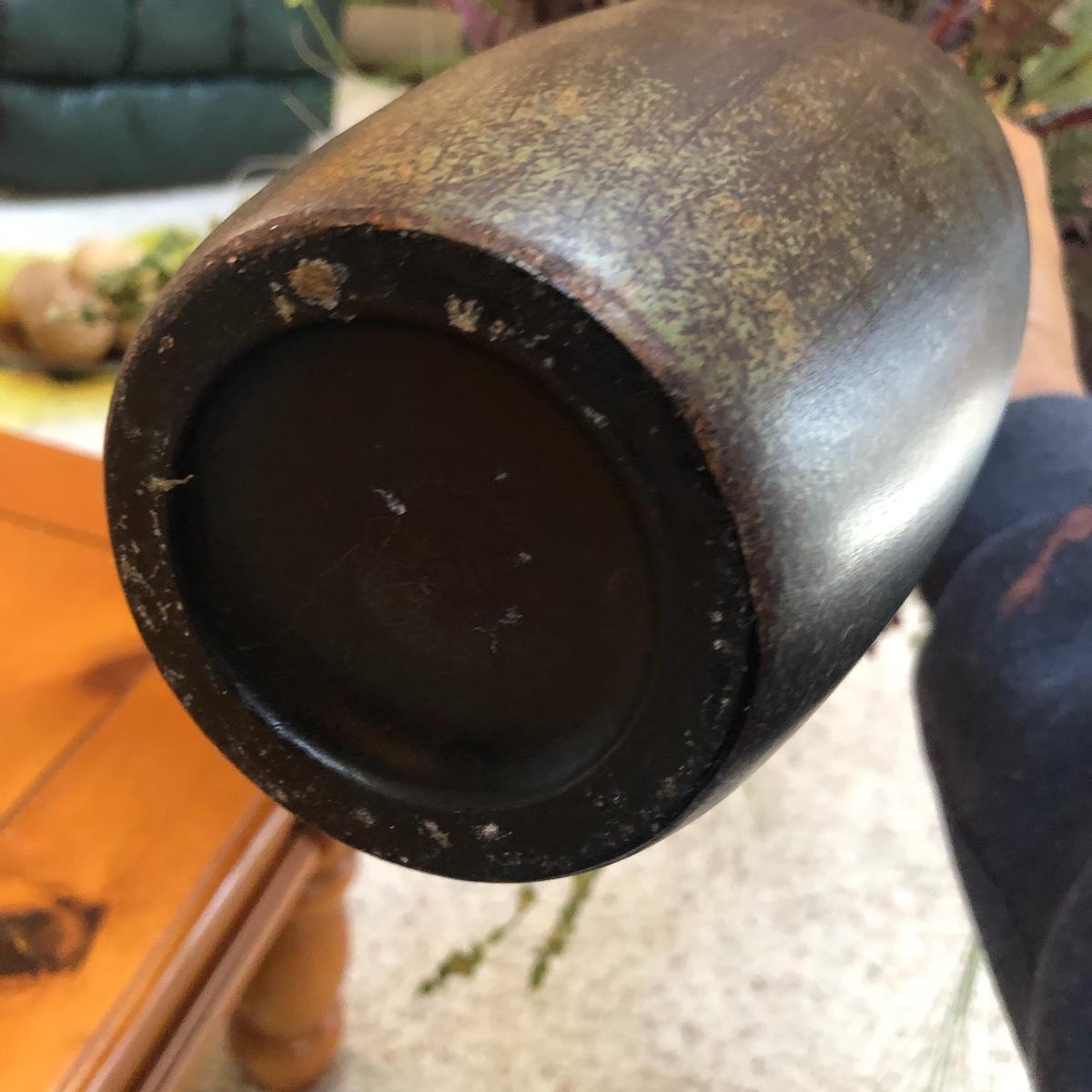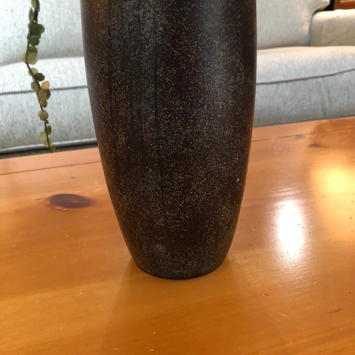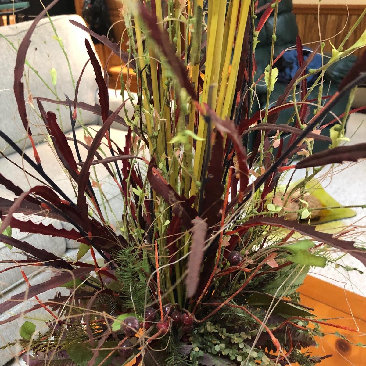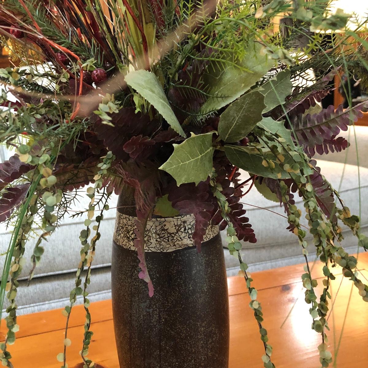 The vase is about 4.5” in diameter and 43” tall. It boasts red and green foliage. Vase appears to be ceramic. Local pick up only.