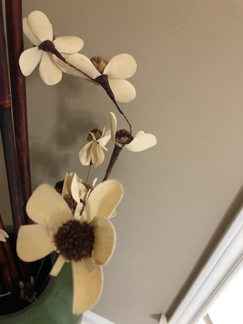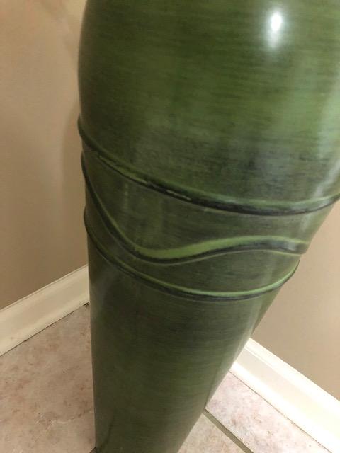 Vase is 26” tall and 9” in diameter at it’s larger part. Flowers are made from wood shavings.