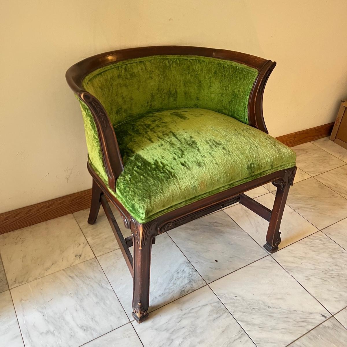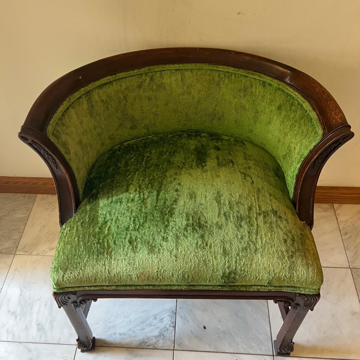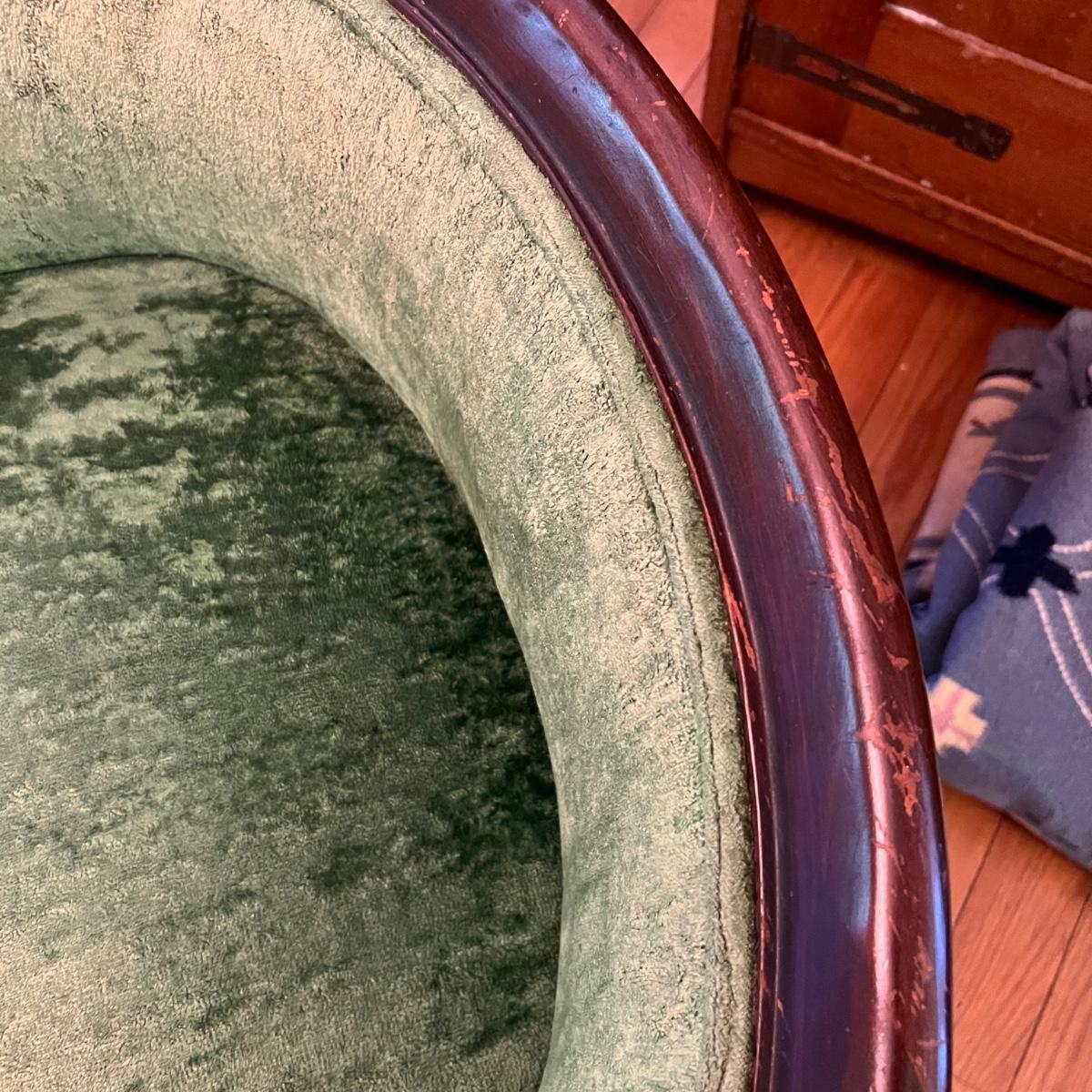 This stunning green velvet chair has what appears to be a mahogany wood frame. See image that shows where the biscuit joins on the underside center stabilizing rod have pulled apart slightly; this should be an easy fix. Also a few light scuff marks on the top of the back rest.