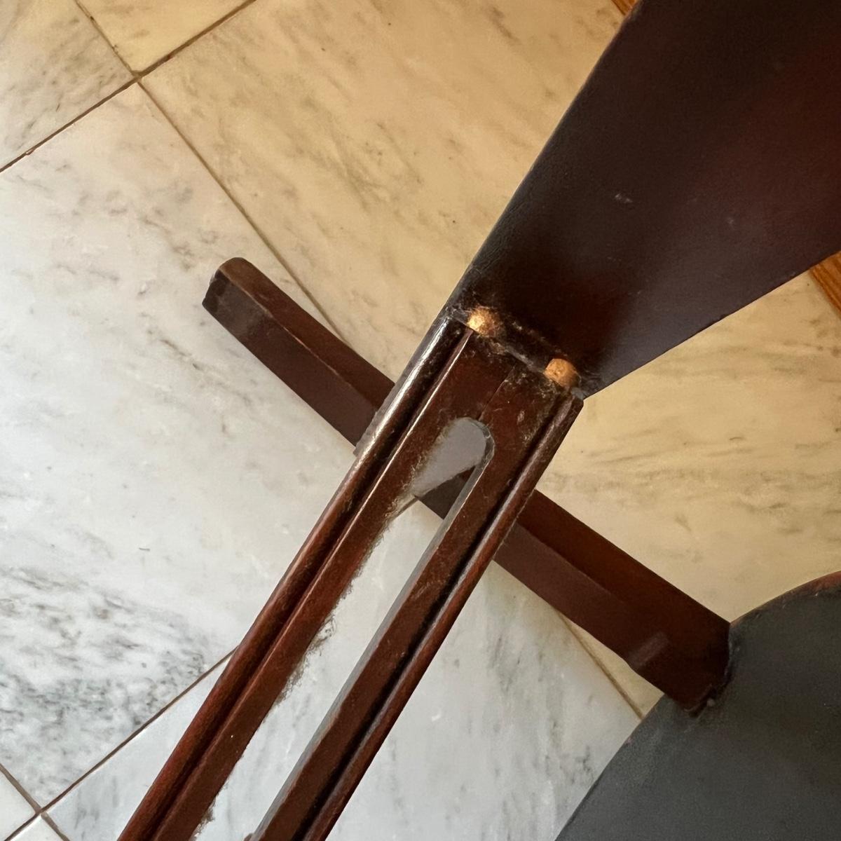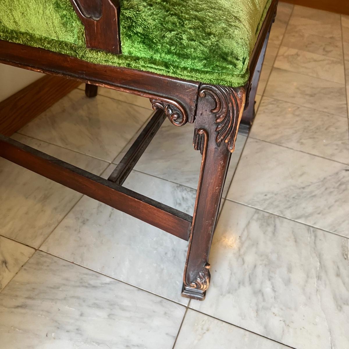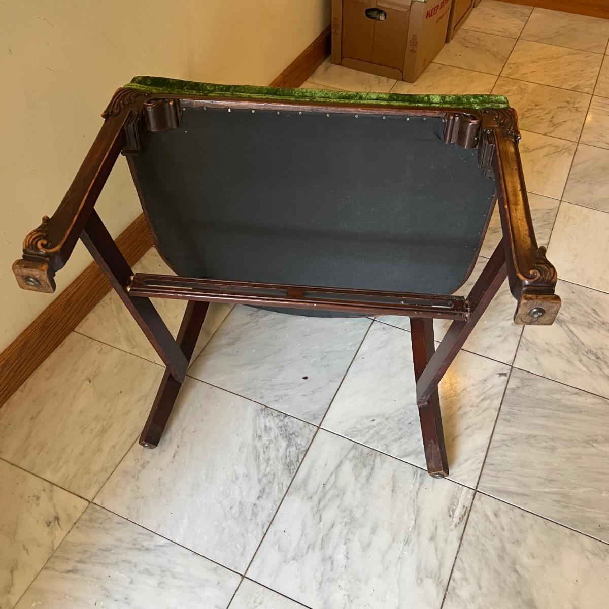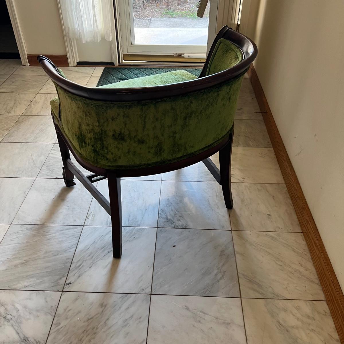 This stunning green velvet chair has what appears to be a mahogany wood frame. See image that shows where the biscuit joins on the underside center stabilizing rod have pulled apart slightly; this should be an easy fix. Also a few light scuff marks on the top of the back rest.