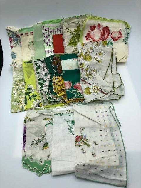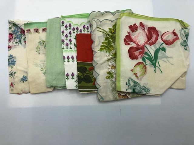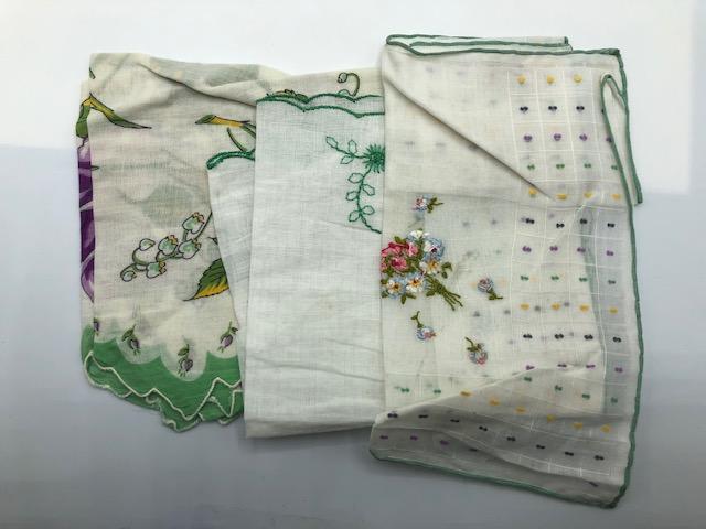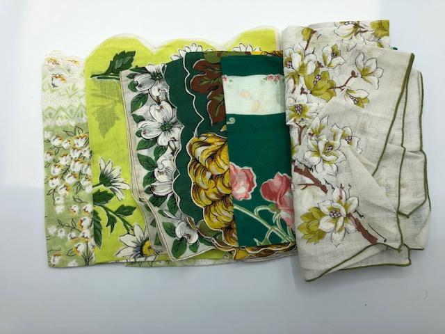 Vintage handkerchiefs in shades of green. Variety of patterns, designs, sizes, & materials. These are vintage and used, there mat be spots and discoloration.