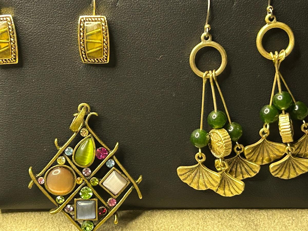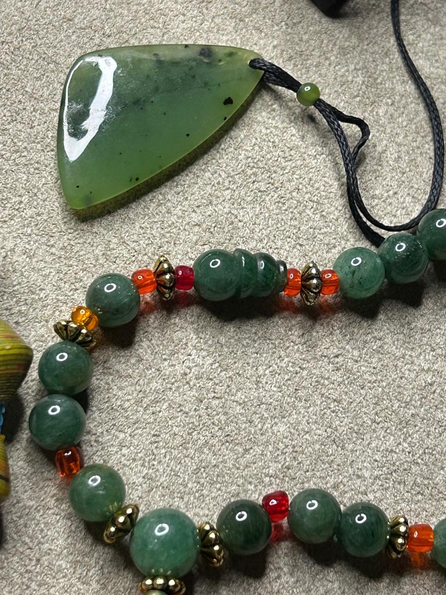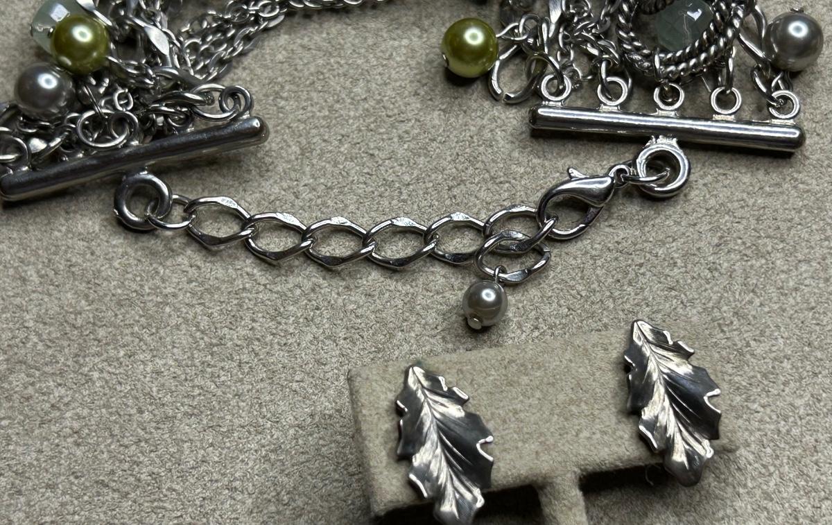 All pierced except for the small baby blue ones. The very long necklace is paper beads & beaded spacers. The pendant is Lia Sophia & earrings above are Monet. The multi color bracelet is Sarah Cov & glows in the blue light. I think the leaf earrings are sterling (started to shine them up). The 2 green stone necklaces are stone of some sort.