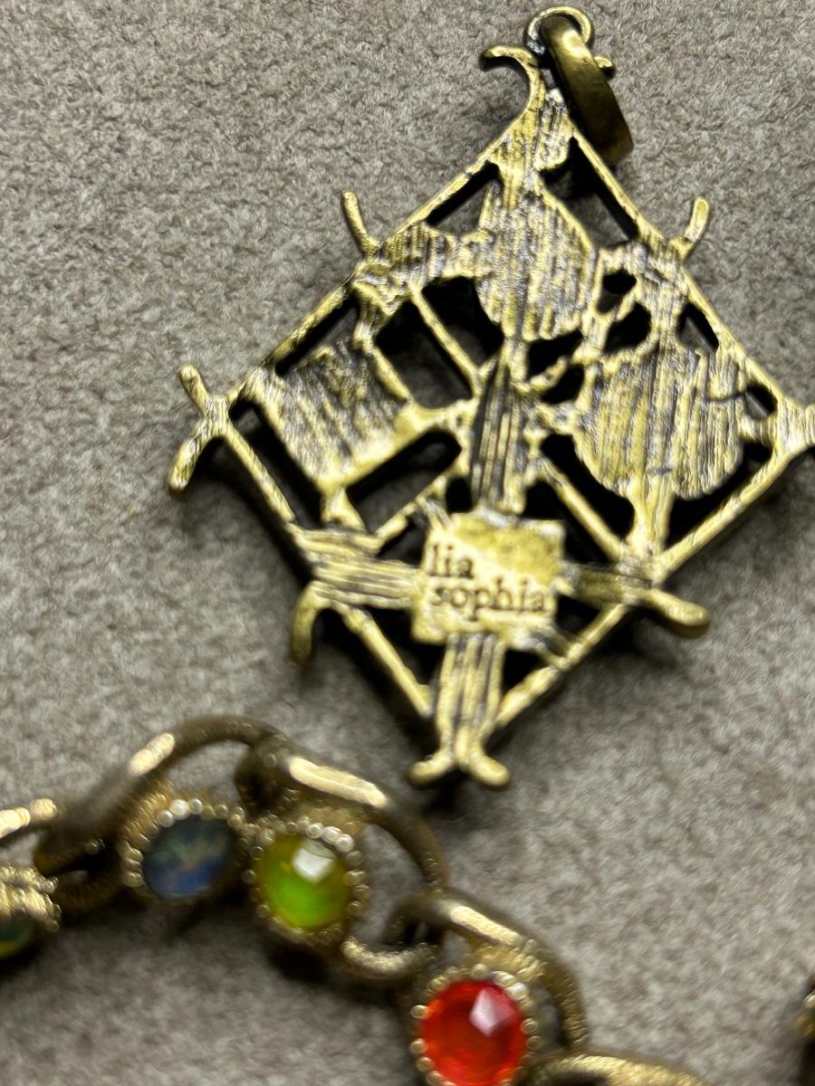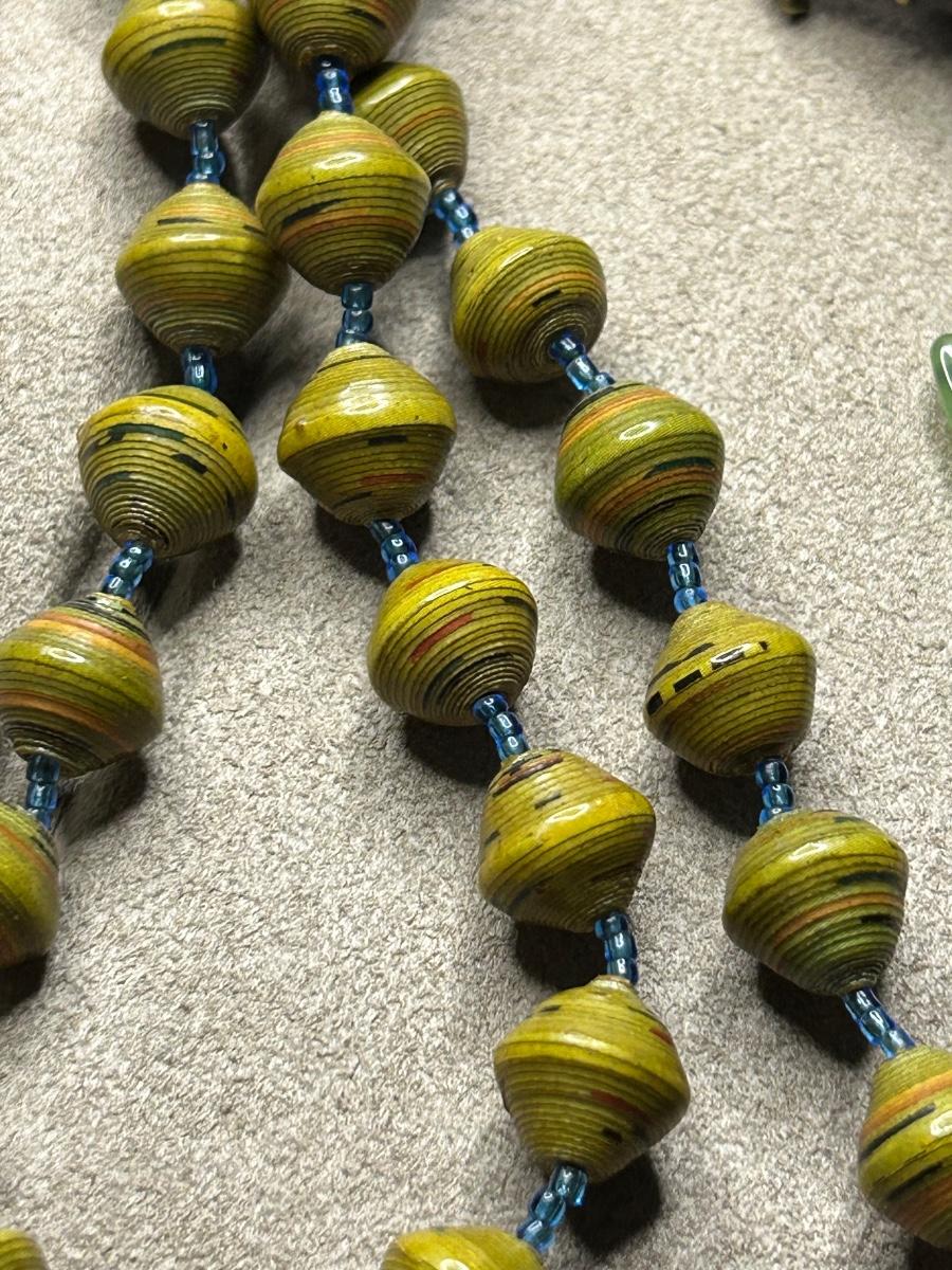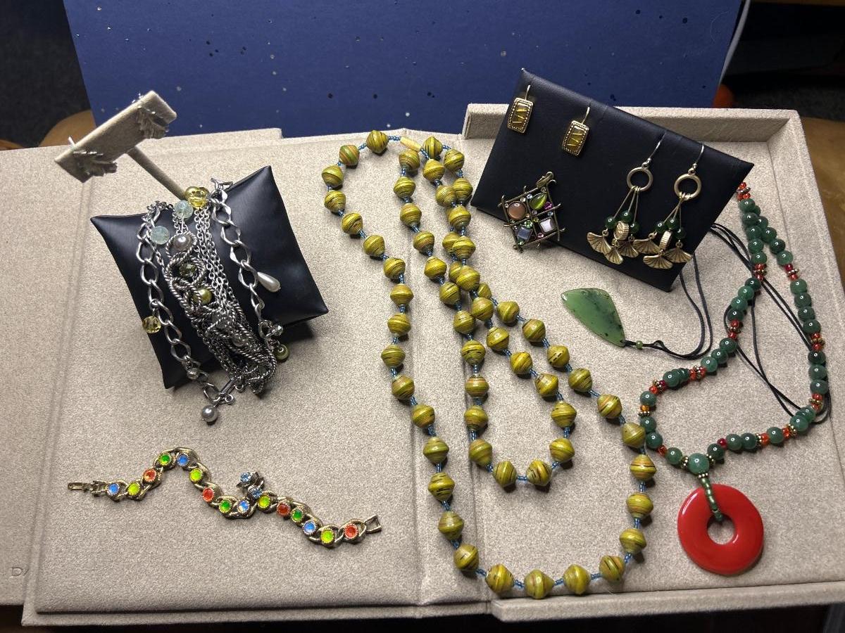 All pierced except for the small baby blue ones. The very long necklace is paper beads & beaded spacers. The pendant is Lia Sophia & earrings above are Monet. The multi color bracelet is Sarah Cov & glows in the blue light. I think the leaf earrings are sterling (started to shine them up). The 2 green stone necklaces are stone of some sort.