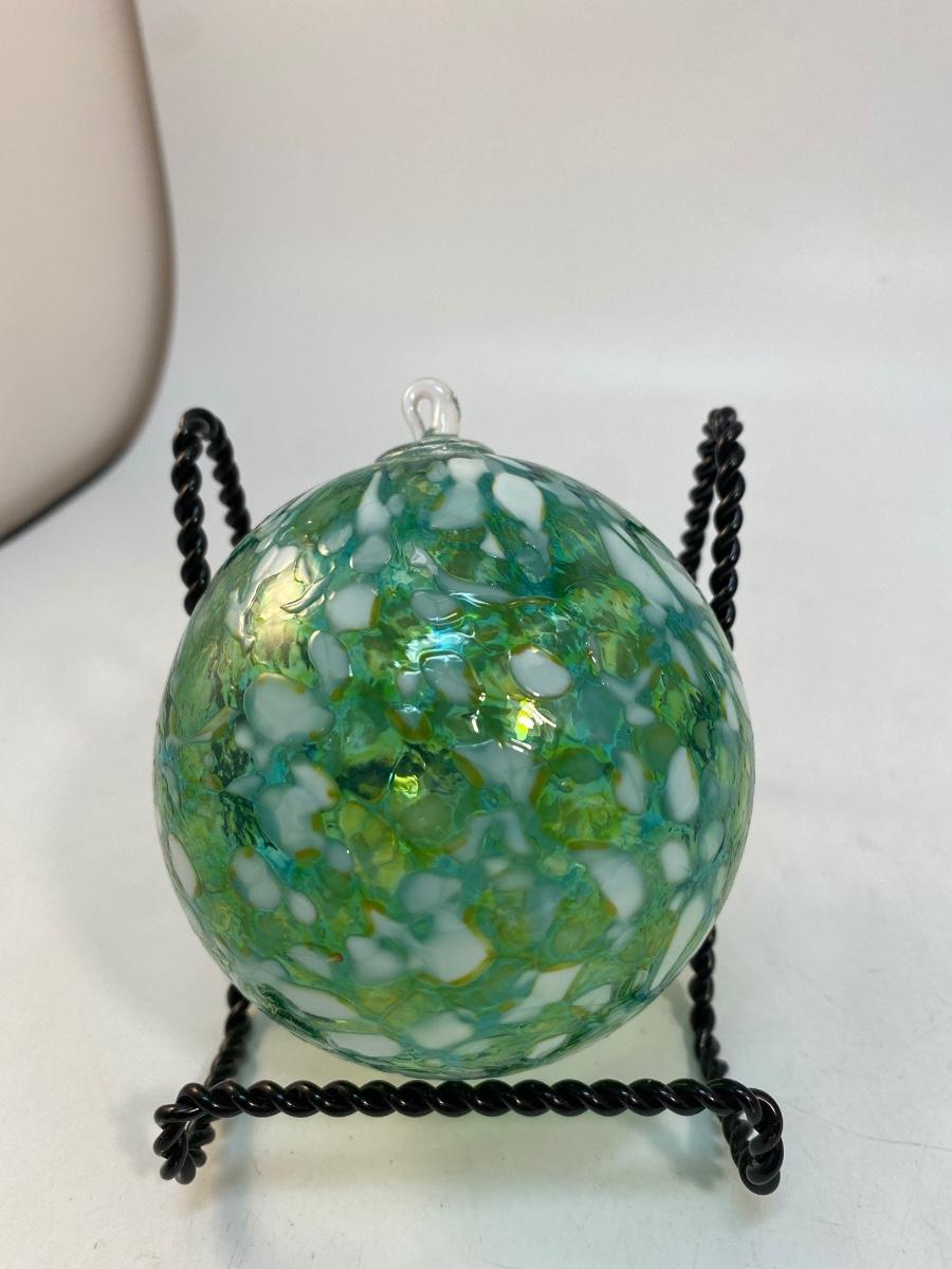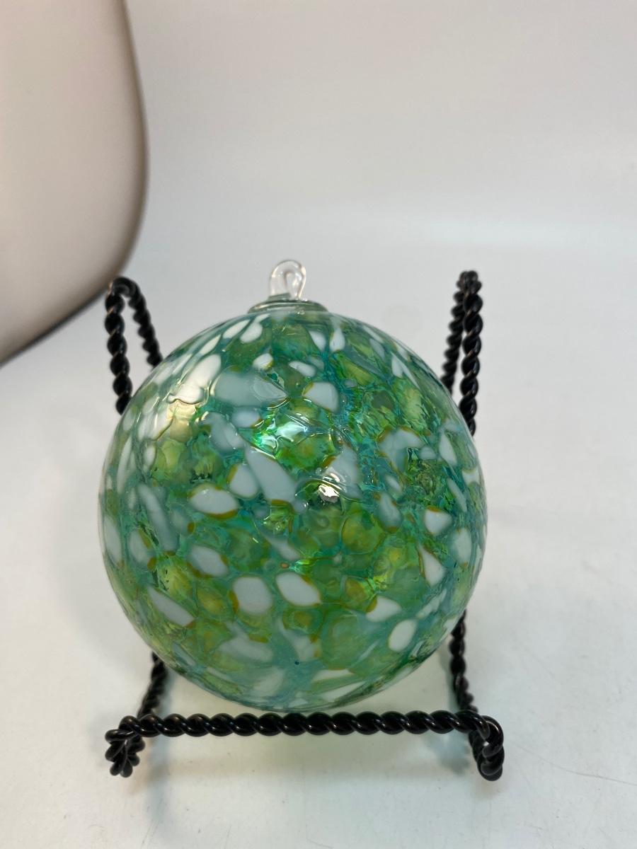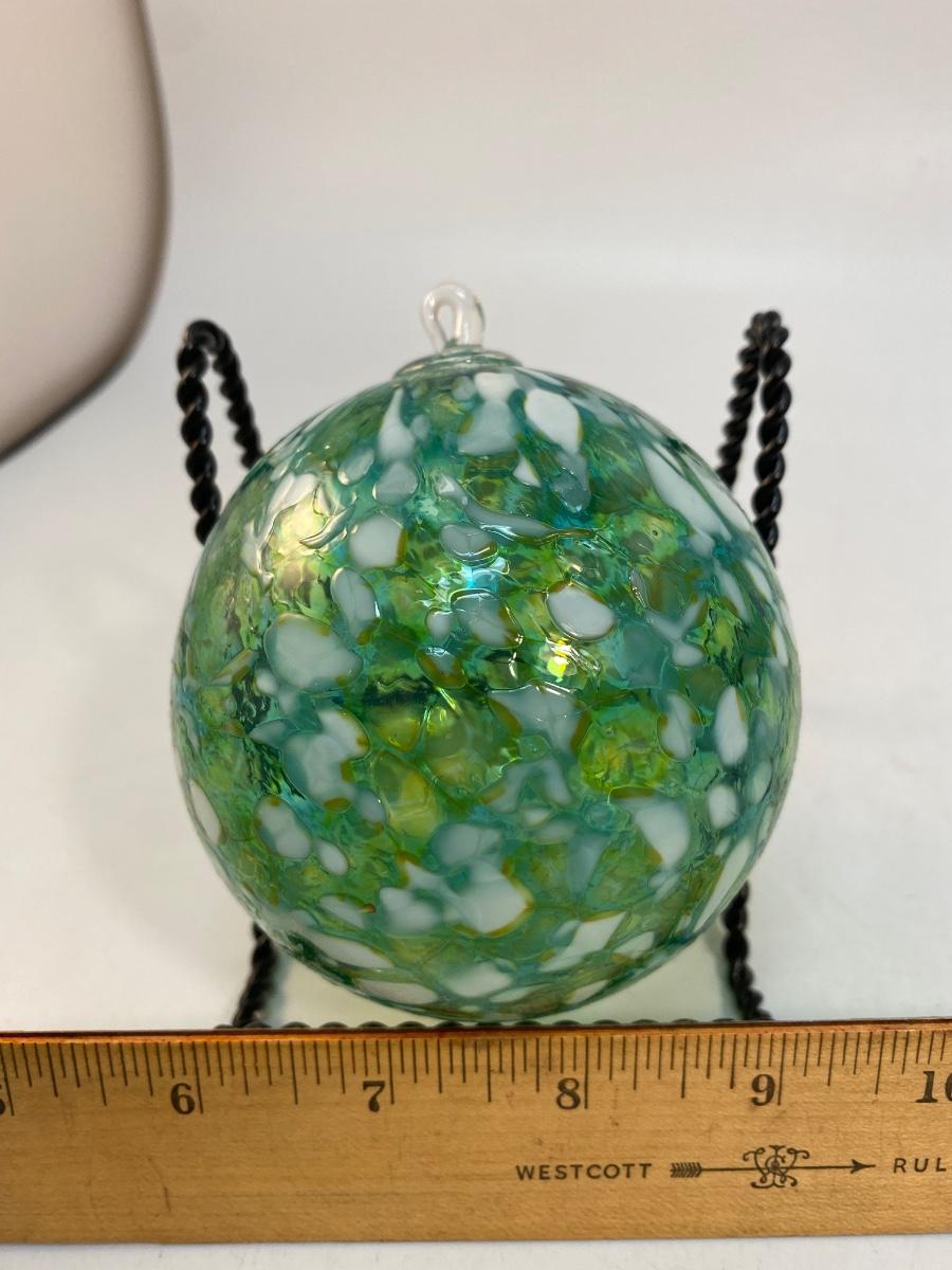 Green & White Iridescent Speckled Hand Made Blown Glass Hanging Ornament Orb Suncatcher. In good condition. Slight iridescence to glass. About 3" size.