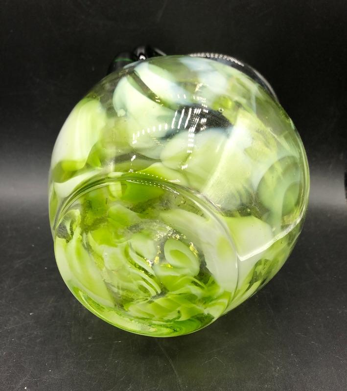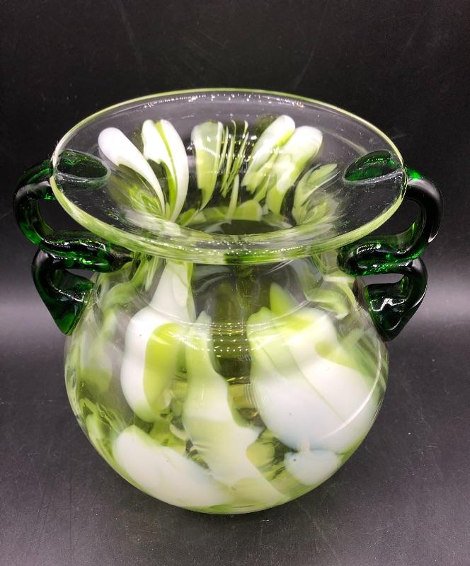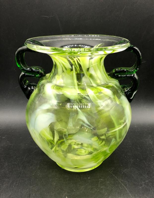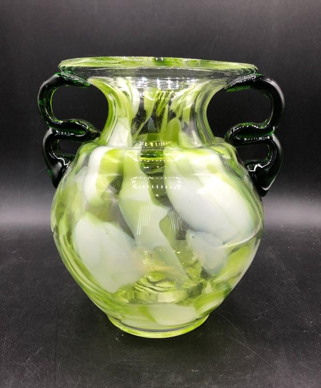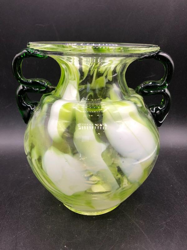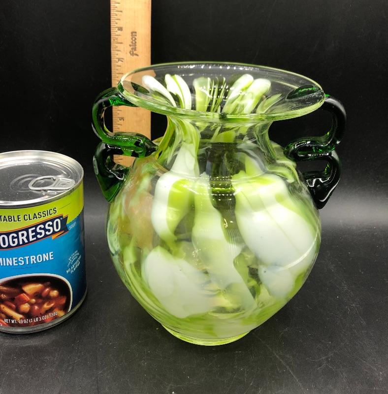 Green & white swirl art glass vase. Blown glass. Dark green glass handles on the side. Light green glass with white swirled in body. Great condition. Stands about 7" tall. Displays nicely.