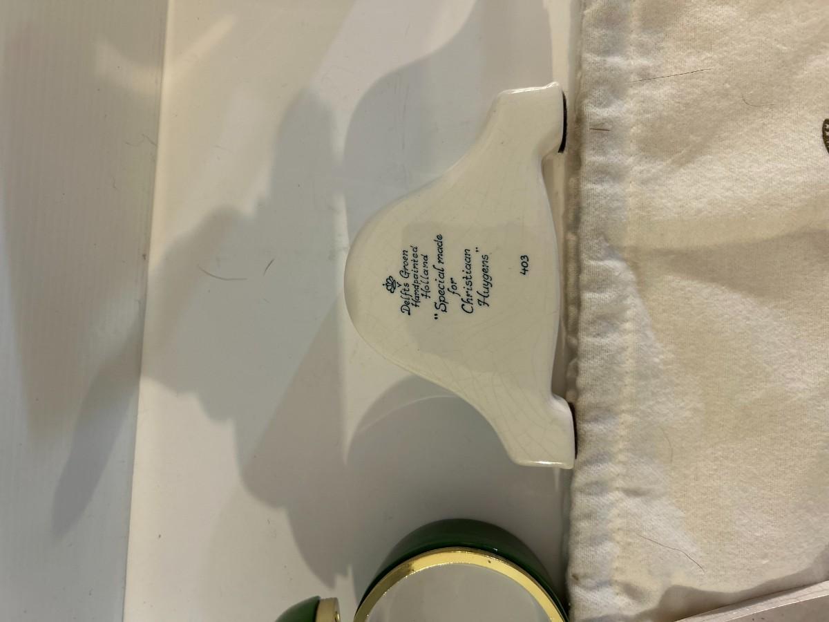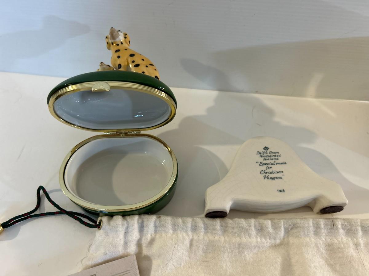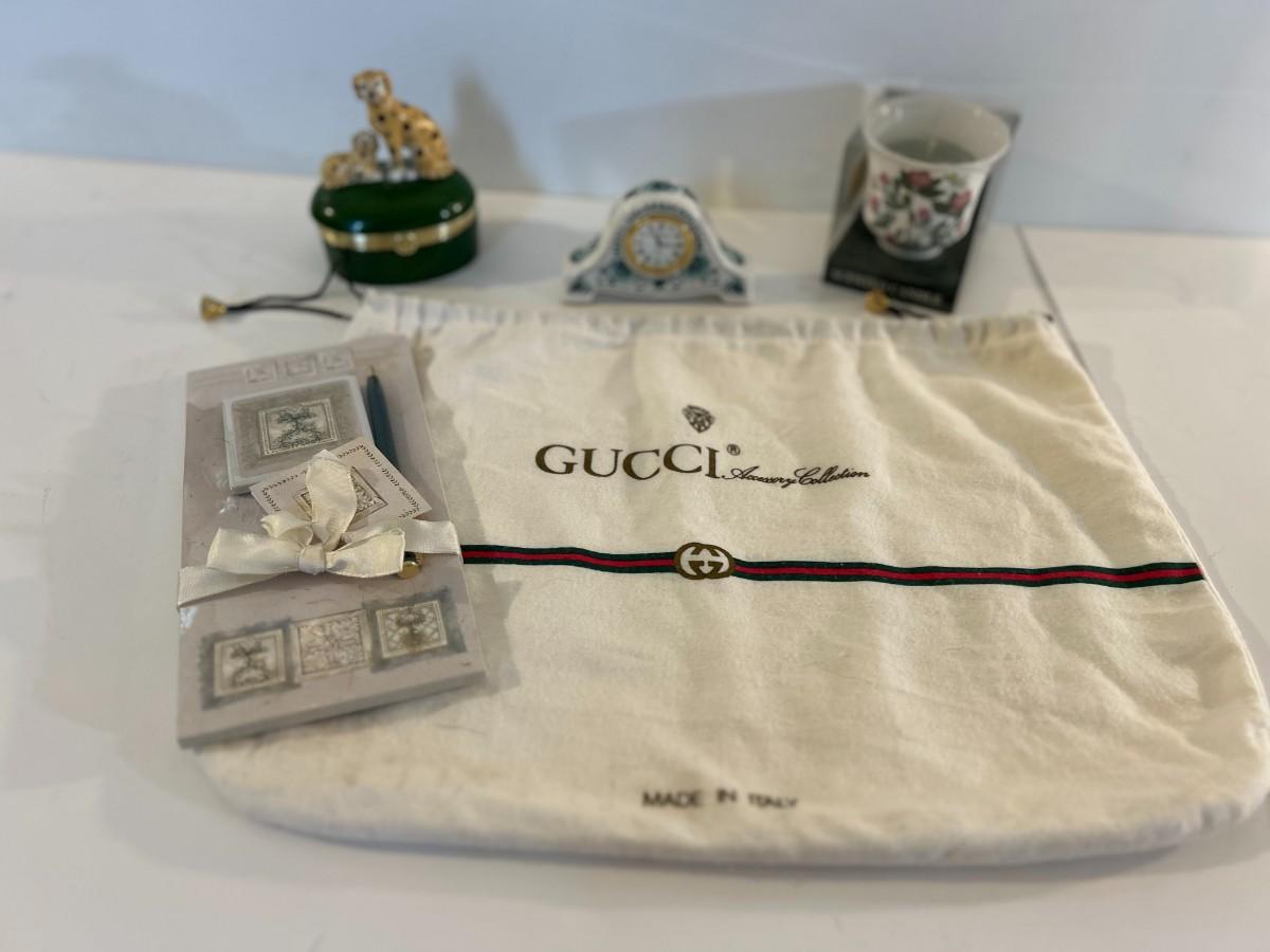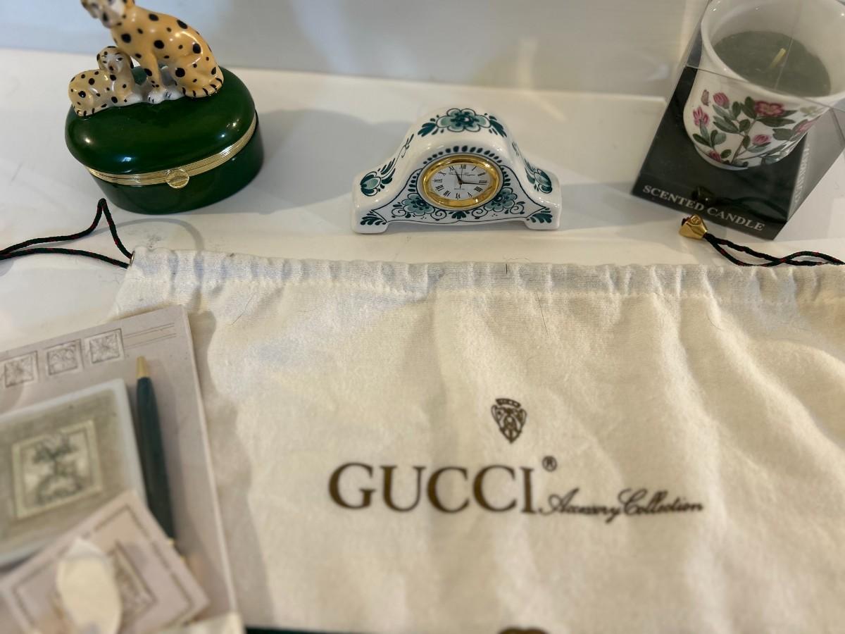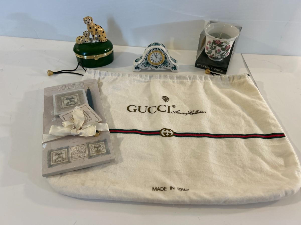Gucci dust bag, Delfts Green hand painted clock, vintage Fritz and Floyd hinged trinket box with other goodies.