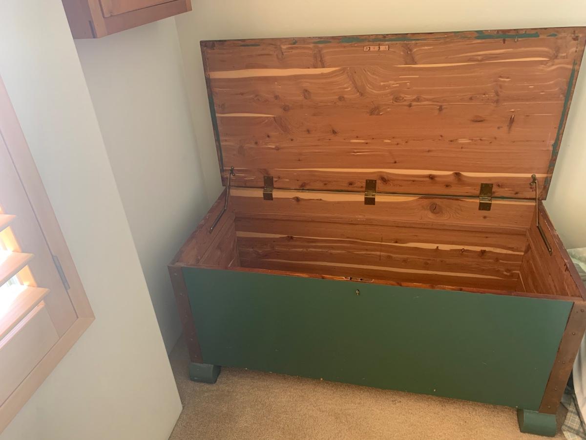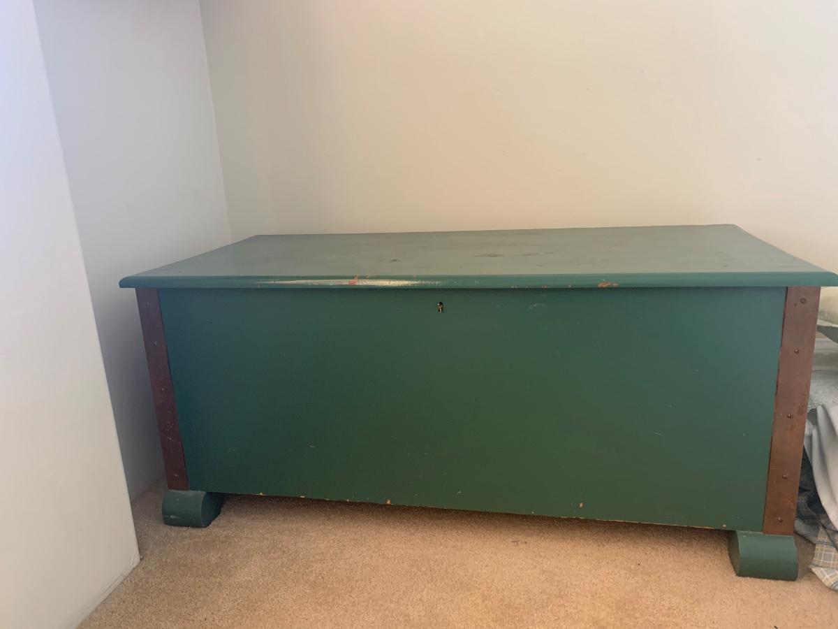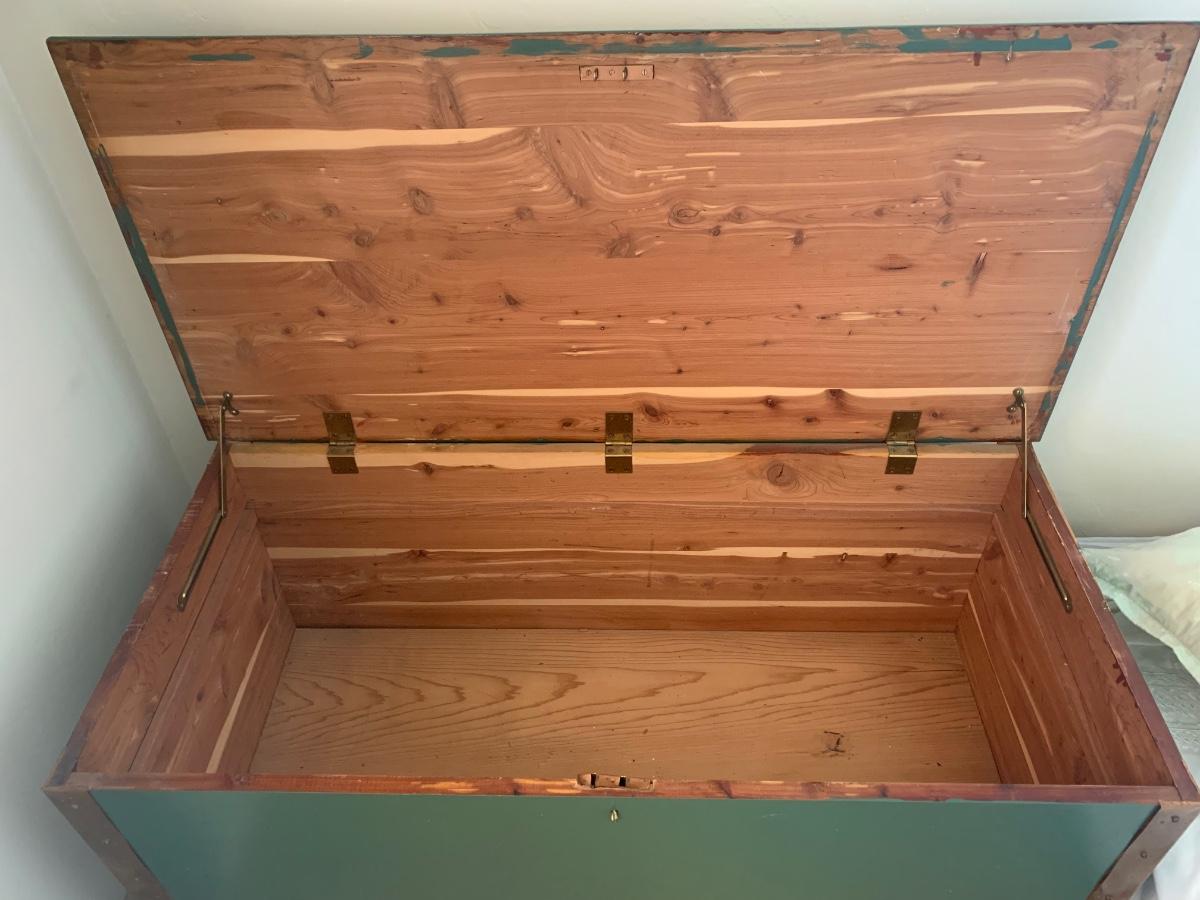 45x21x19 cedar chest with copper metal on the edges, heavy wear on top but inside is good