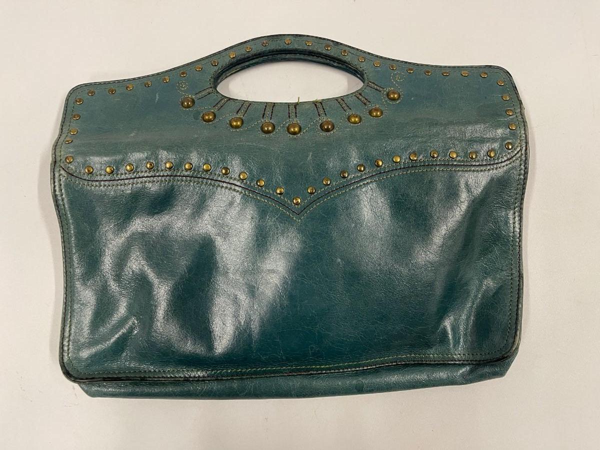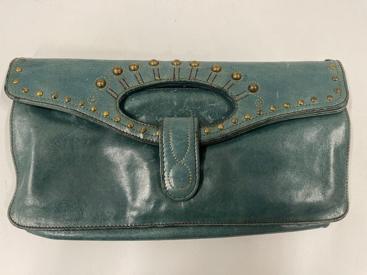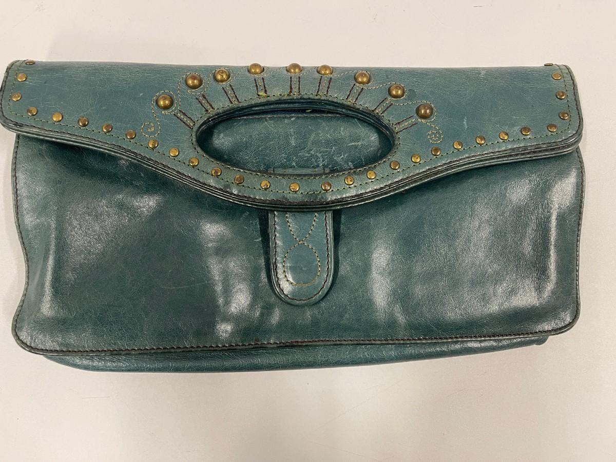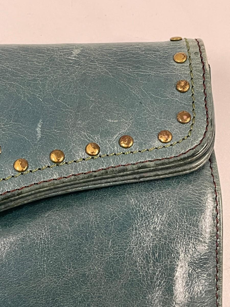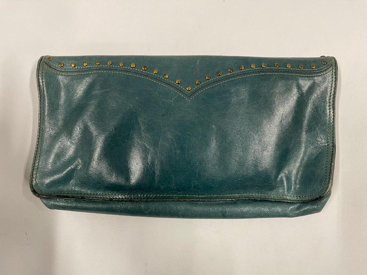 Green leather Hobo clutch with brass nail head accents. Shows some wear mostly at edges and corners.