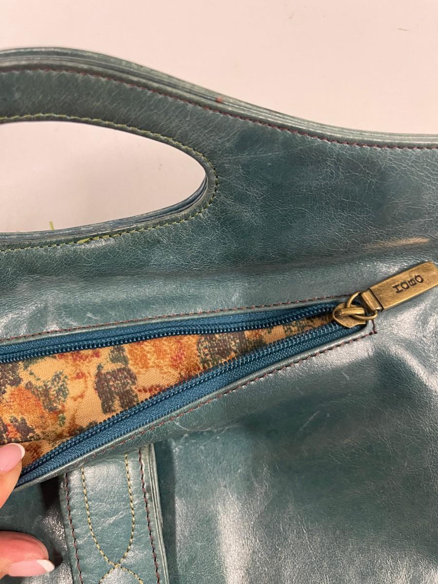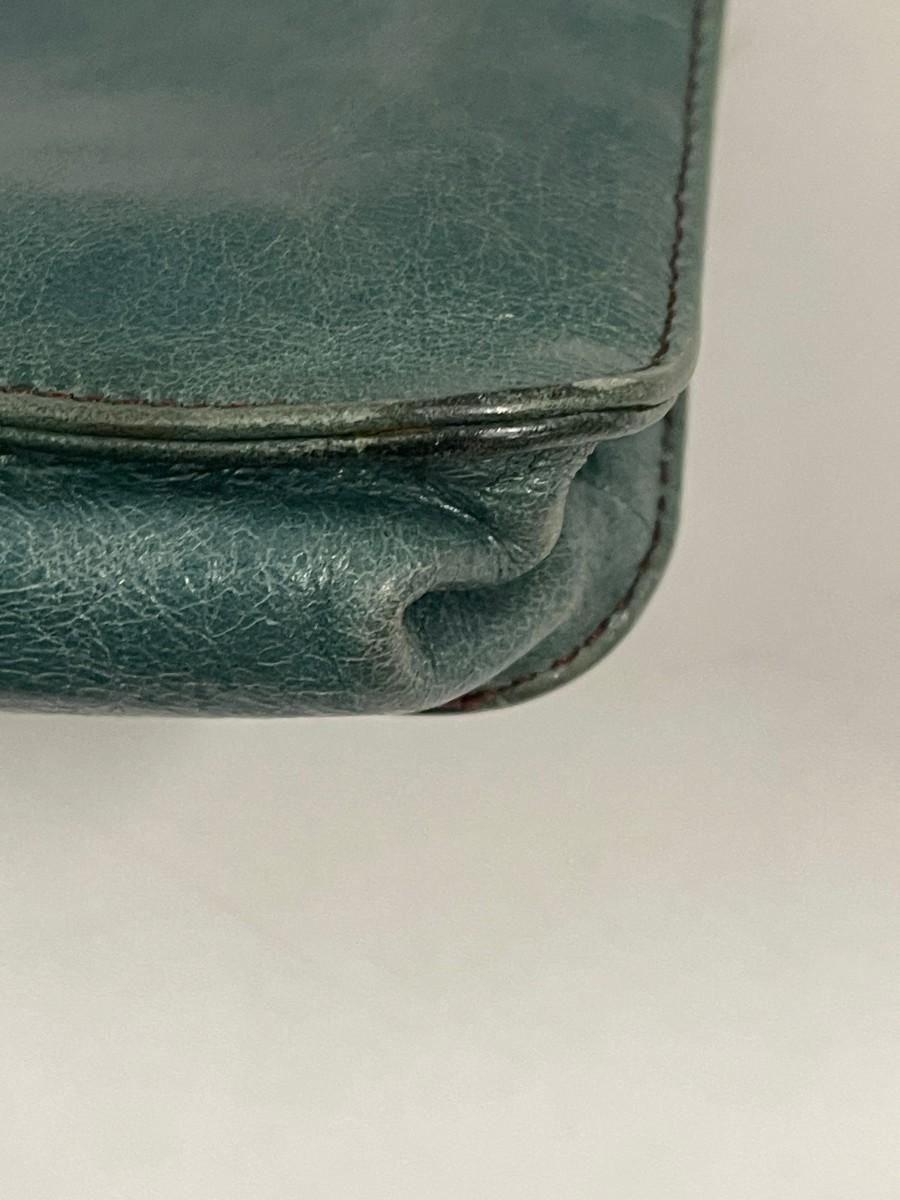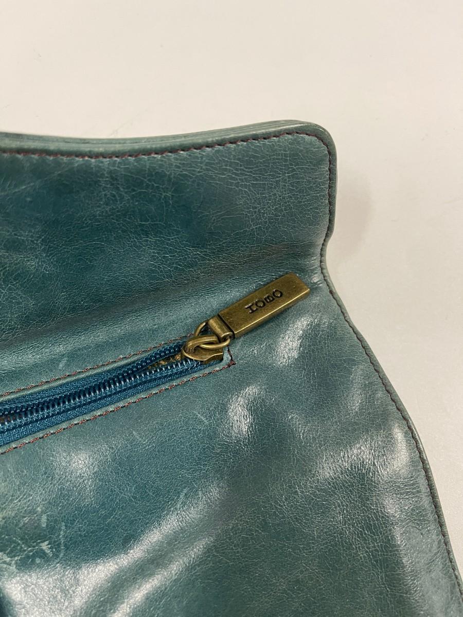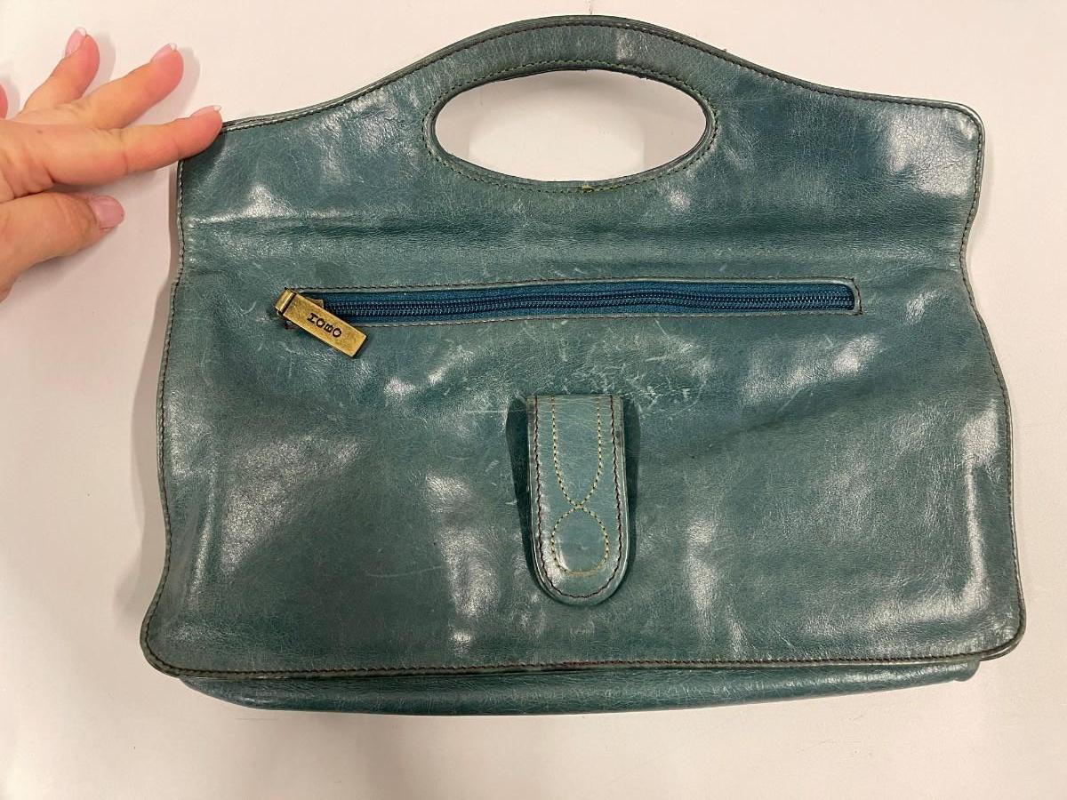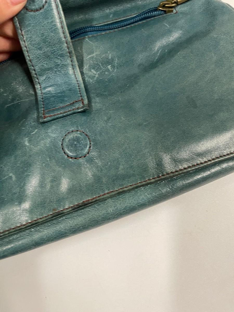 Green leather Hobo clutch with brass nail head accents. Shows some wear mostly at edges and corners.