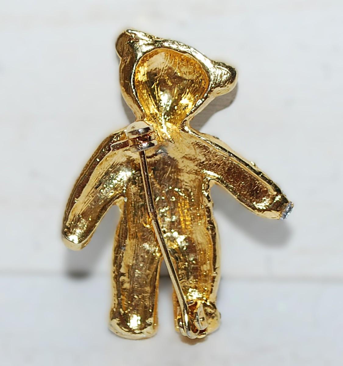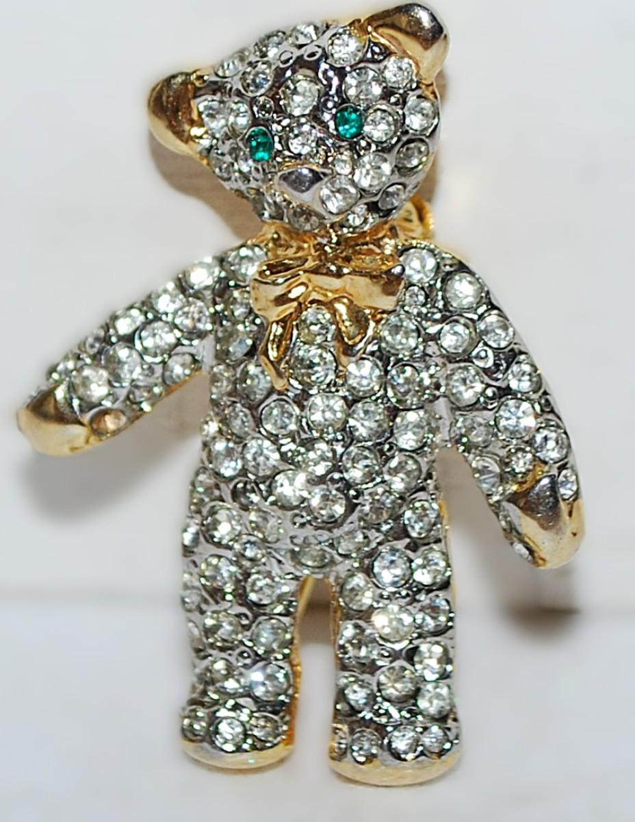 GREEN-EYED Bejeweled BEAR BROOCH (1½" x 1") with Bowtie on a Gold Tone Setting