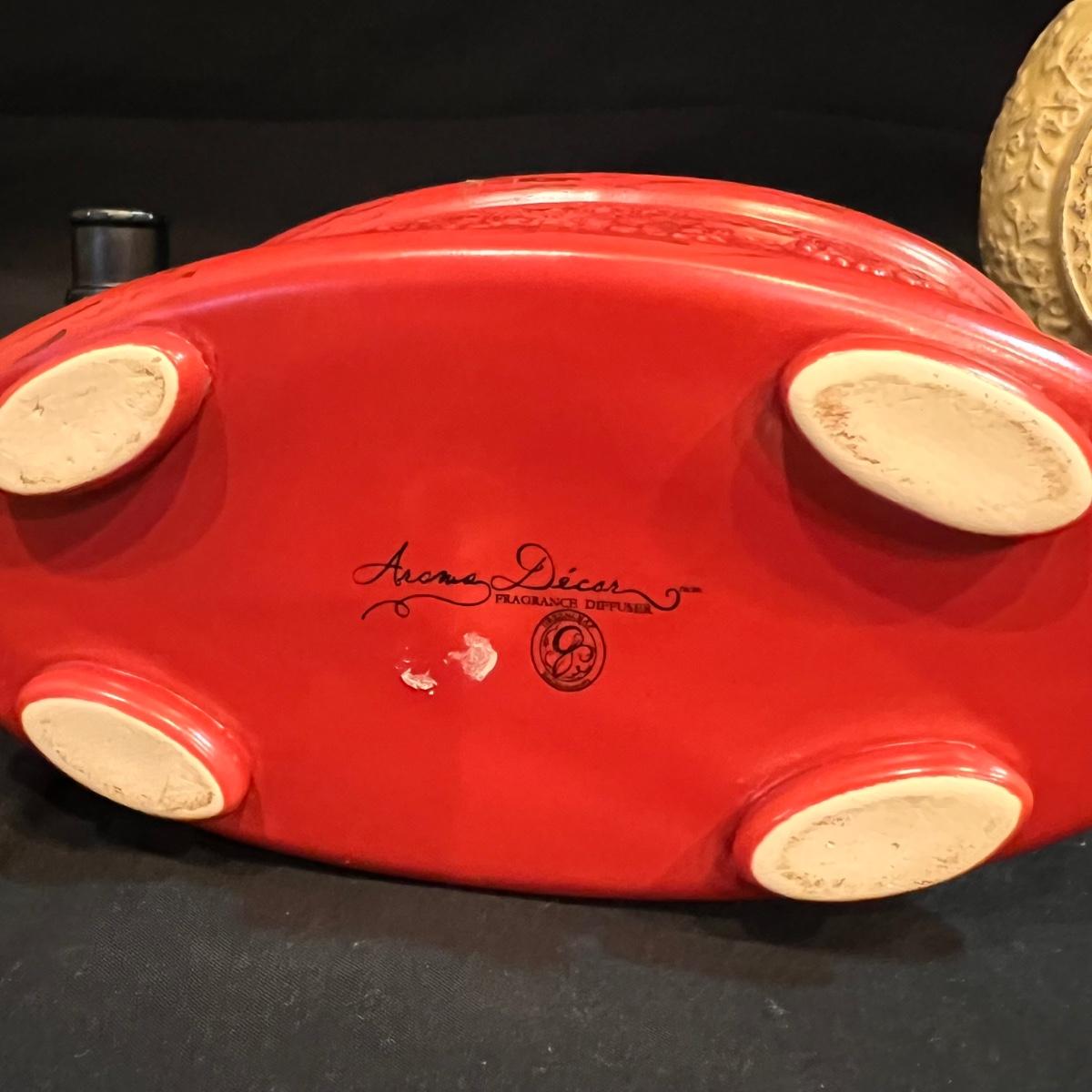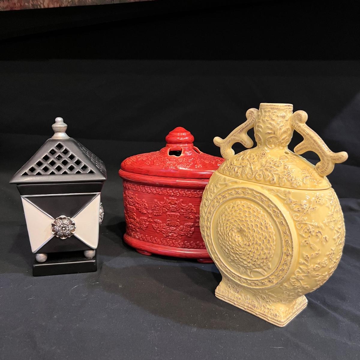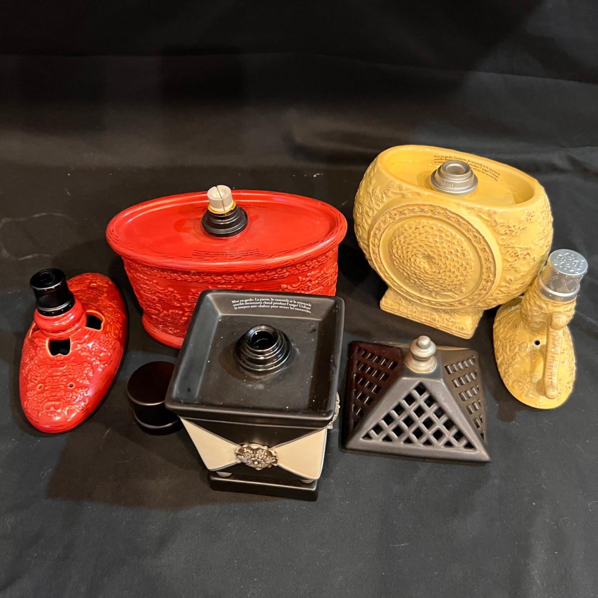 Three ceramic fragrance lamps. The red lamp has a wick, the others do not.