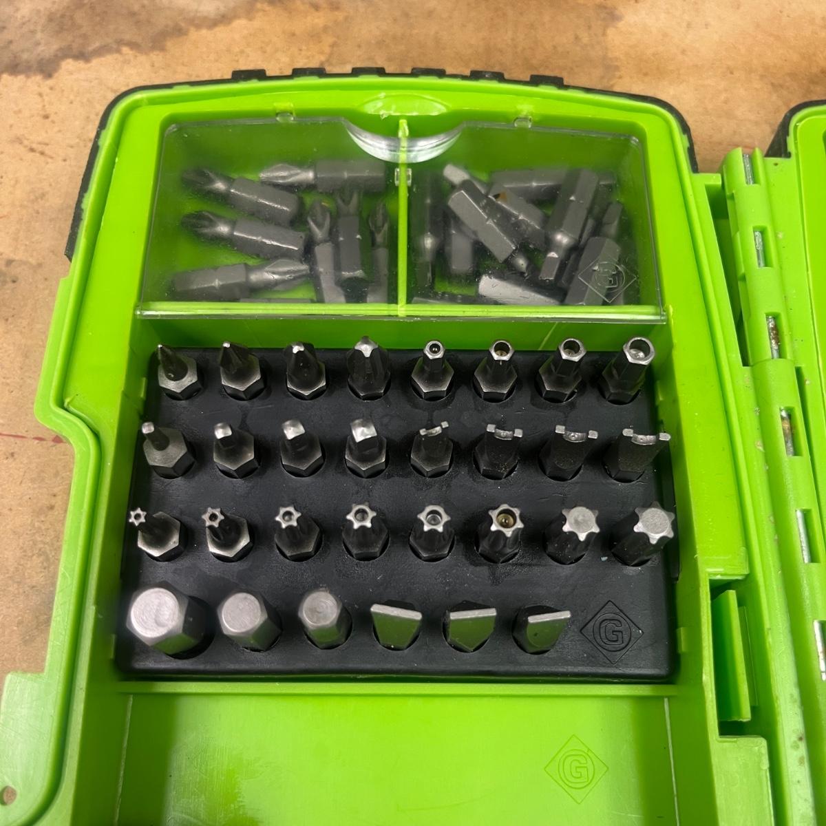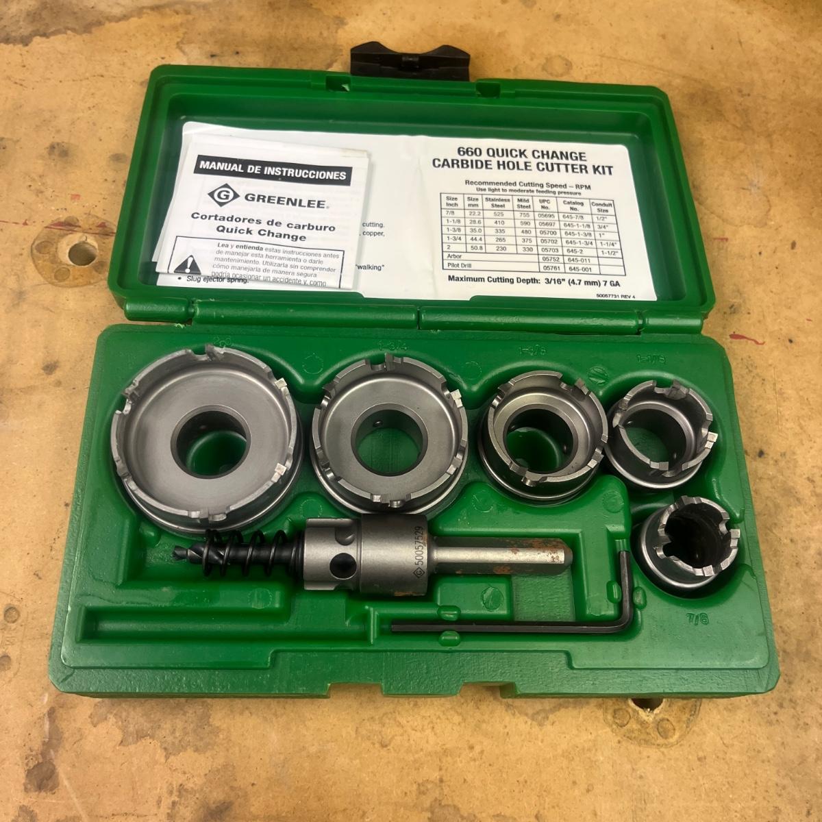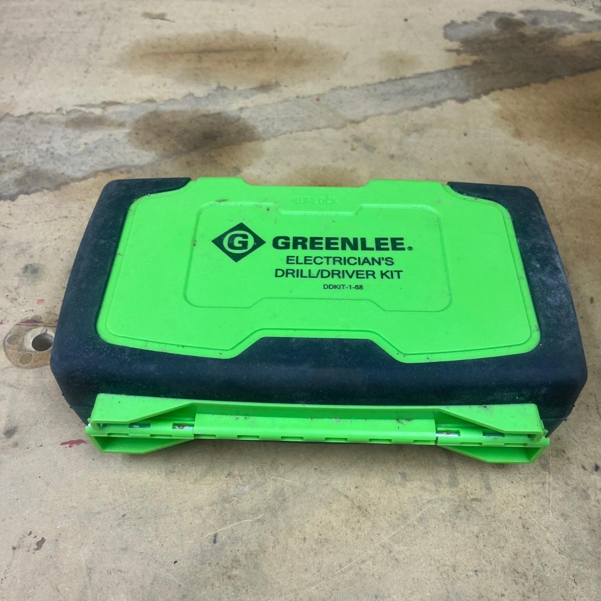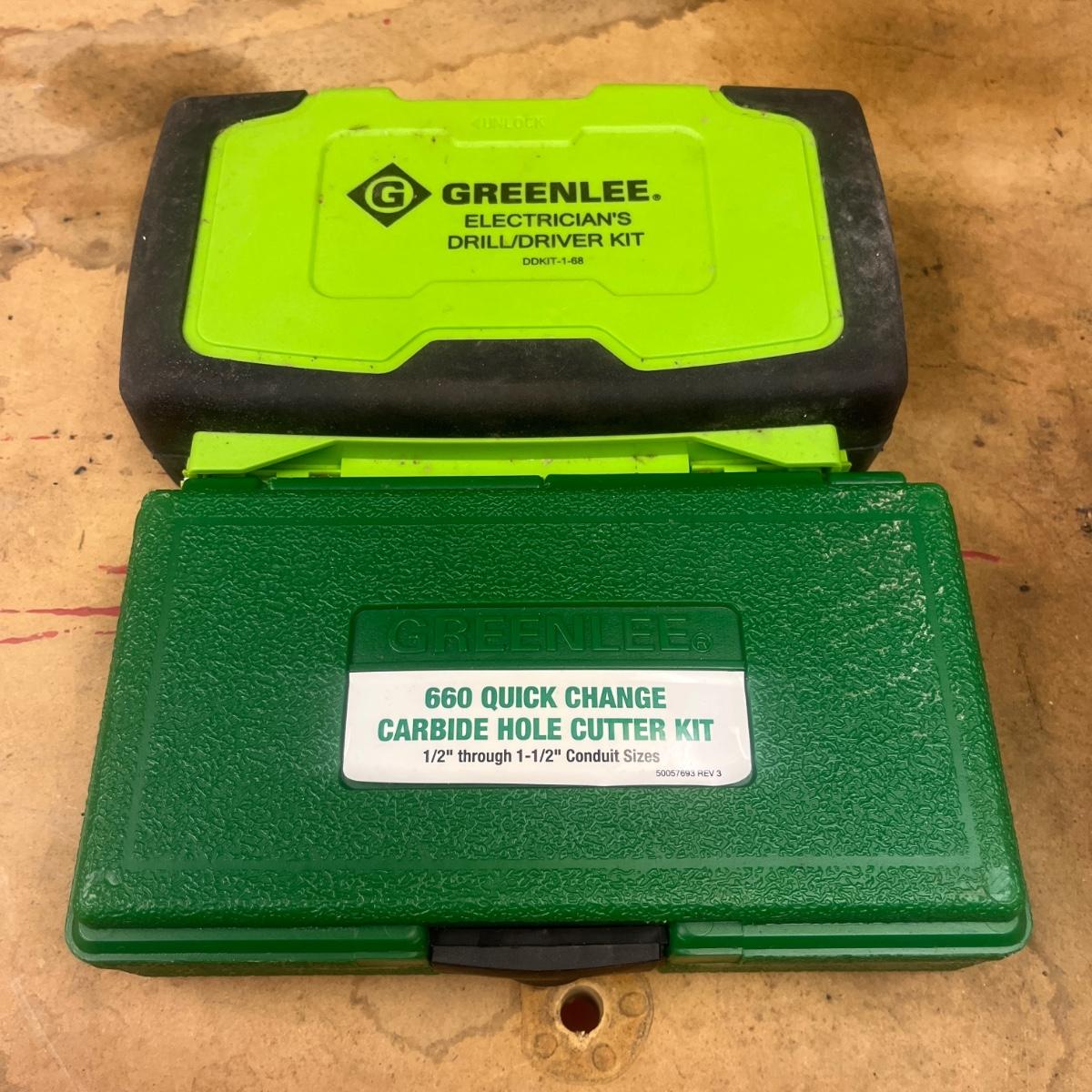 Lot includes a Greenlee 660 quick change carbide hole cutter kit in plastic storage box and a Greenlee Electricians drill driver kit in a plastic storage box. Drill and driver box measures 7.5” x 2” x 5”H. It appears one bit is missing from driver kit, see pictures.