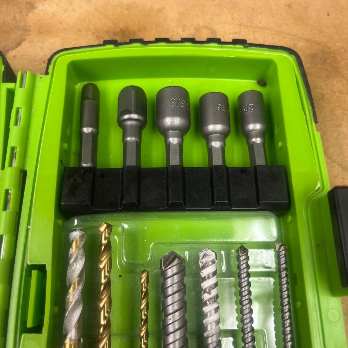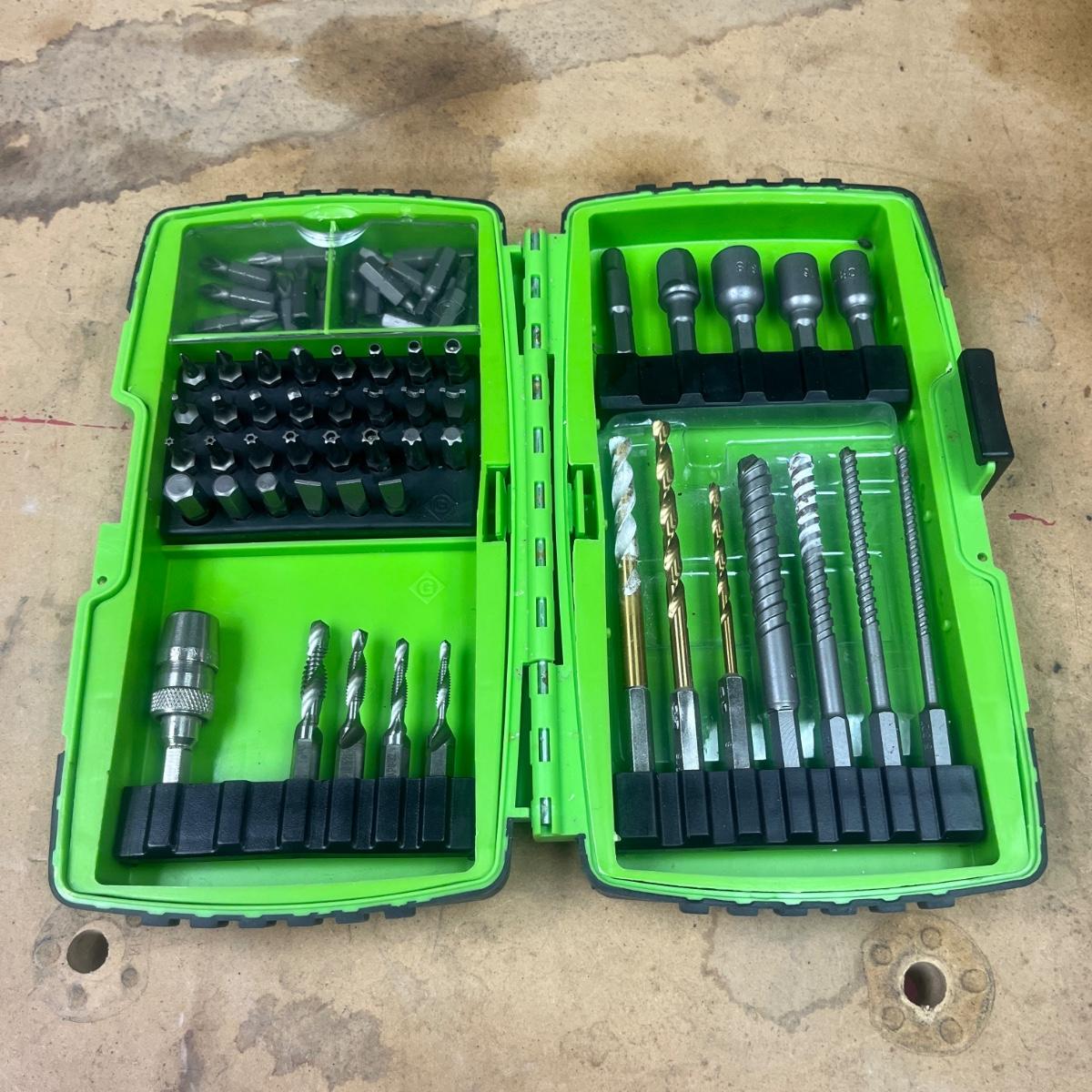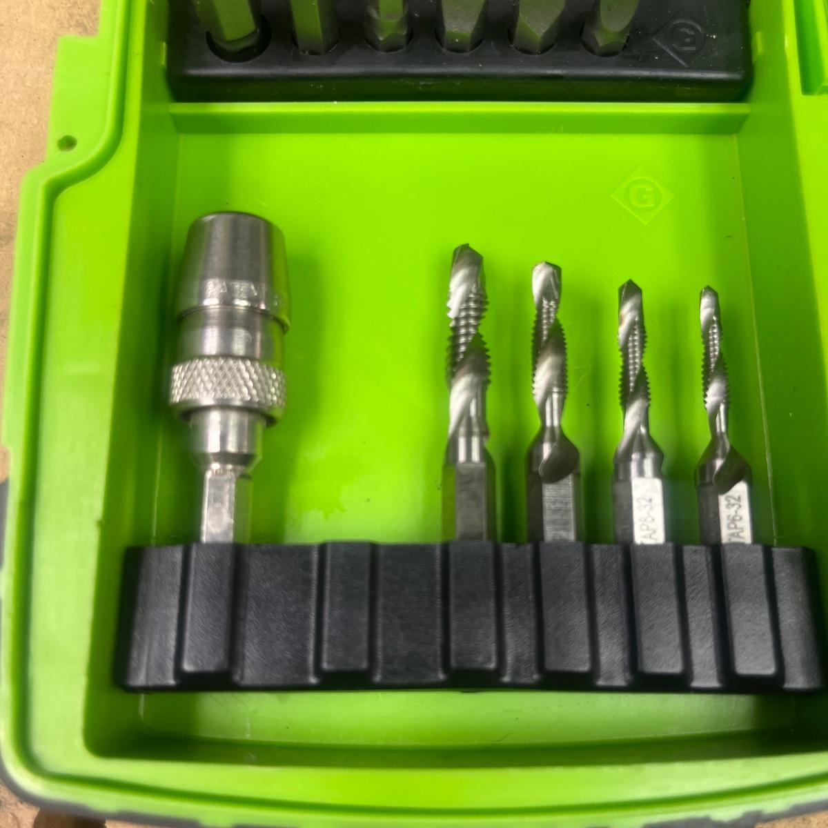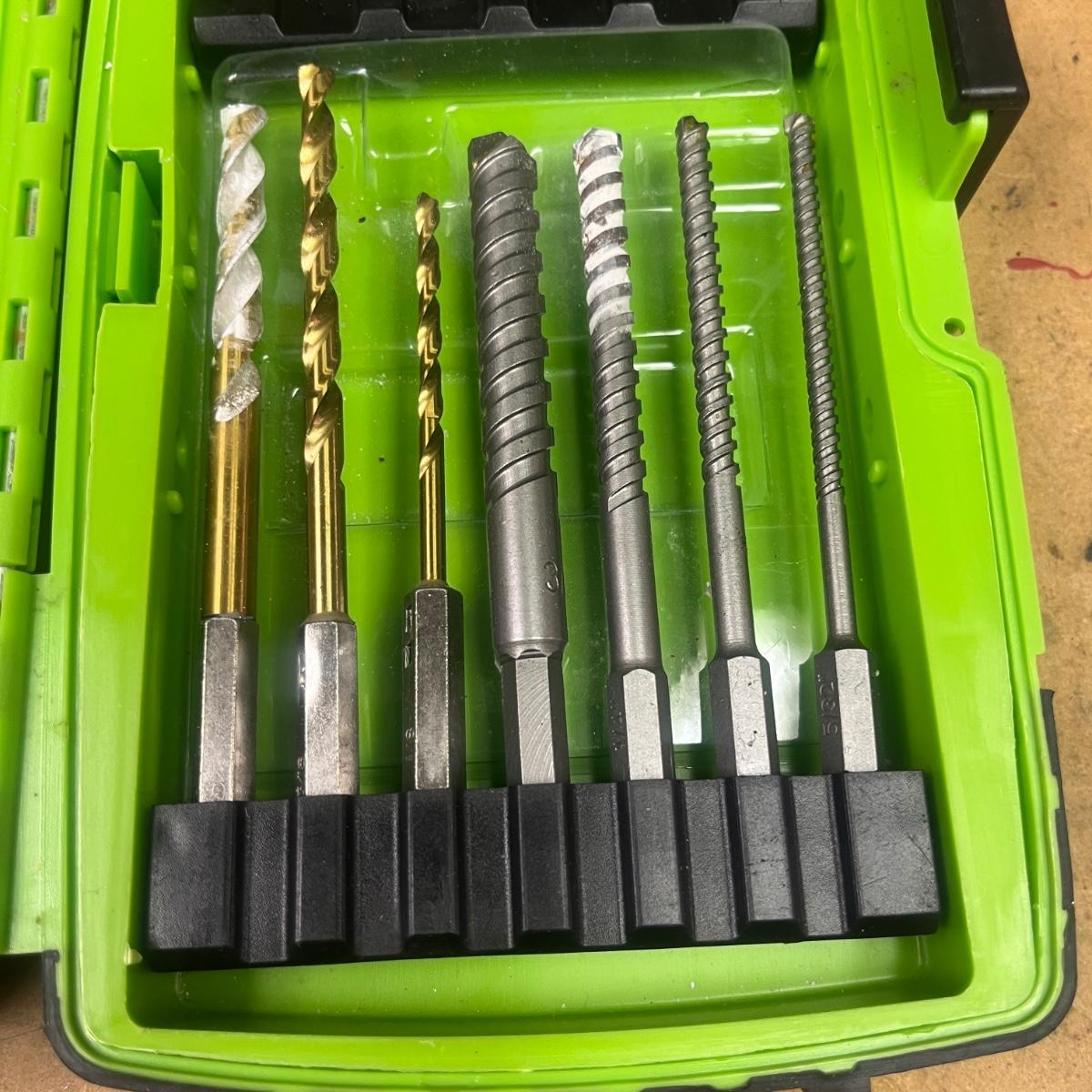 Lot includes a Greenlee 660 quick change carbide hole cutter kit in plastic storage box and a Greenlee Electricians drill driver kit in a plastic storage box. Drill and driver box measures 7.5” x 2” x 5”H. It appears one bit is missing from driver kit, see pictures.