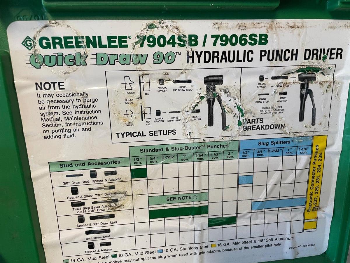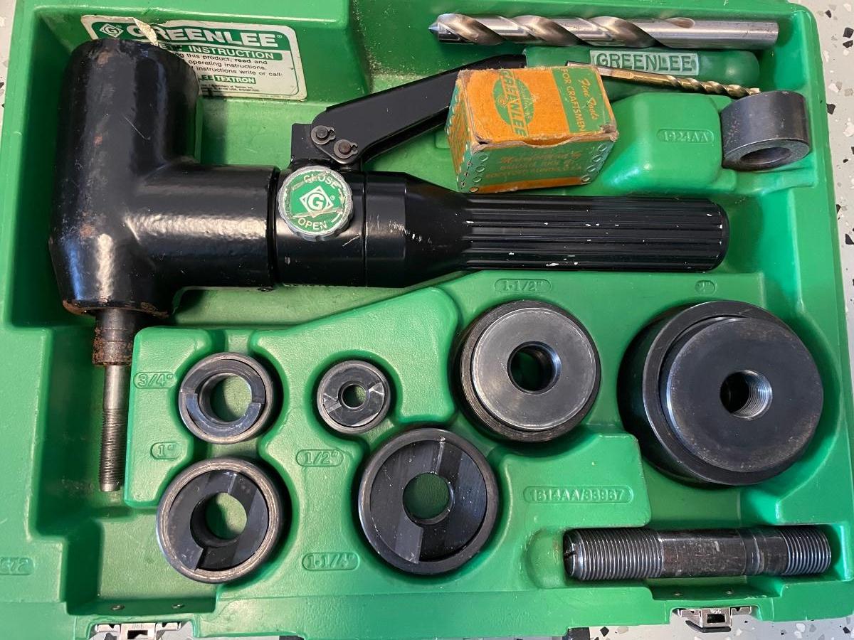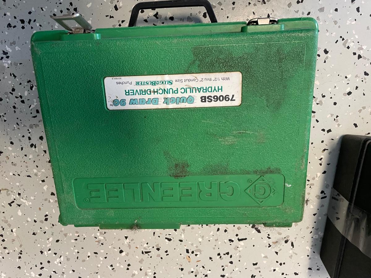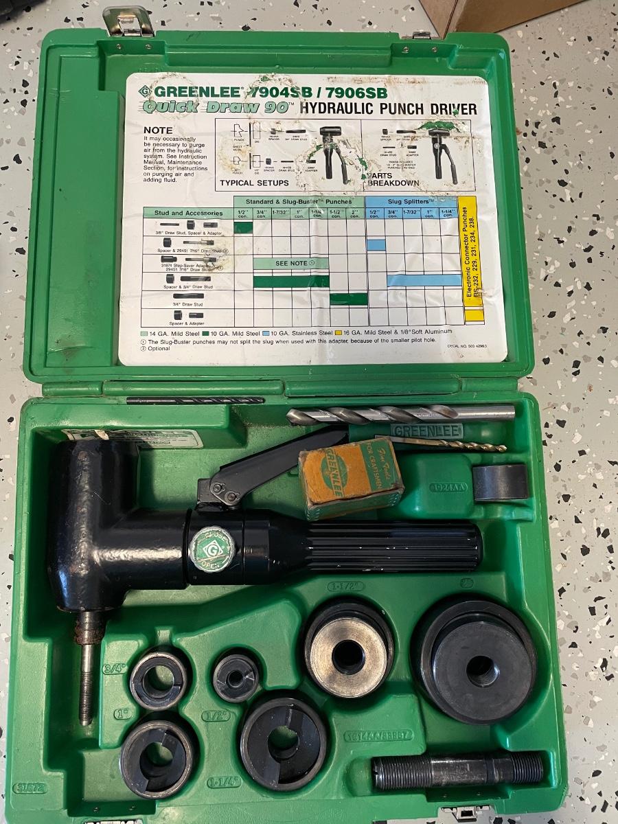 Greenlee Quick Draw 90 hydraulic punch driver with a variety of punch and die sizes, including a case for storage.