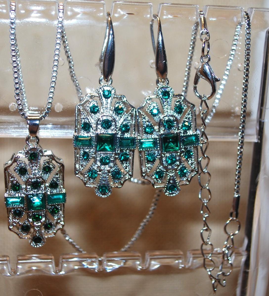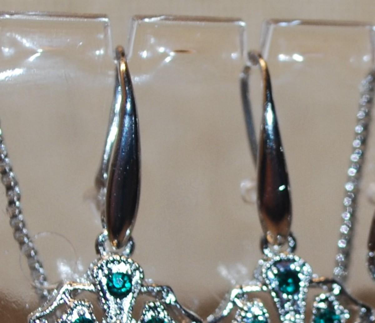 Green/Silver JEWELRY SET Includes Earrings (1½" x ¾") with Wire Hook & PENDANT (1½" x ¾") on a Silver Tone Necklace Chain 18" L