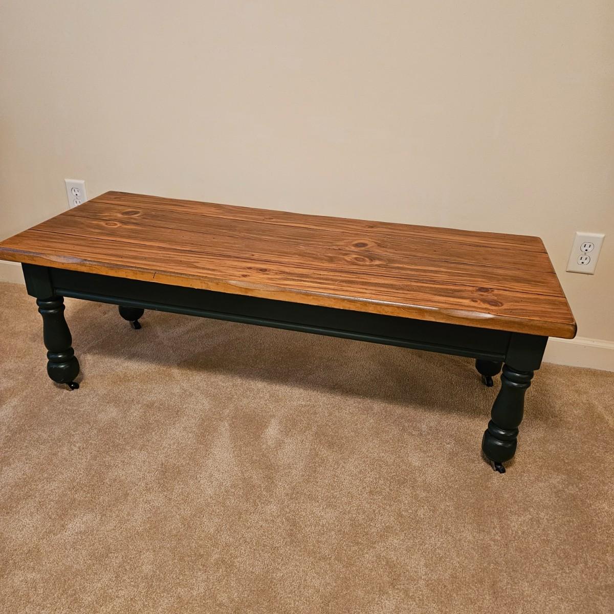 Tan wood top and green base and legs on this low coffee table. Top has decorative grooves and cuts in edges. Table measures 50" x 20" x 17"H. See photos for details. Local pickup only.