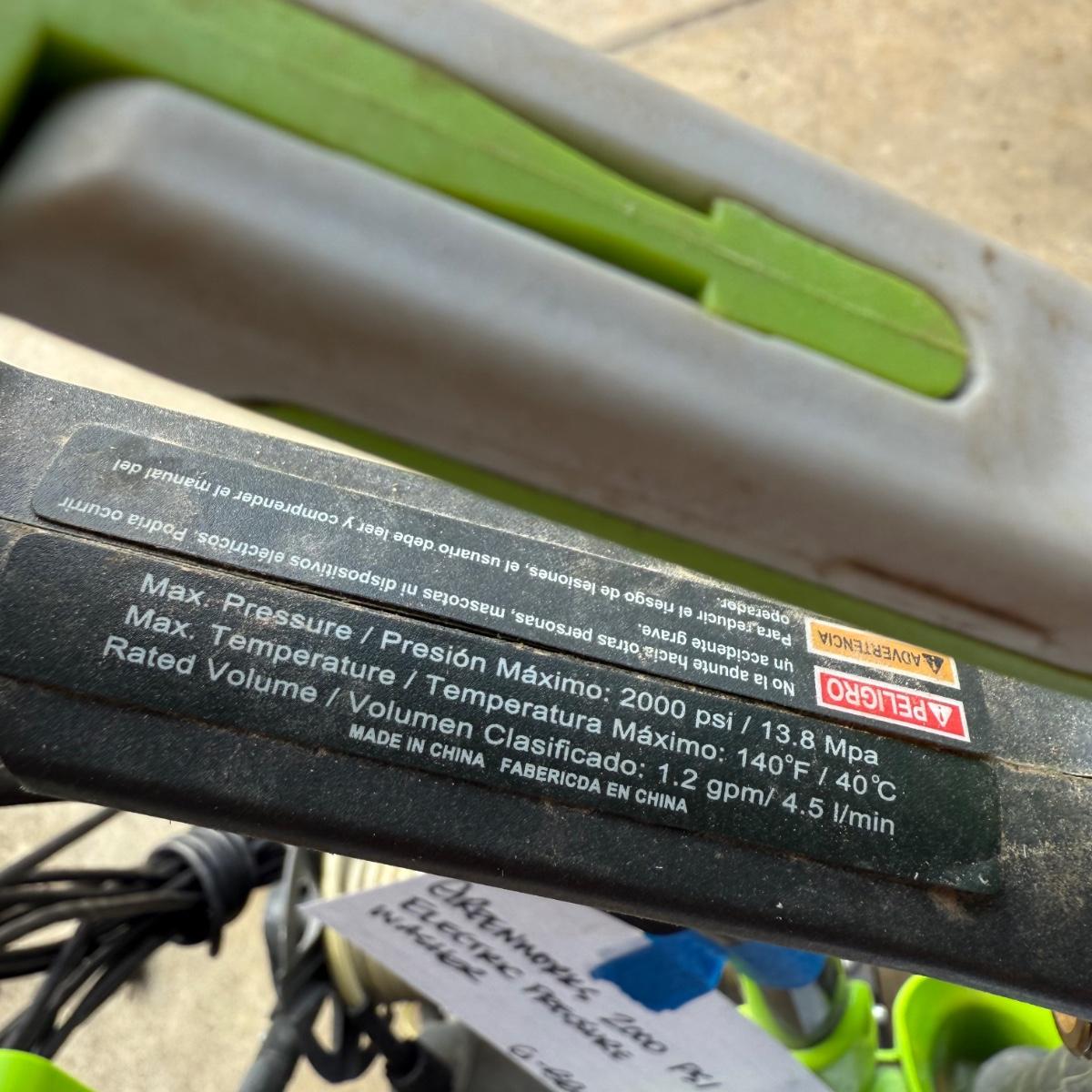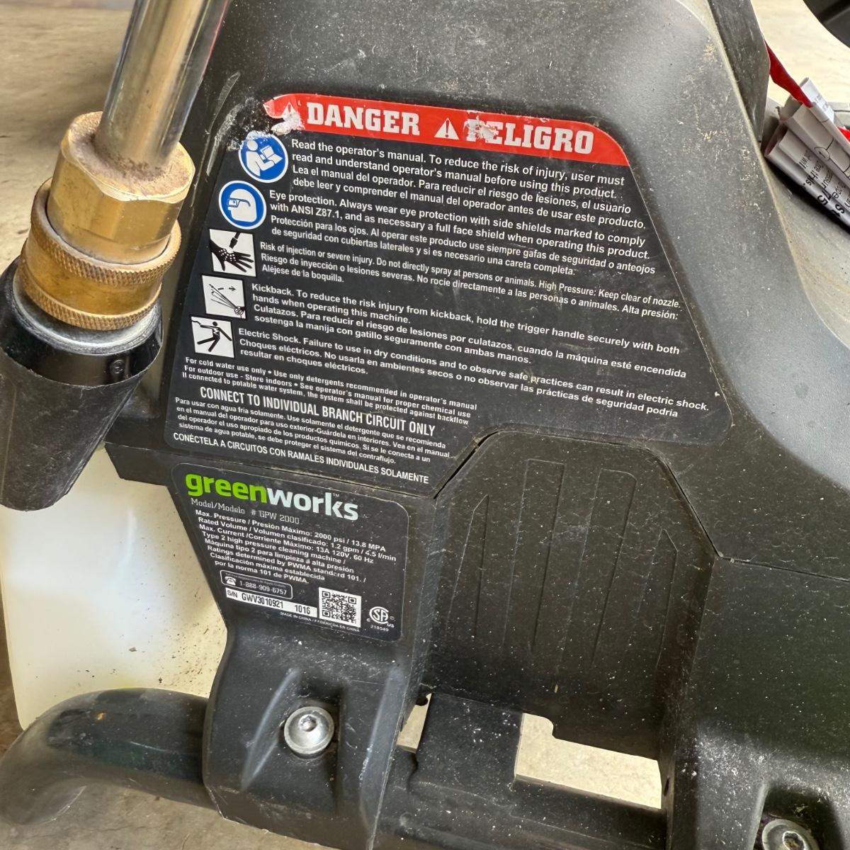 Greenworks brand electric pressure washer with 2000 PSI. Please see photos for details. Item powered on when plugged in. Local Pickup Only