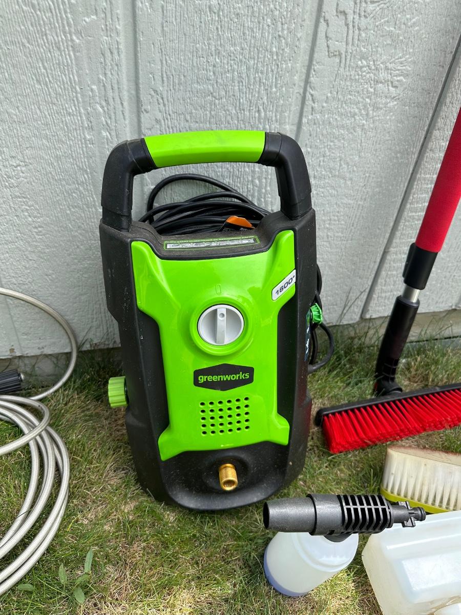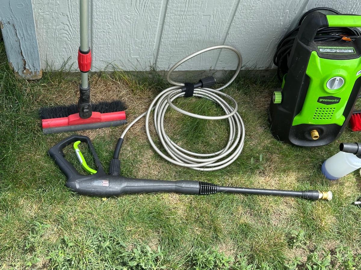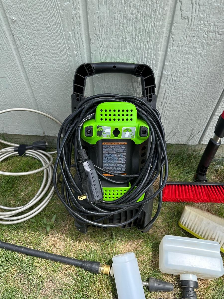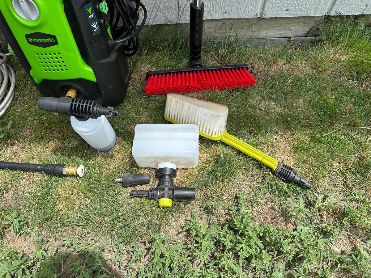 GREENWORKS PRESSURE WASHER WITH VARIOUS SCRUB BRUSHES
