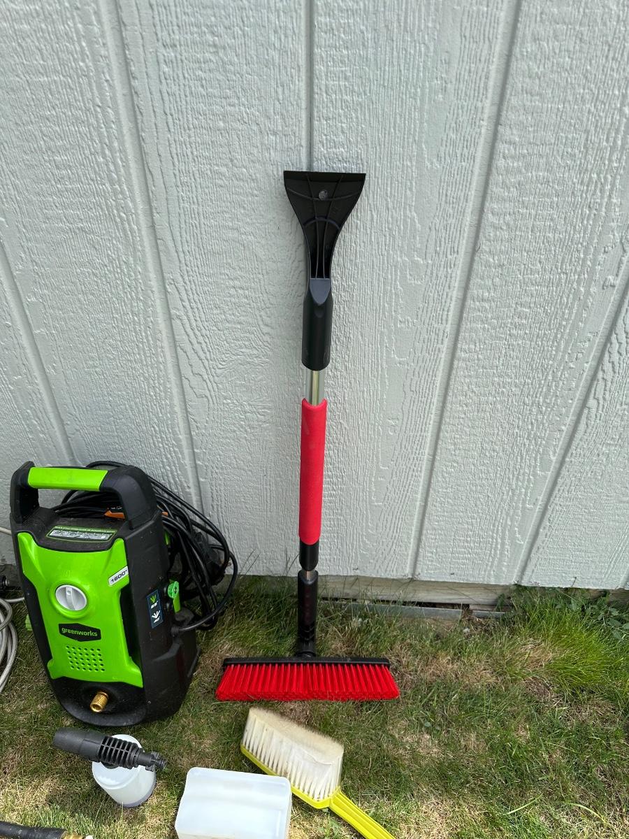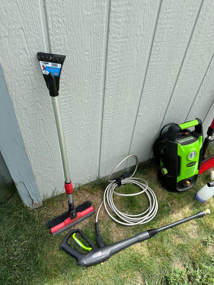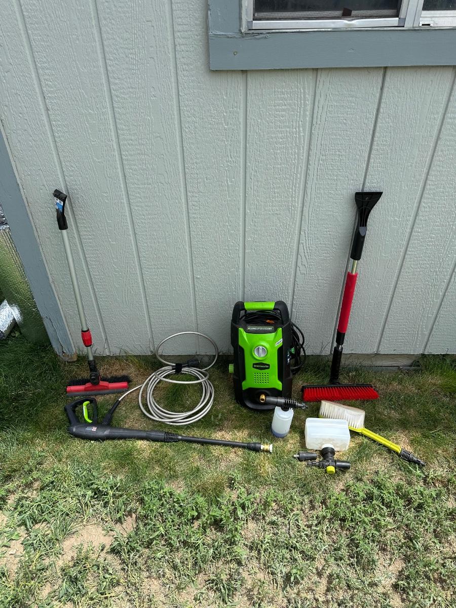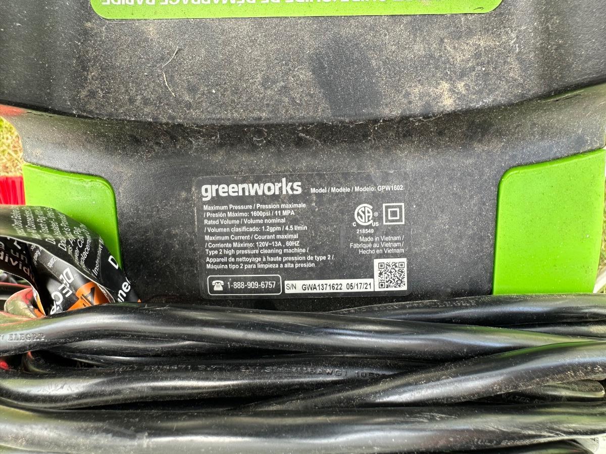 GREENWORKS PRESSURE WASHER WITH VARIOUS SCRUB BRUSHES