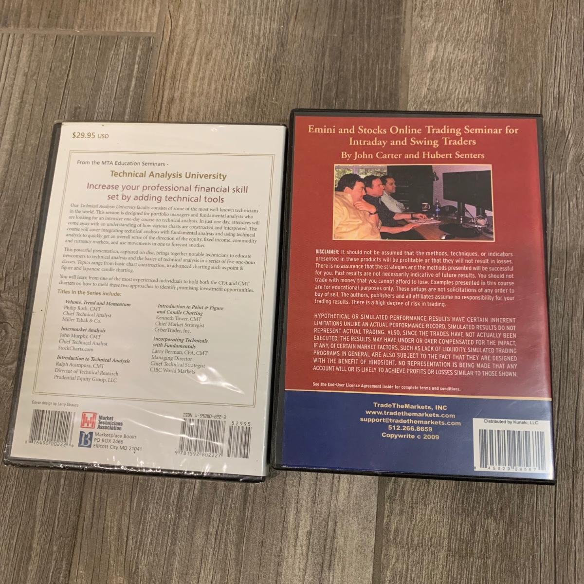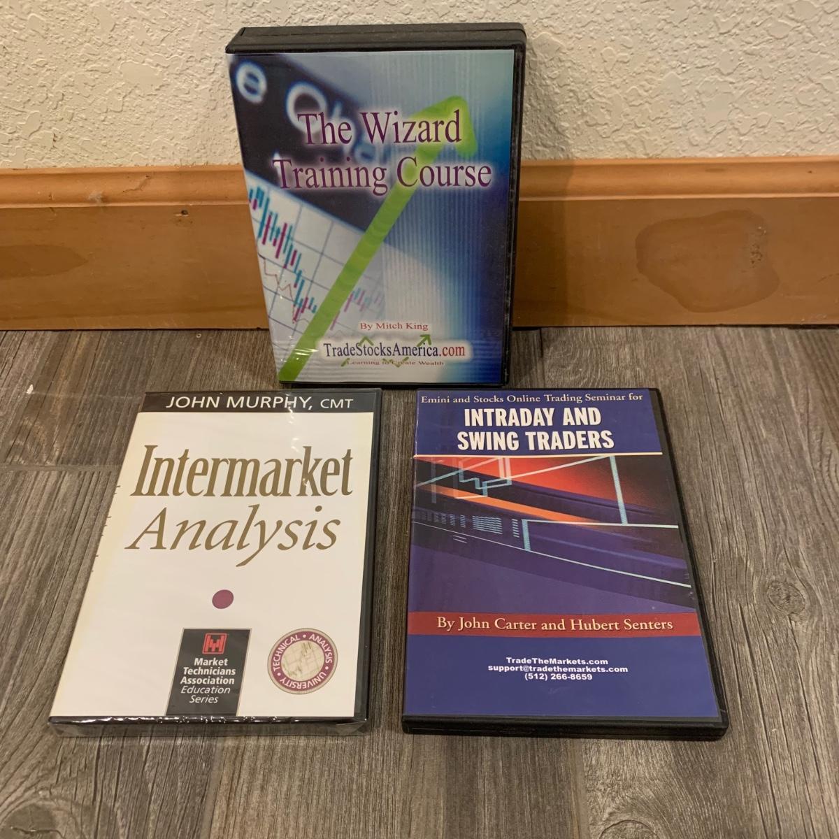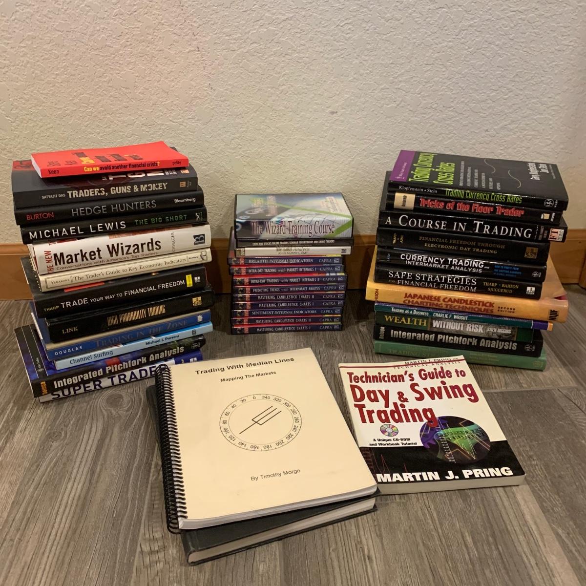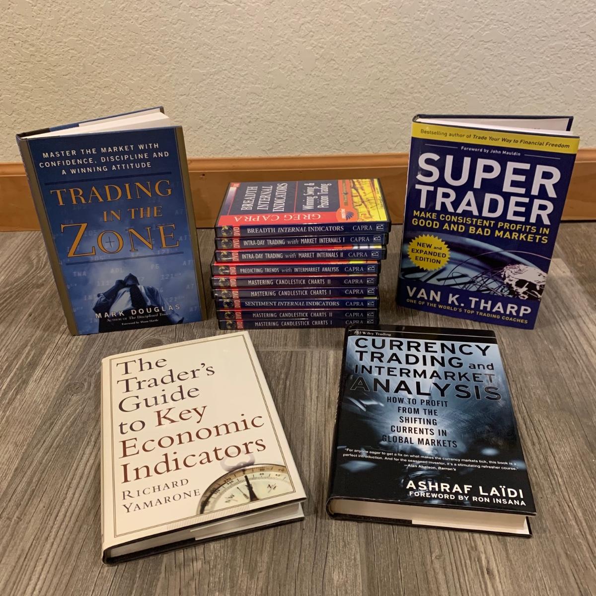 A set of nine Greg Capra Trade Secrets DVDs, plus some CD-ROMs and approximately 25 trading and economy related books. Everything appears to be in good condition.