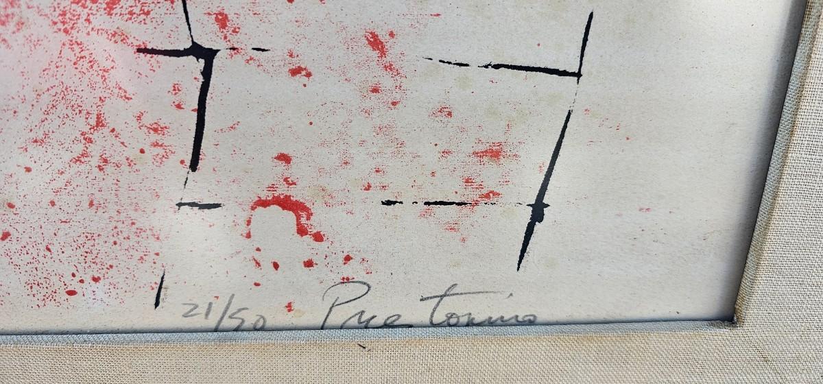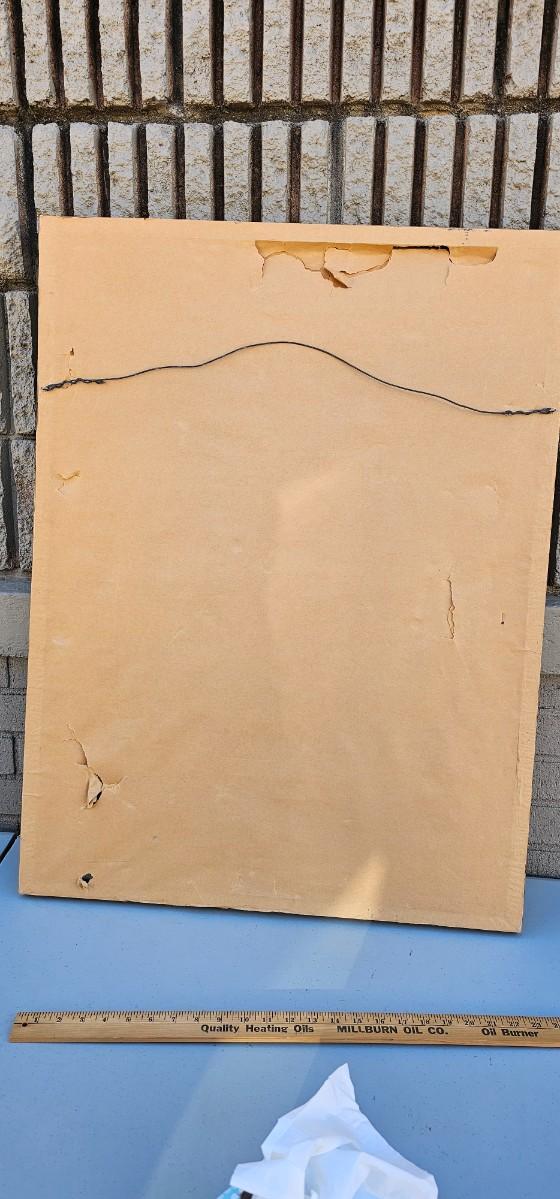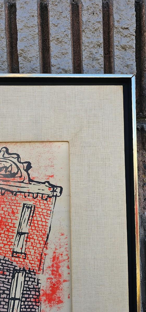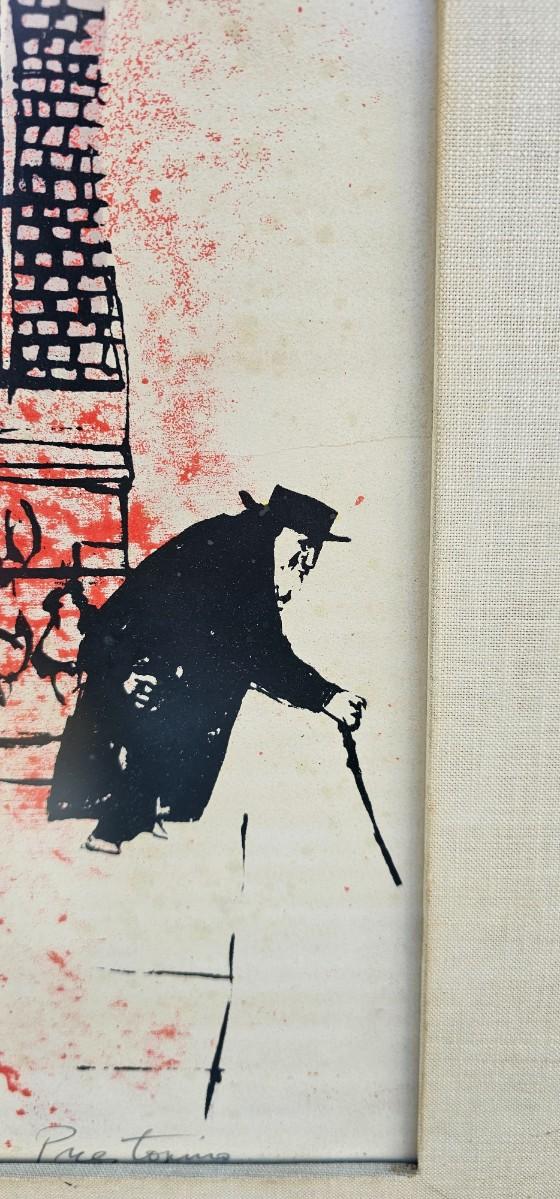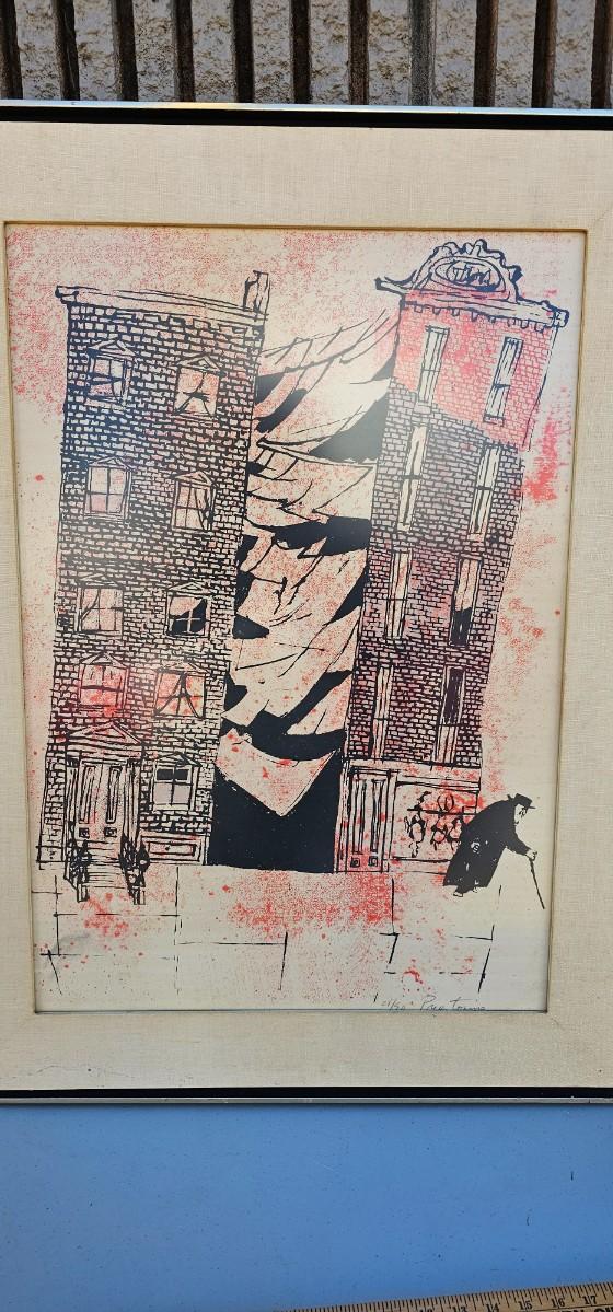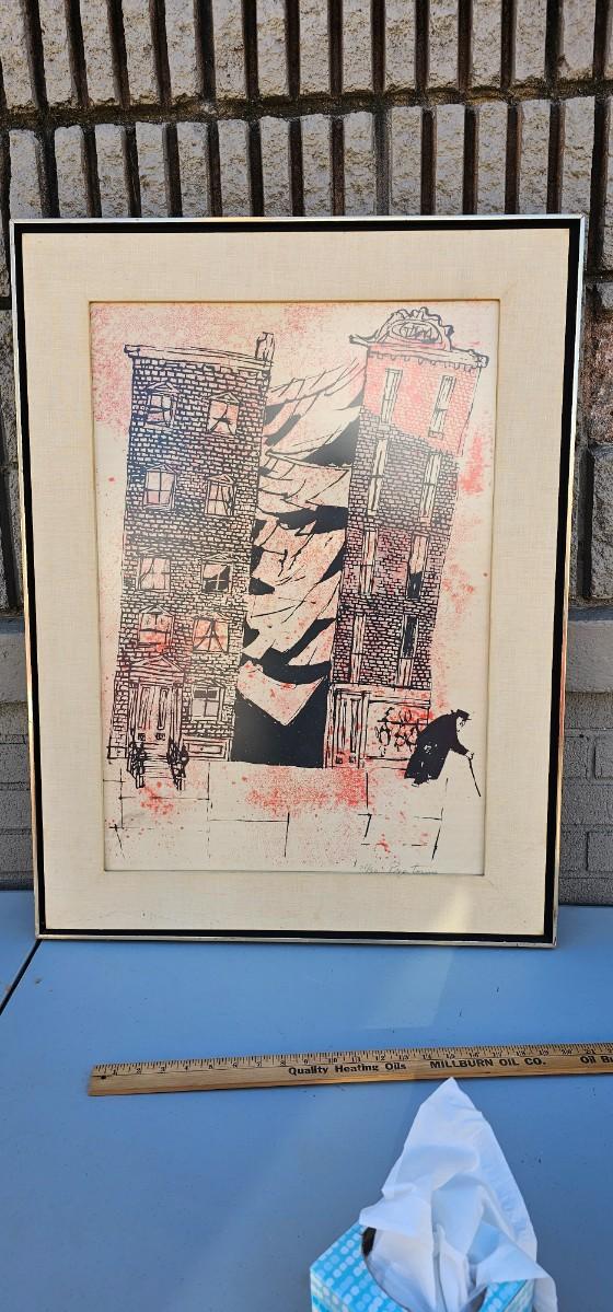 "Sunlit Tenements," woodblock print on paper, depicting an old Jewish man walking in front of tenement buildings flying laundry, pencil-numbered "21/50." Image: 28.75" H X 20" W; frame: 39" X 30".