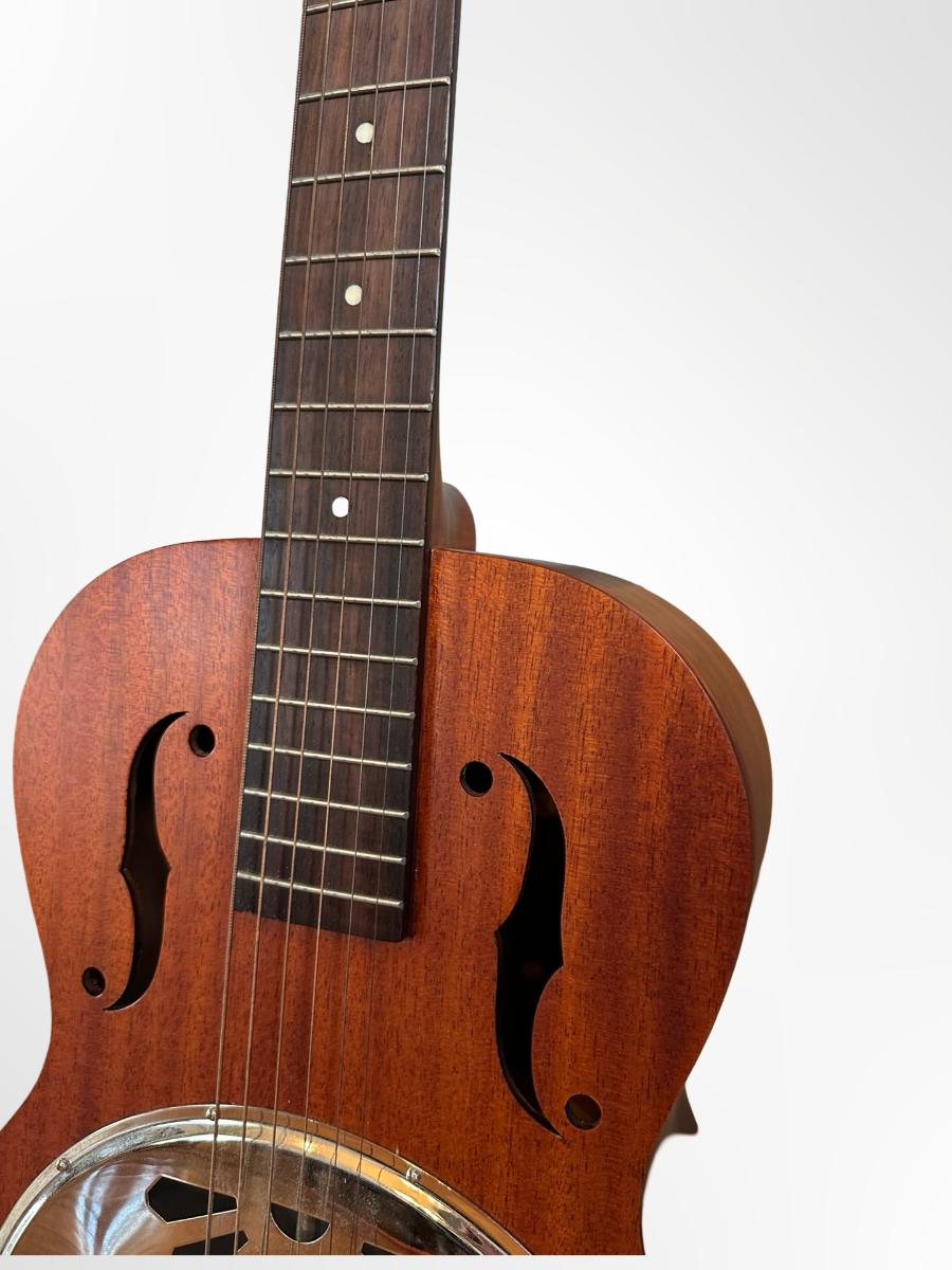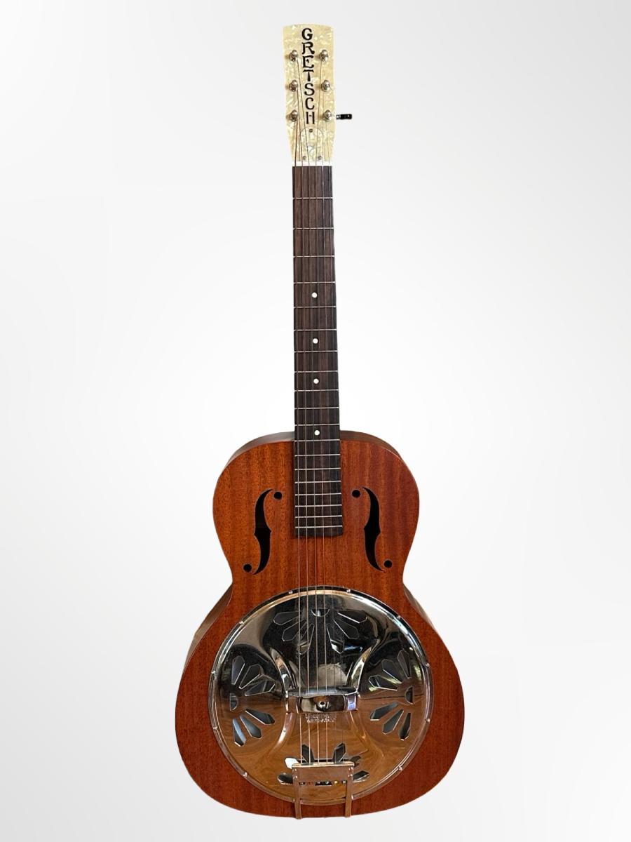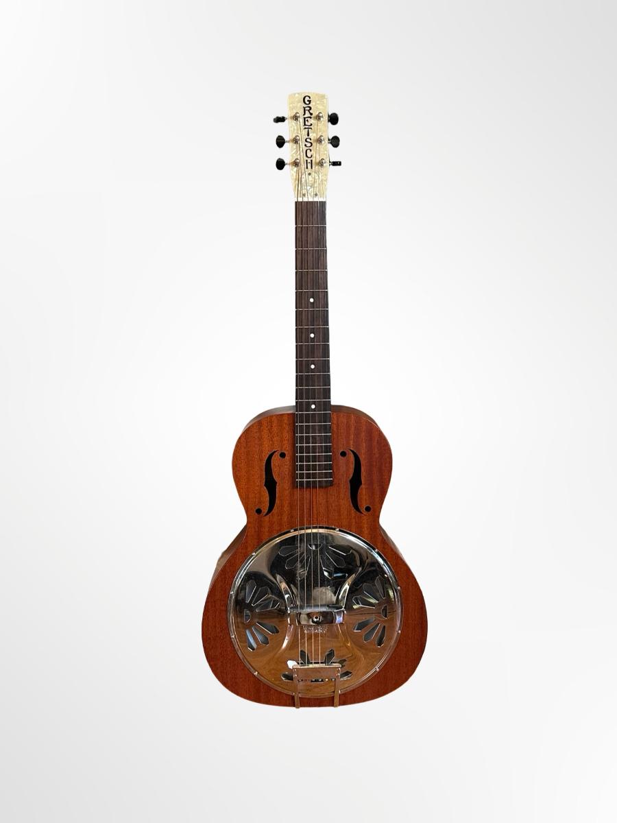 Gretsch G9200 Boxcar acoustic resonator guitar with mahogany body and nickel resonator cone. Features f-holes, open-gear tuners, and a warm, bluesy tone that’s great for slide or fingerstyle playing. Handcrafted in China, model CAXR203280. Excellent overall condition.