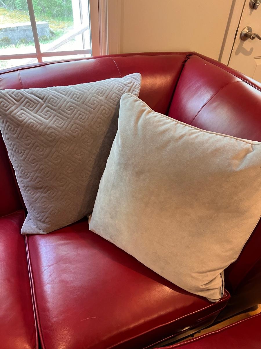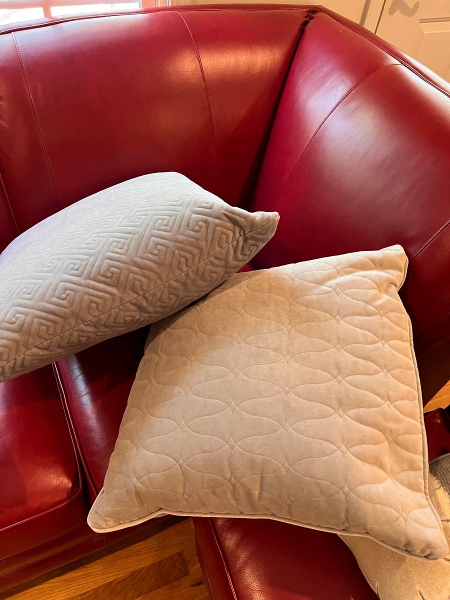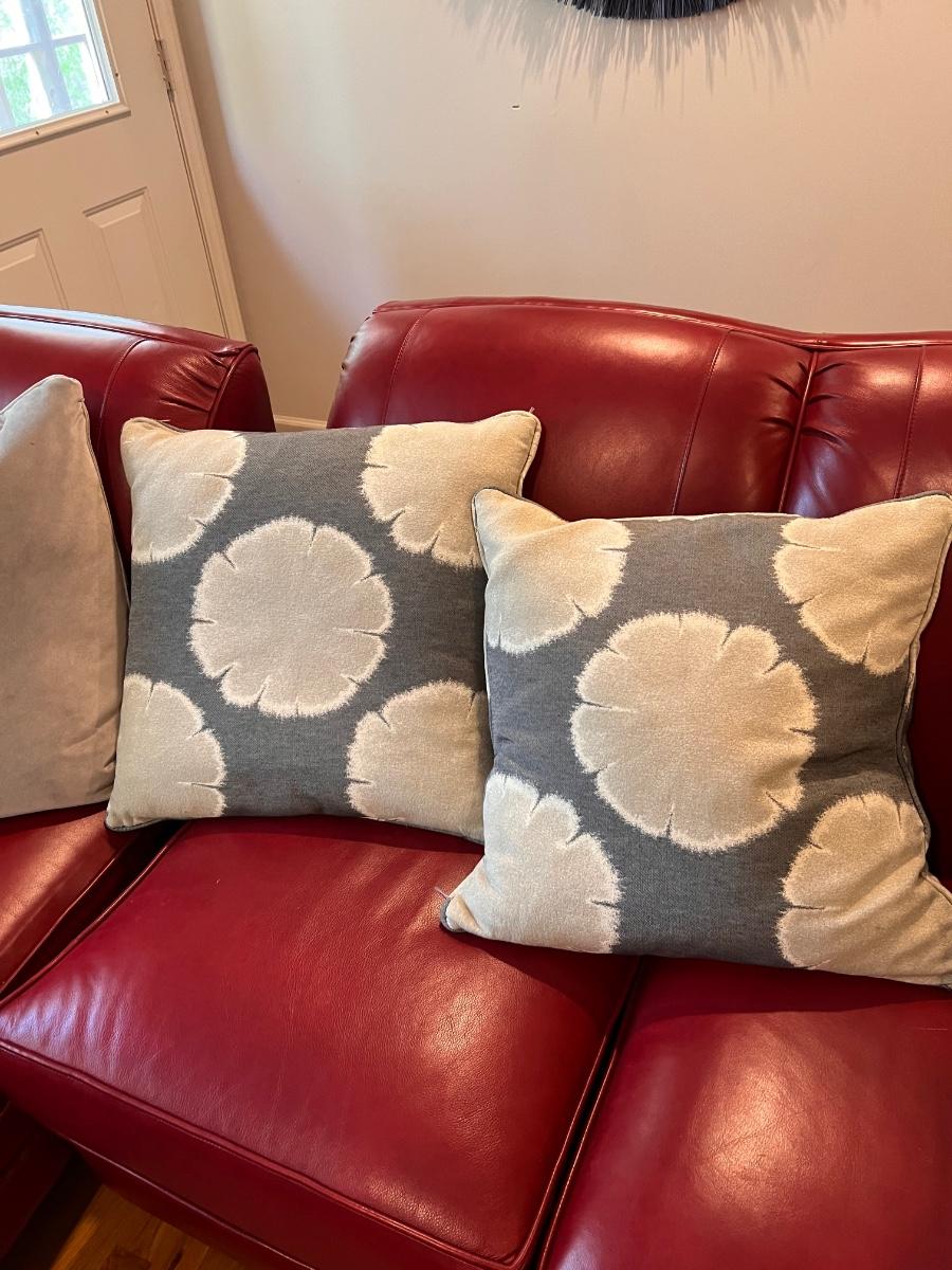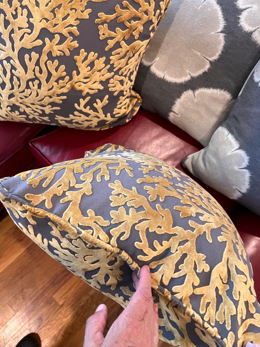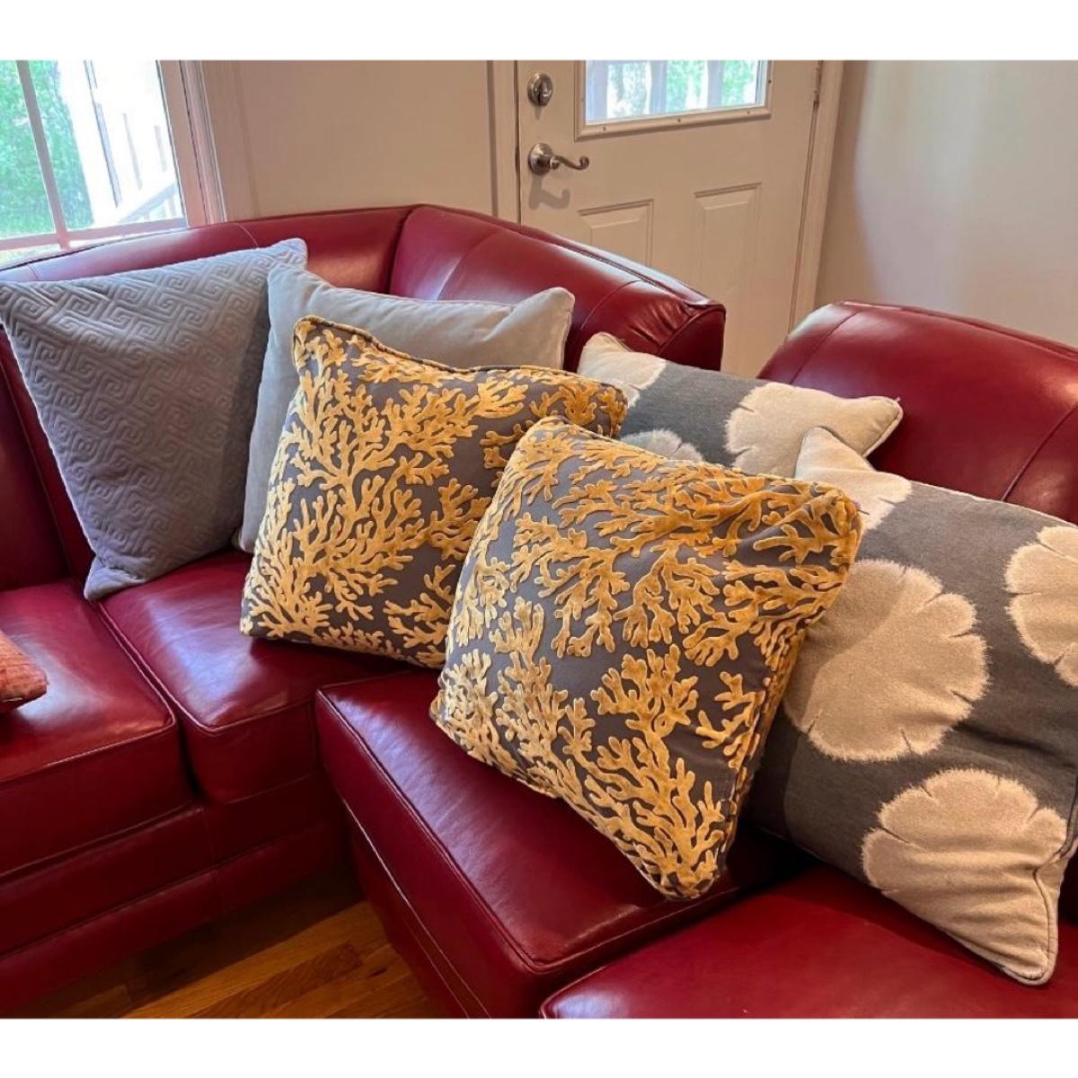 Grey/gold cushions measure 18” square.