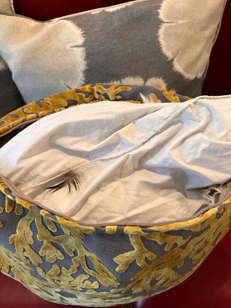 Six attractive accent cushions in total that includes two sets of matching pairs. All appear to have feather filled pillows. All are very clean. No labels found.